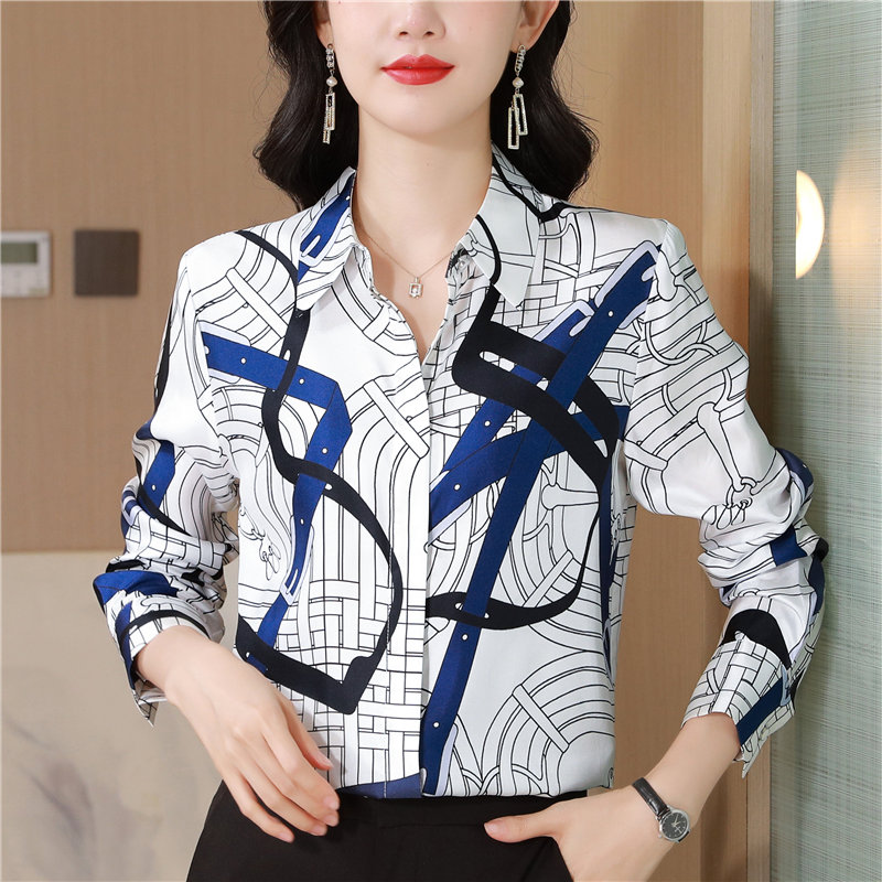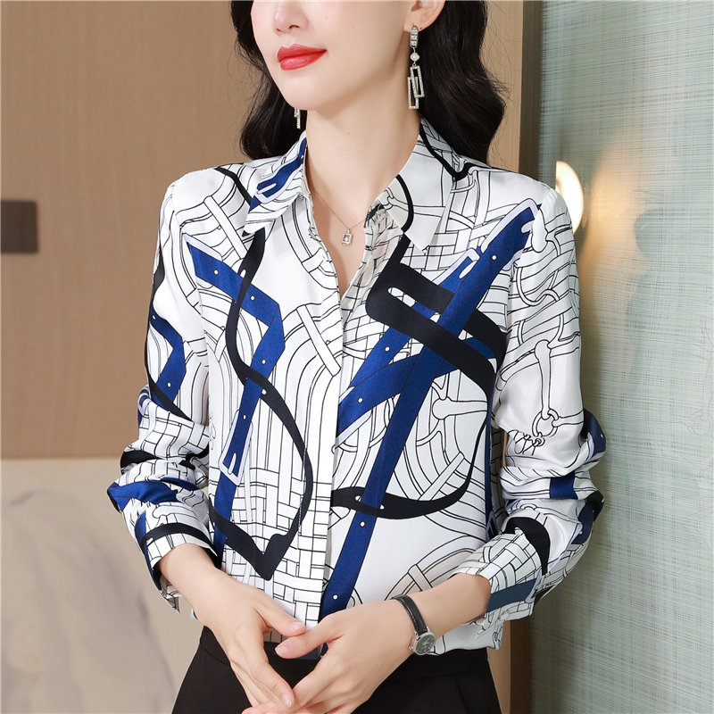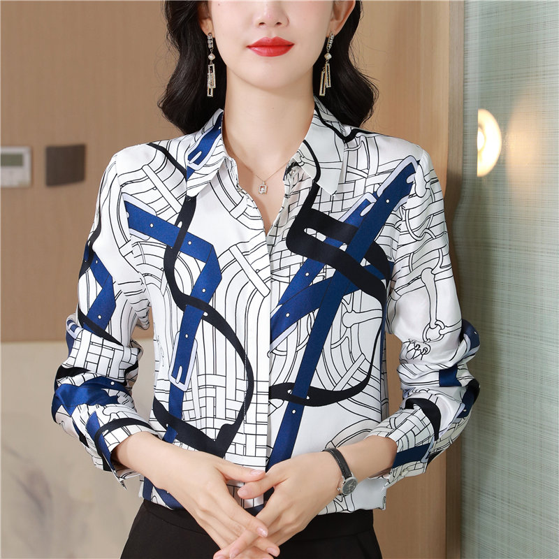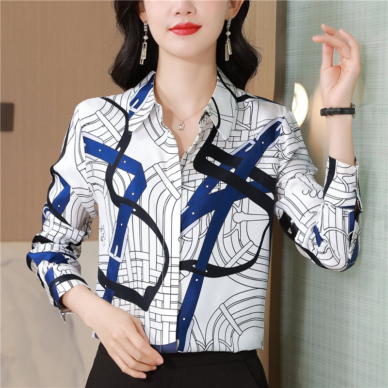 FA47647# 柜上设计师款琎口真丝斜纹绸皮带扣抽象印花翻领长袖衬衫上衣女 服裝批發女裝批發服飾貨源