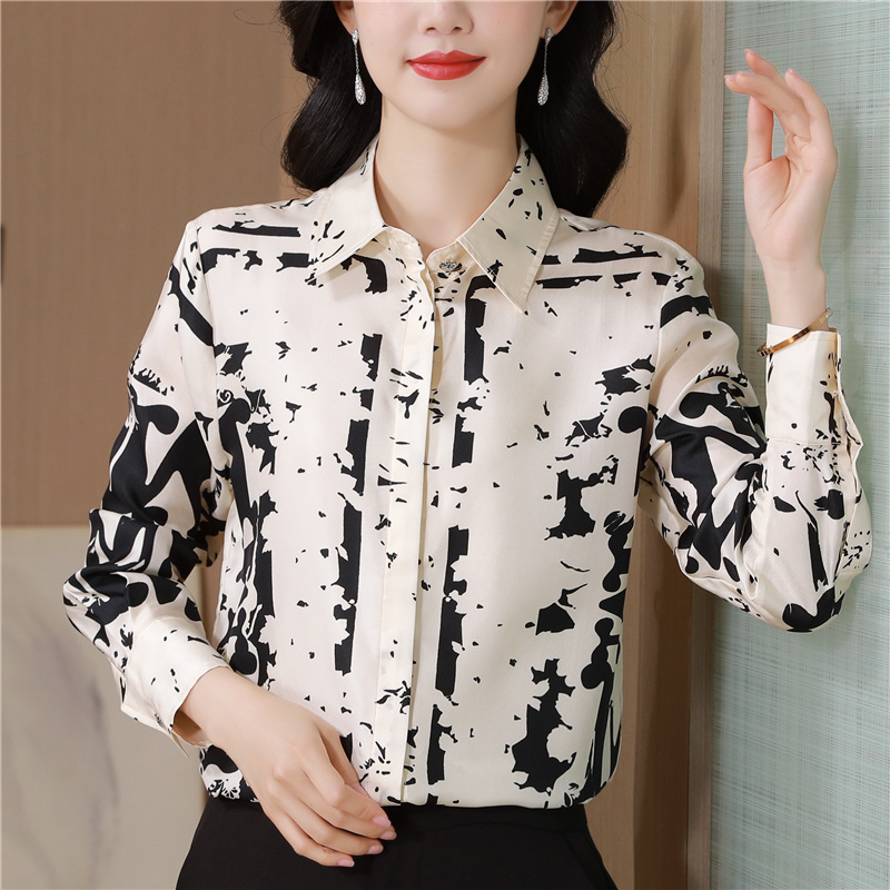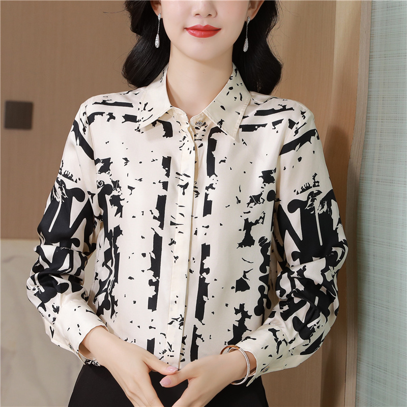 FA47649# 贵气袭人100%桑蚕丝字母泼墨斑驳点缀印花斜纹理宽松长袖衬衫 服裝批發女裝批發服飾貨源