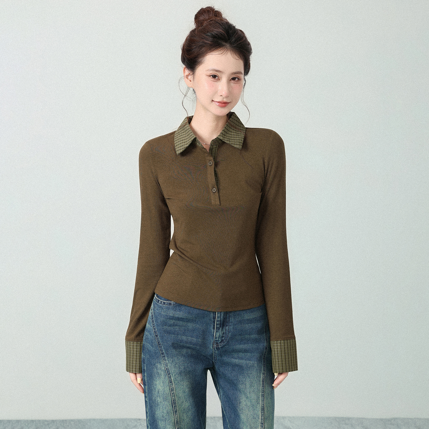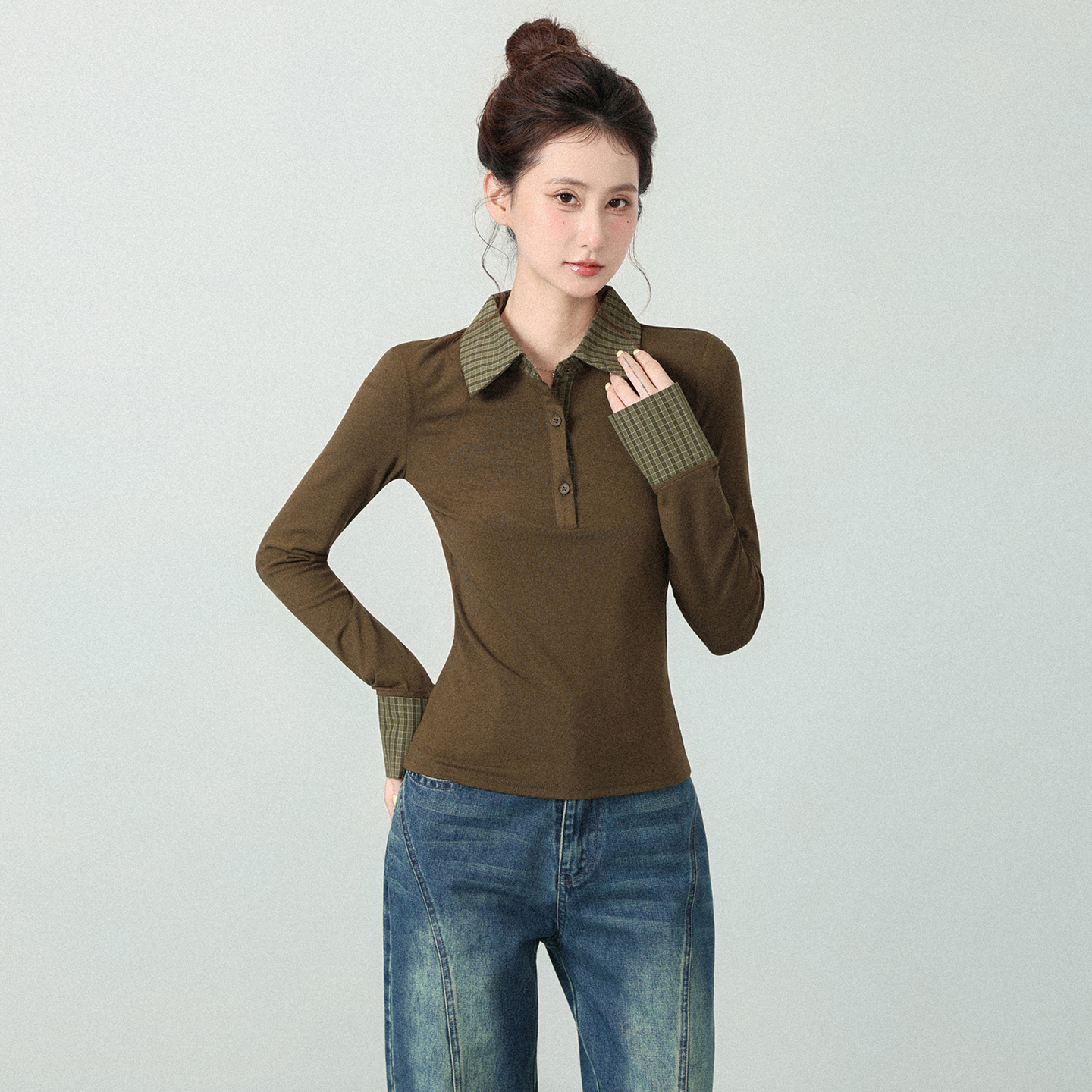 FA47661# 韩系拼接假两件格纹POLO领长袖T恤女秋季收腰打底衫上衣 服裝批發女裝批發服飾貨源