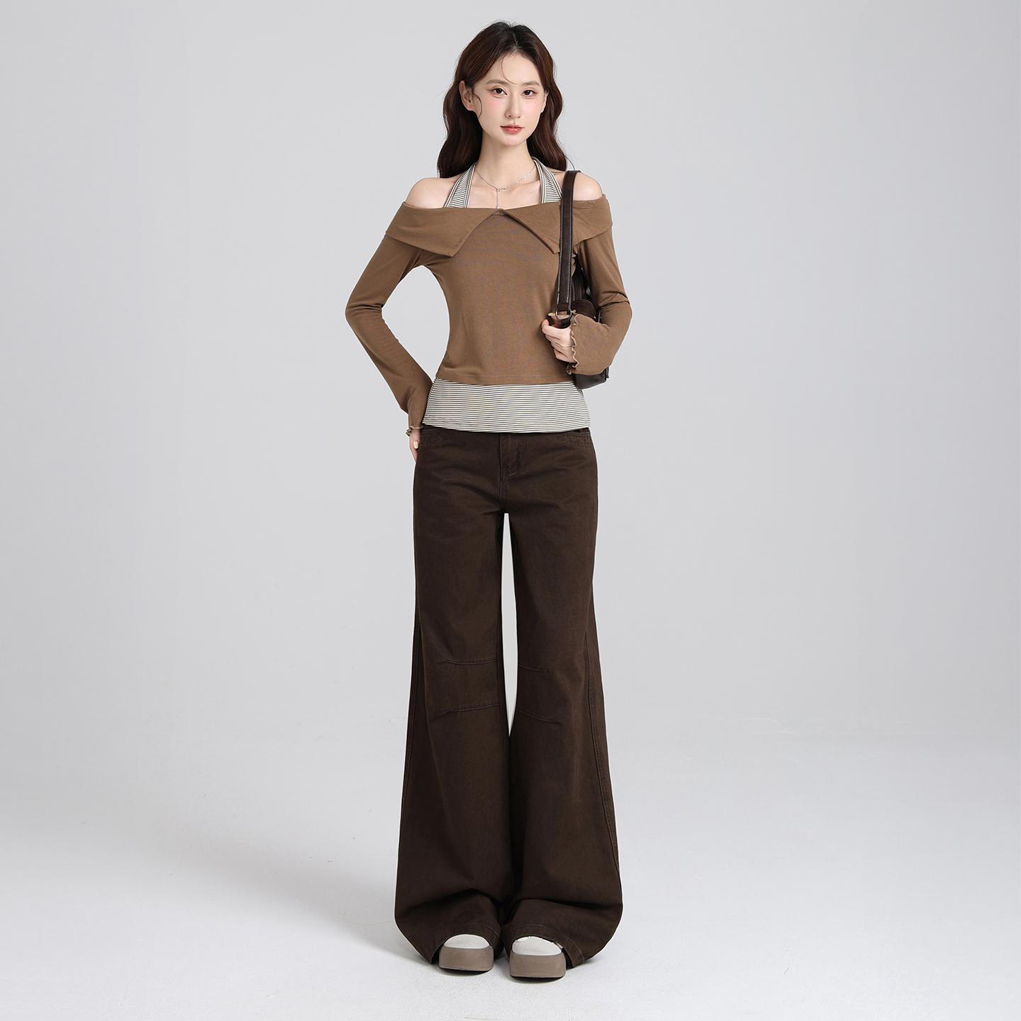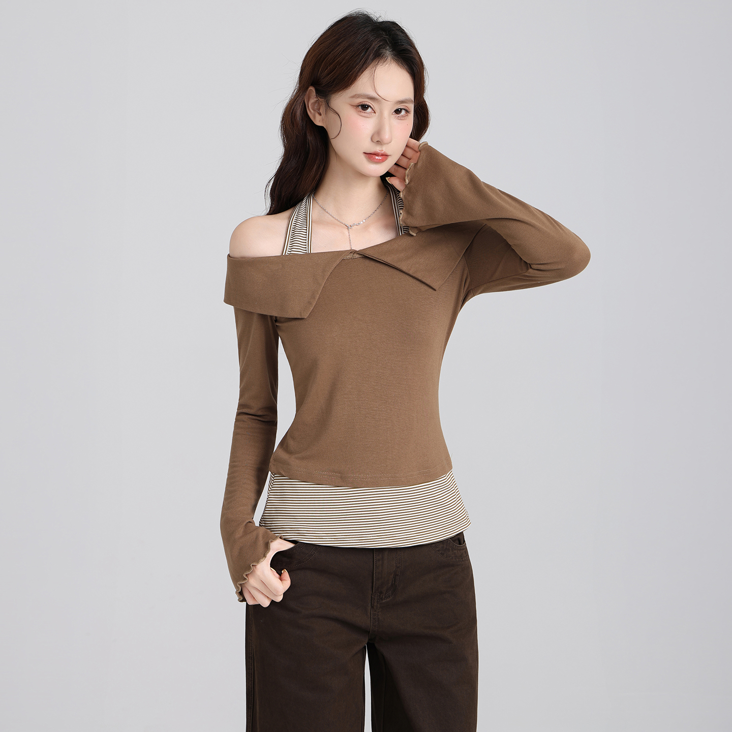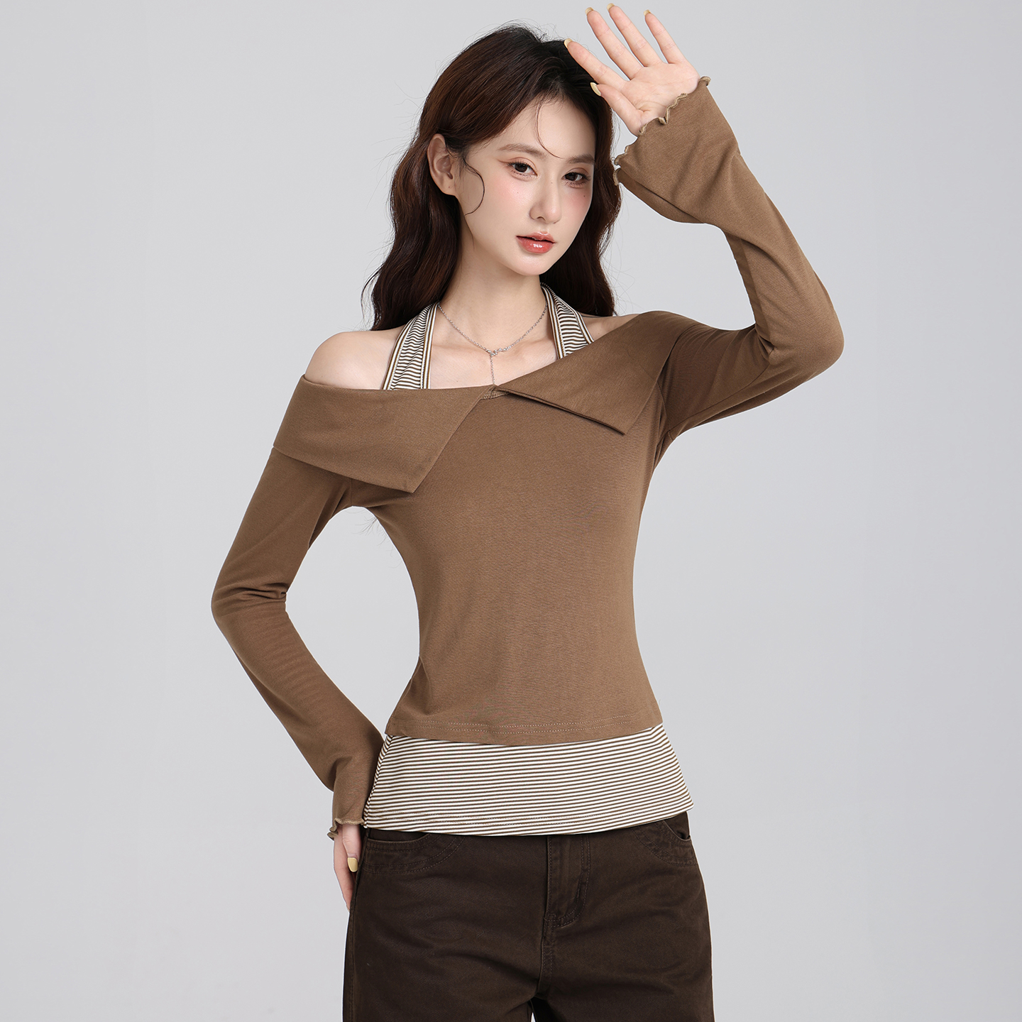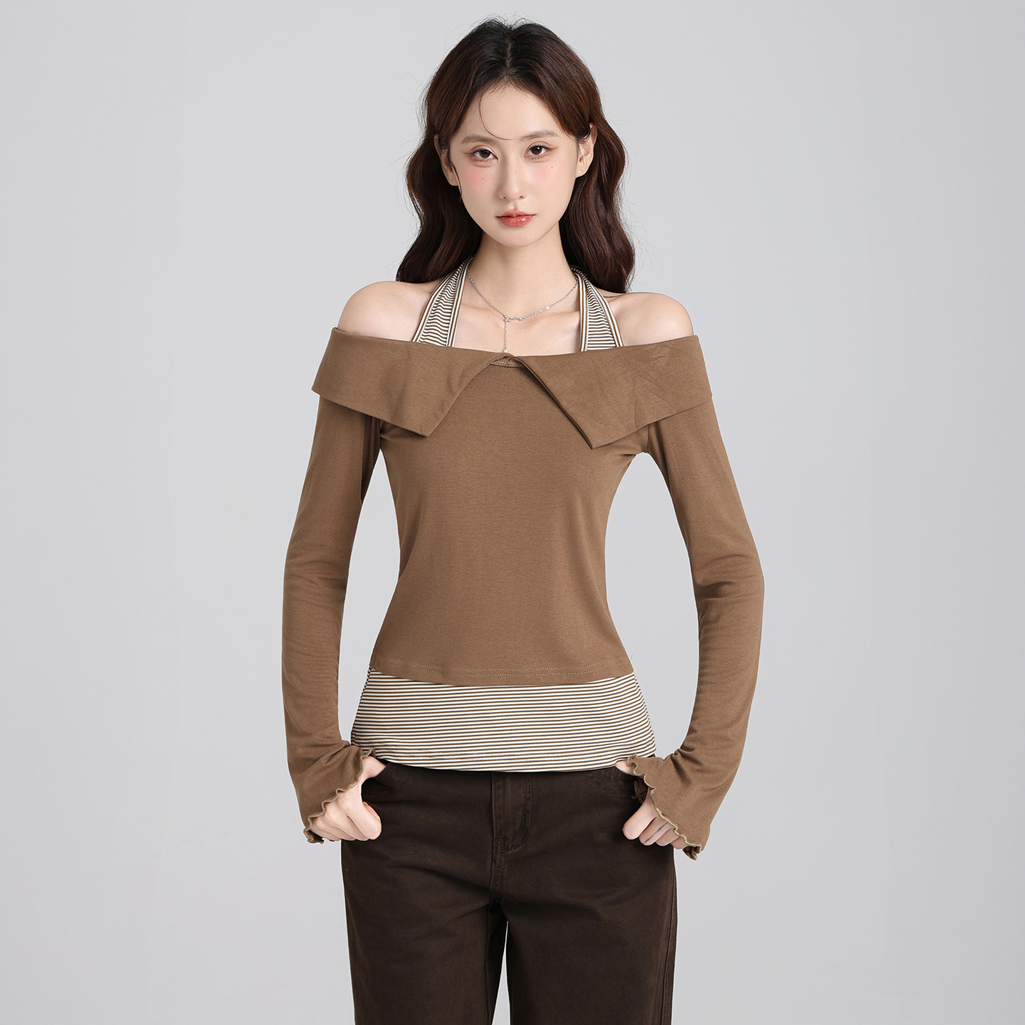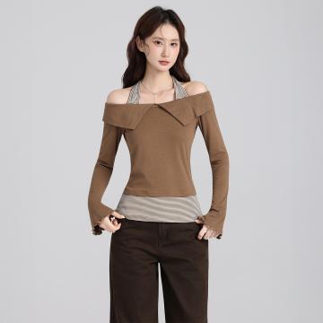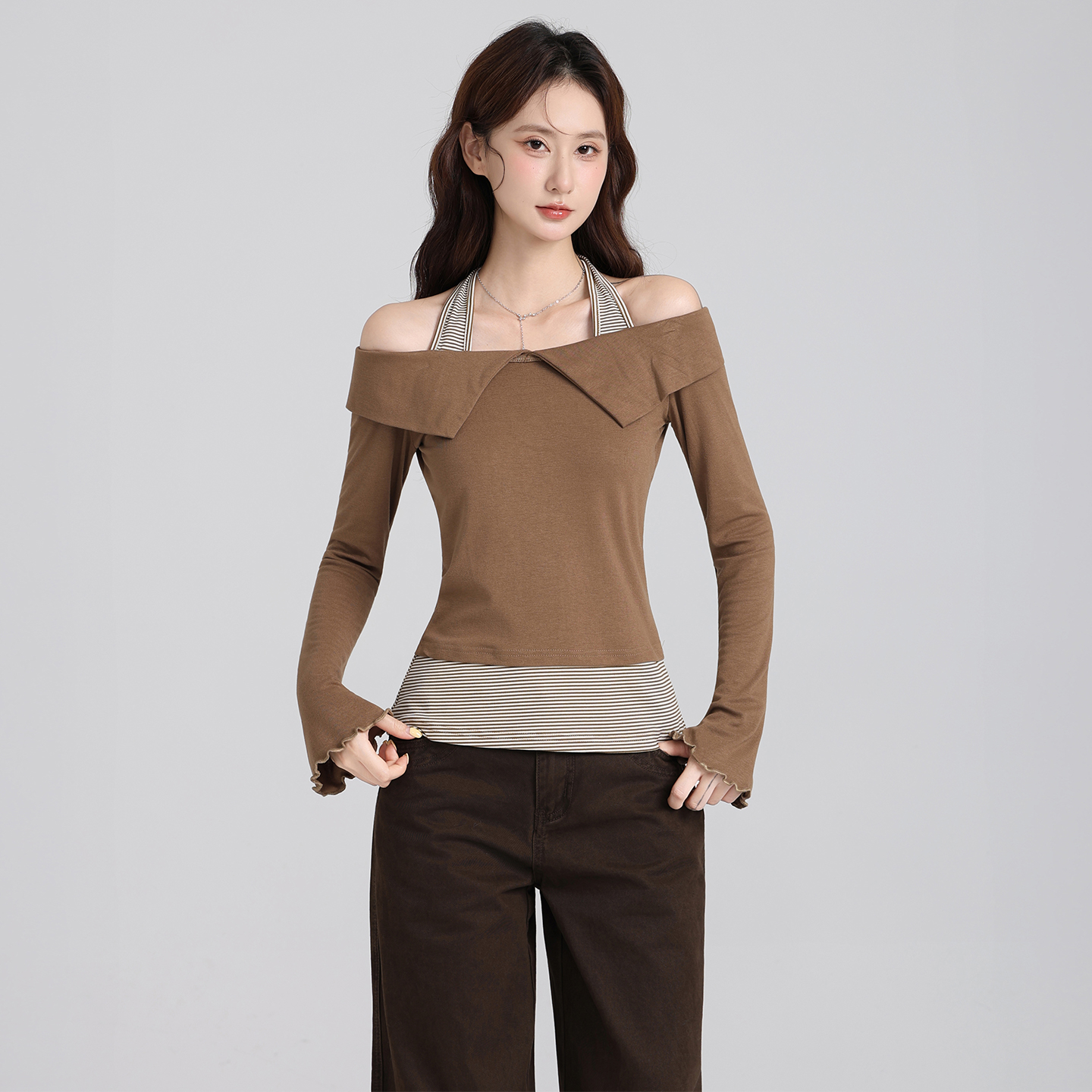 FA47664# 一字肩假两件收腰喇叭袖T恤女秋设计感休闲显瘦露肩上衣 服裝批發女裝批發服飾貨源