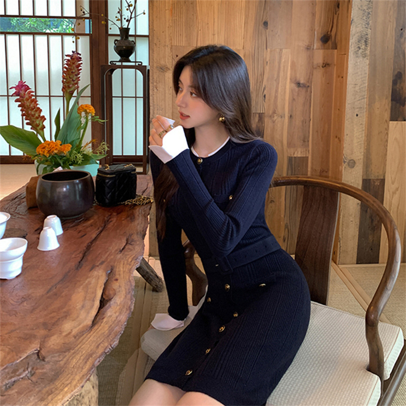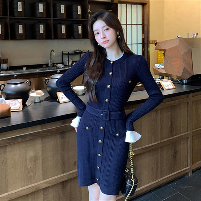 FA47675# 法式温柔风气质千金风喇叭袖针织连衣裙女秋冬收腰小香排扣短裙 服裝批發女裝批發服飾貨源