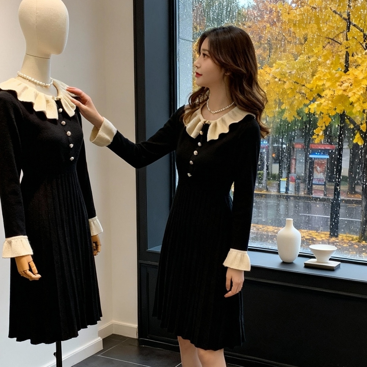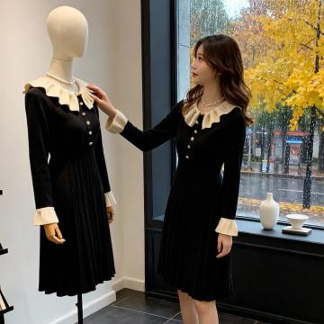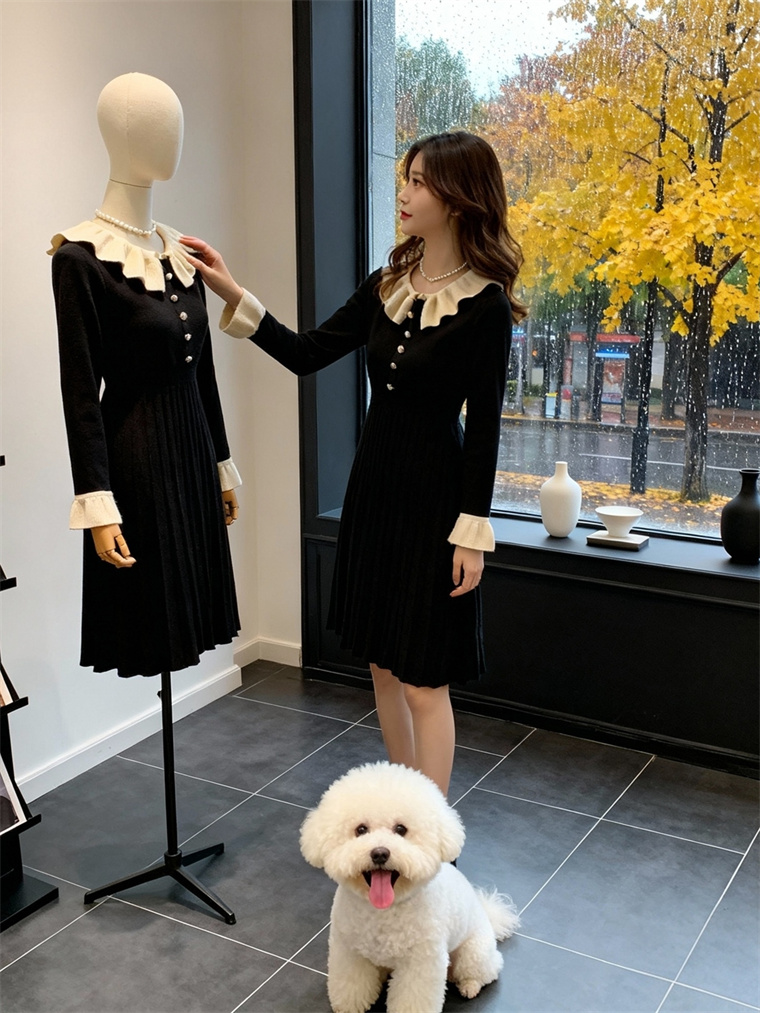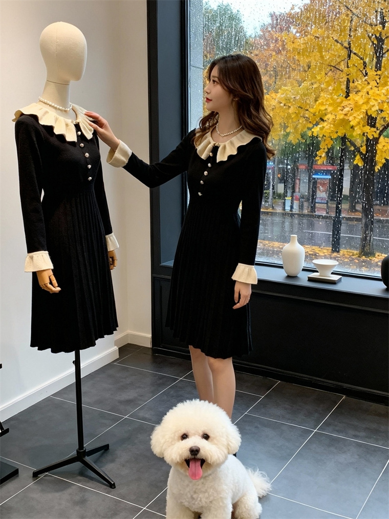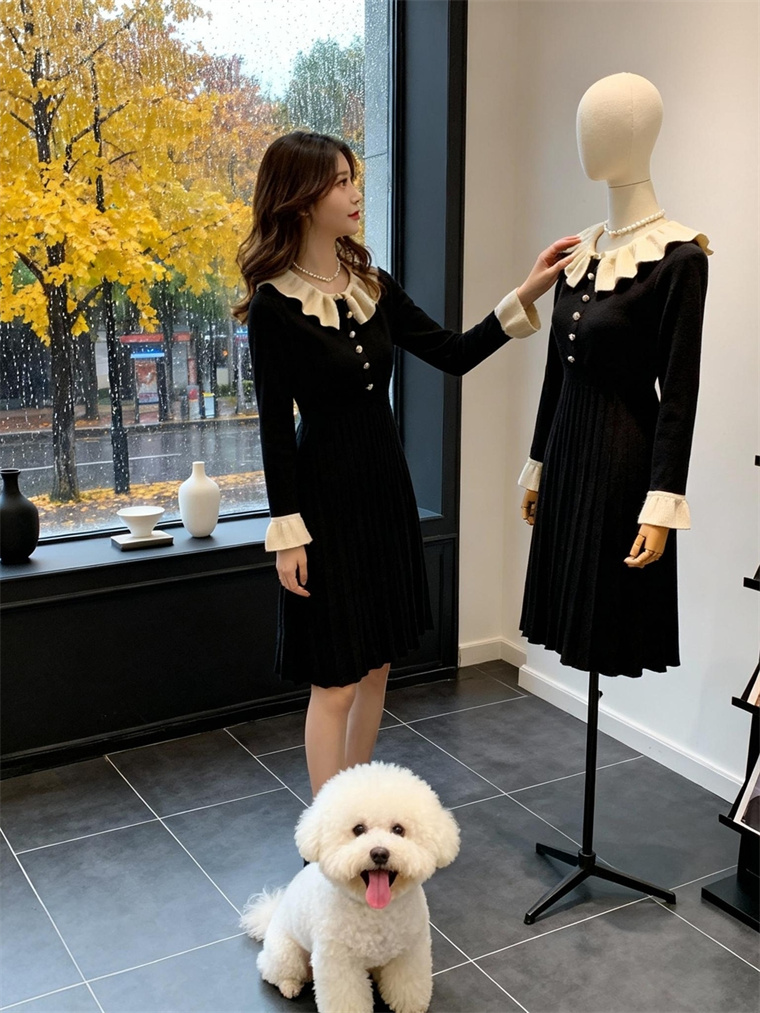FA47679# 法式千金风娃娃领连衣裙女秋冬季显瘦赫本风加厚高级感小黑裙 服裝批發女裝批發服飾貨源