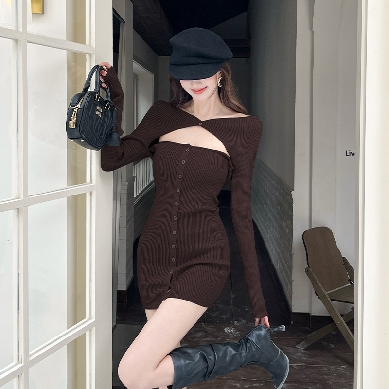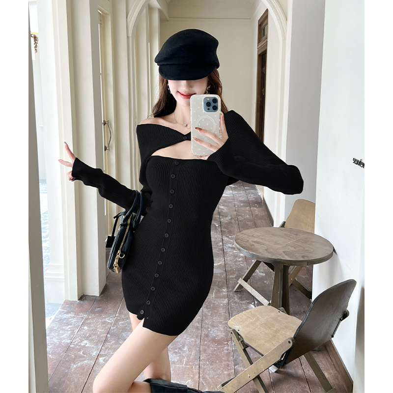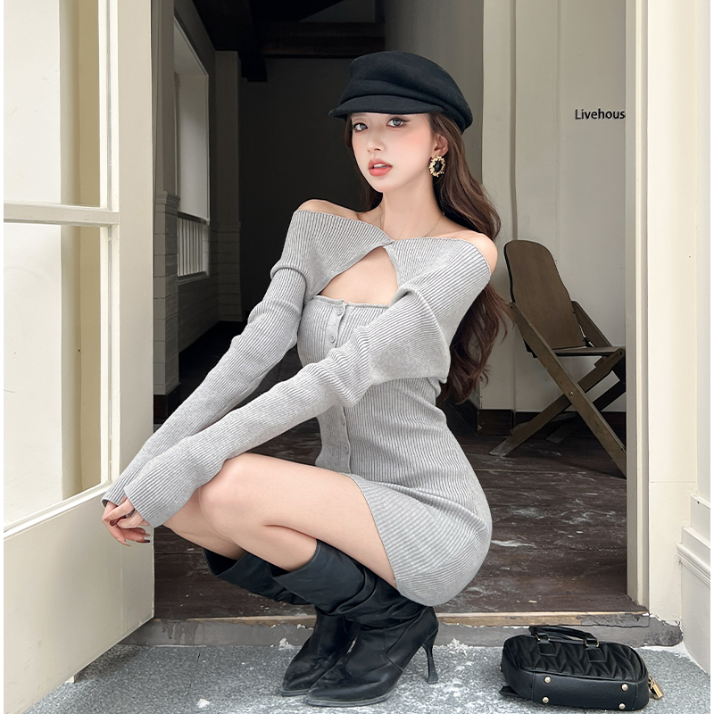 FA47784# 一字肩长袖针织连衣裙女秋冬新款收腰辣妹包臀修身显瘦短裙纯欲风 服裝批發女裝批發服飾貨源