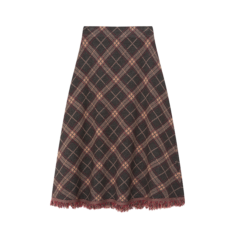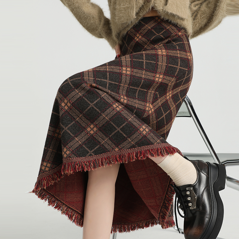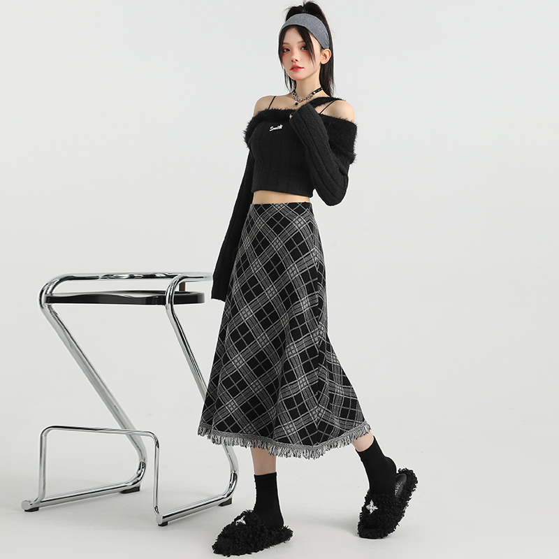 FA47802# 针织流苏格子半身裙女秋冬新款高腰显瘦A字裙直筒中长裙 服裝批發女裝批發服飾貨源