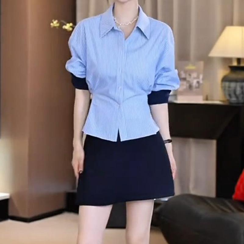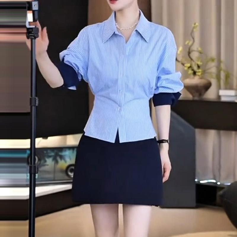 FA47816# 韩系时尚设计感秋季新款条纹衬衫女洋气显瘦收腰百搭长袖上衣 服裝批發女裝批發服飾貨源