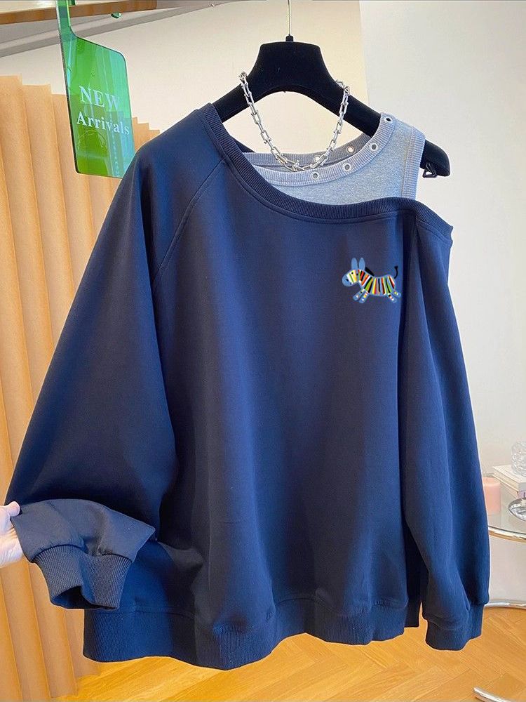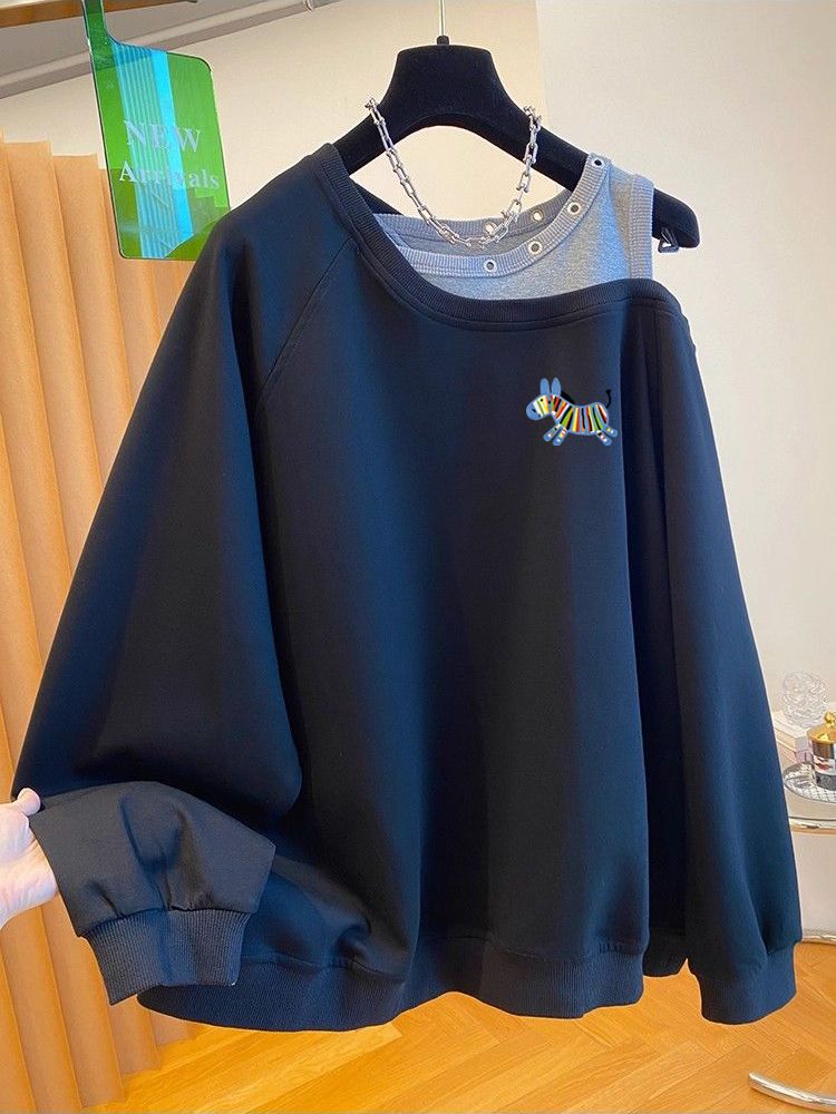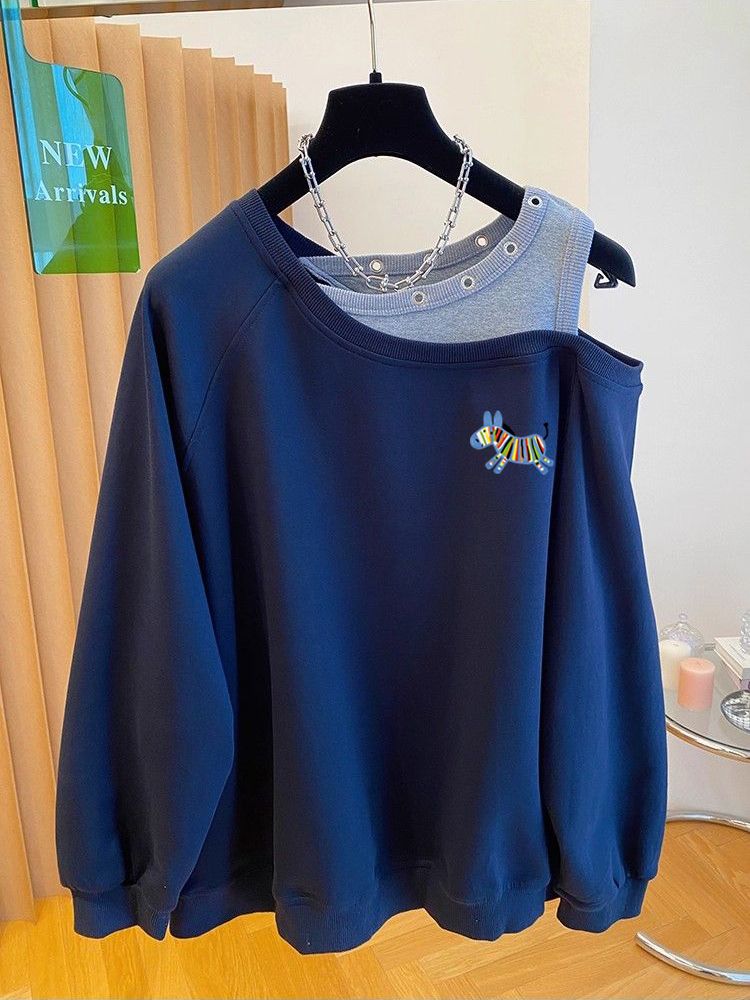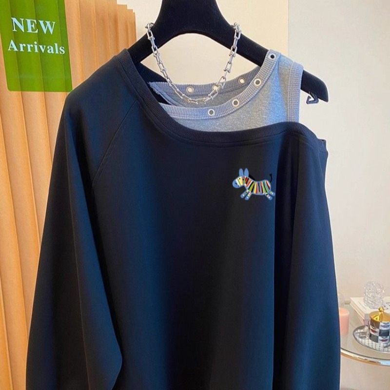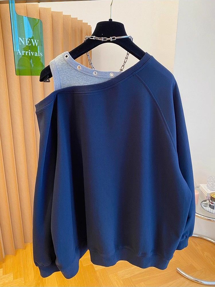 FA47874# 质量特大码300斤假两件斜肩露肩卫衣女秋季款上衣 服裝批發女裝批發服飾貨源
