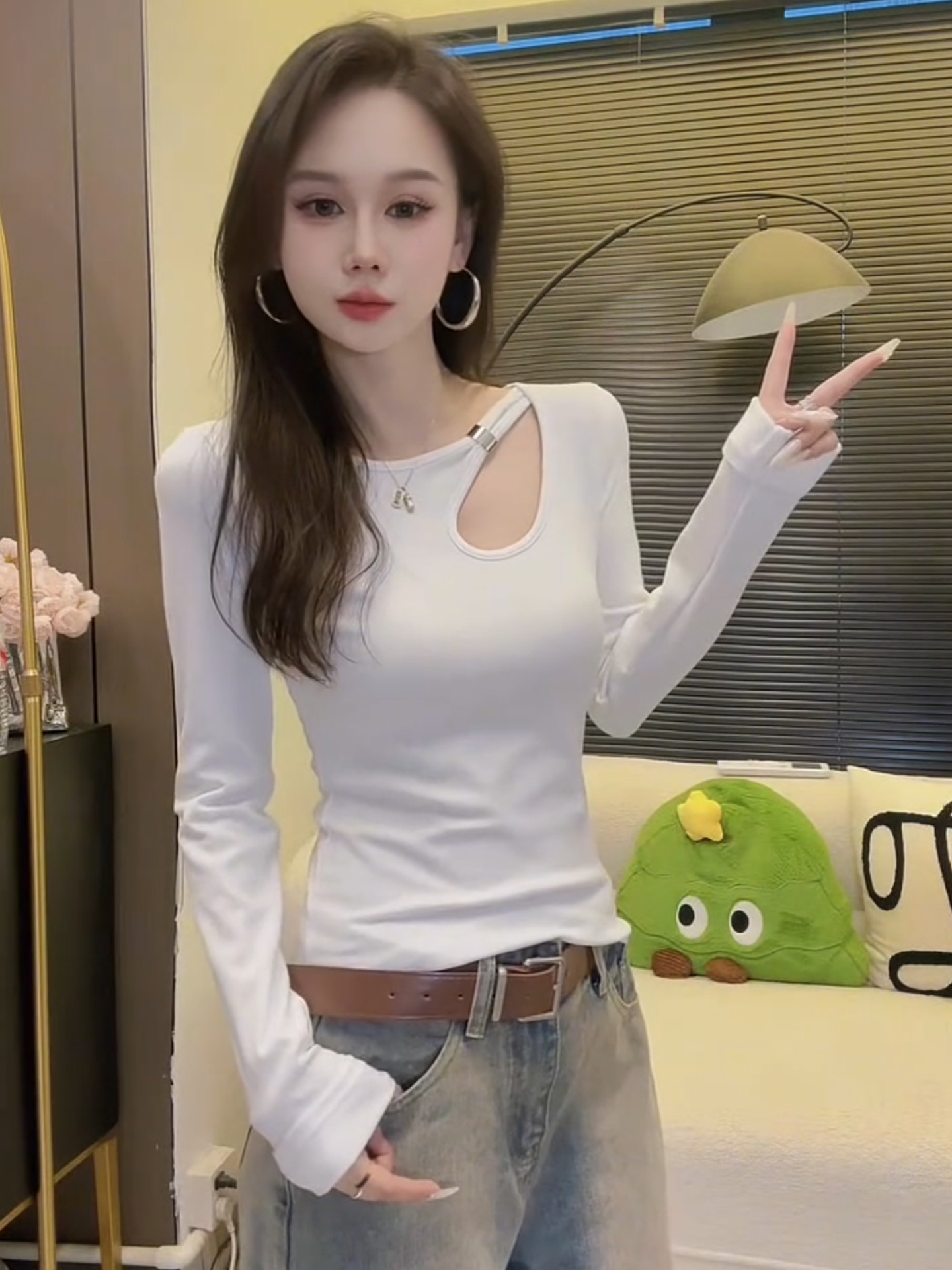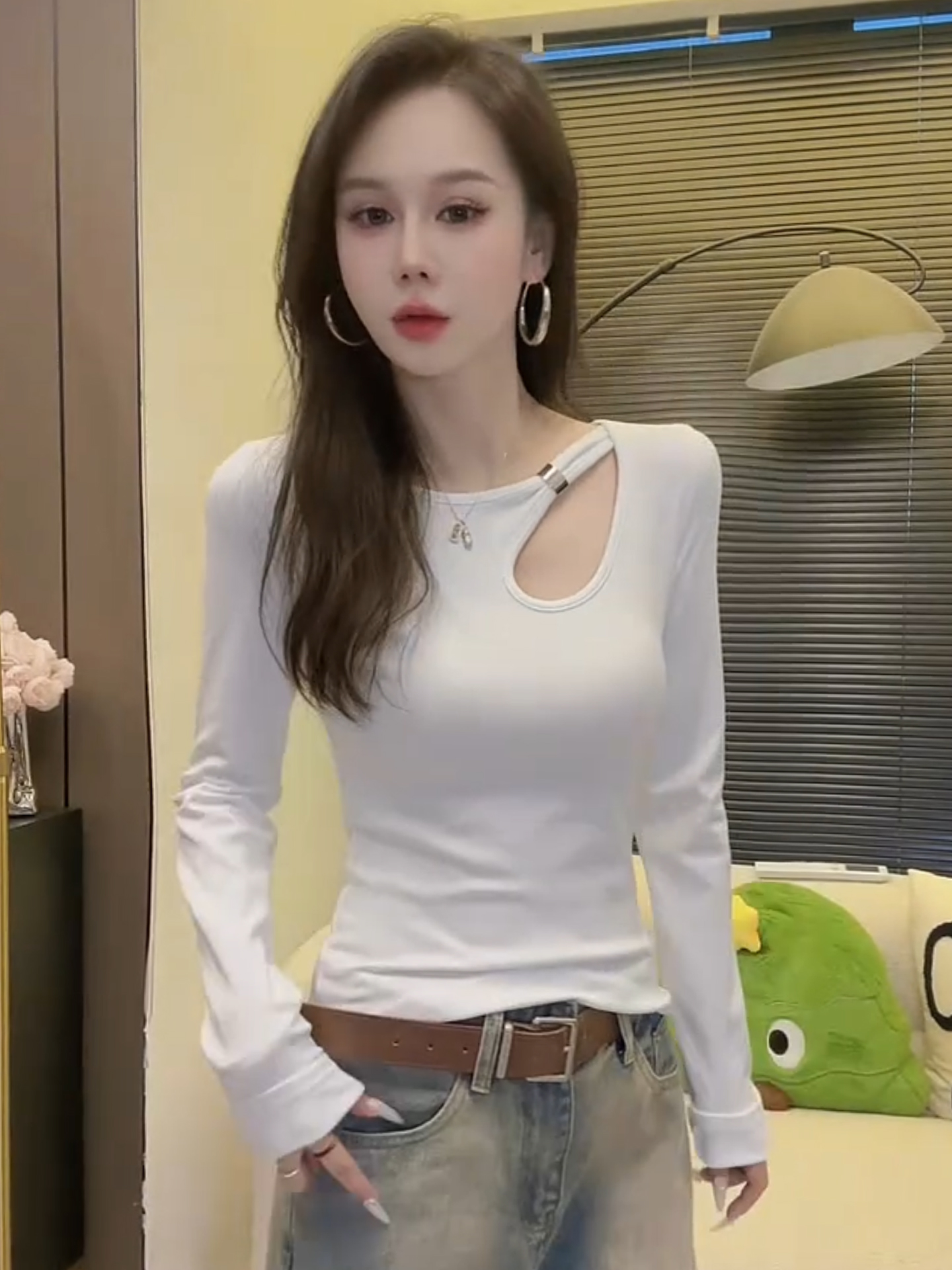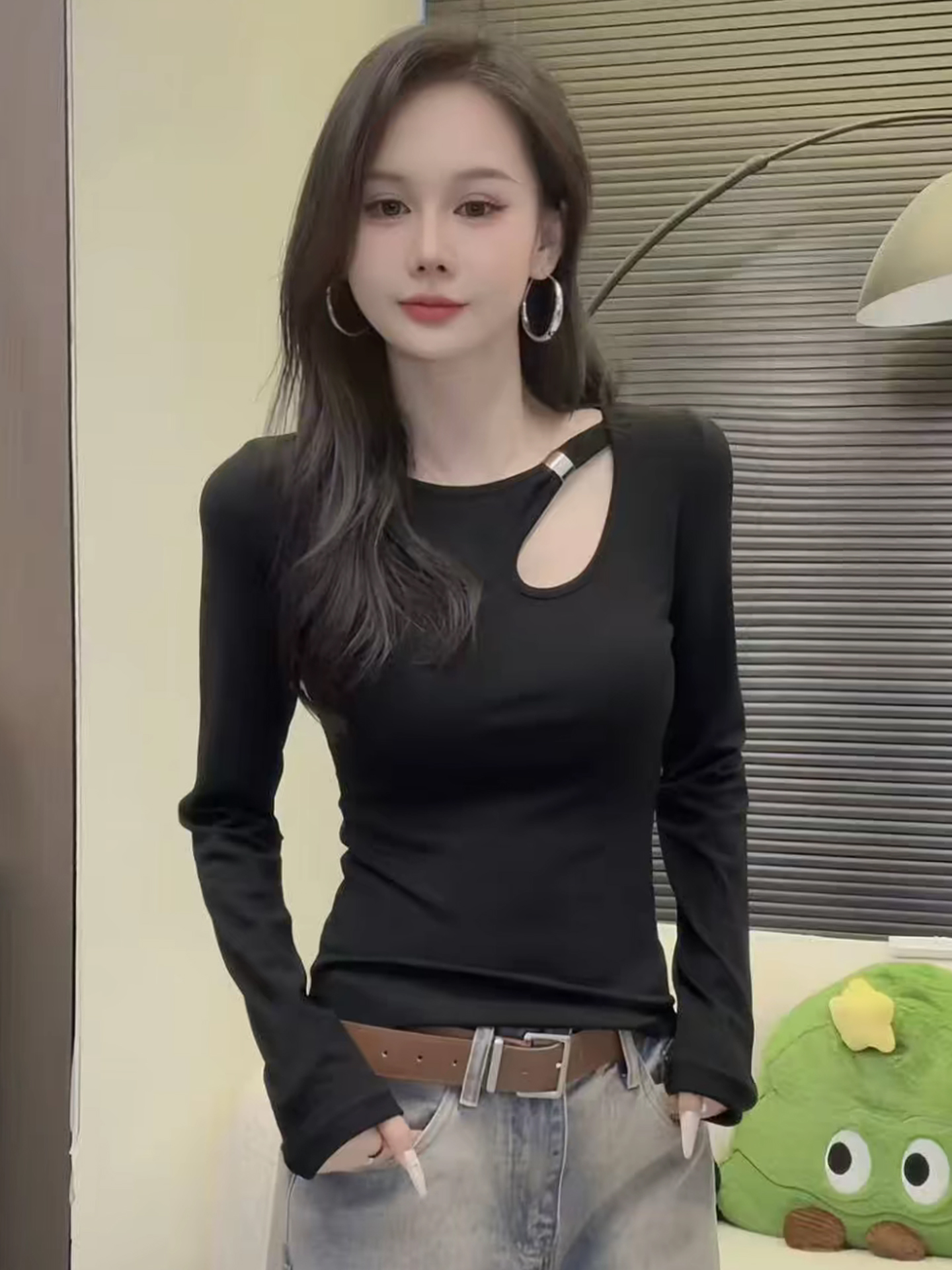 FA48043# 秋冬新款辣妹设计感圆领镂空长袖T恤女洋气修身显瘦内搭上衣 服裝批發女裝批發服飾貨源