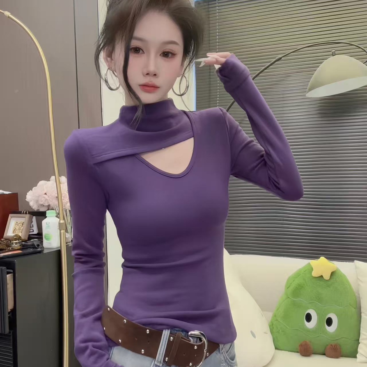 FA48045# 设计感镂空半高领长袖T恤女秋冬新款磨毛加绒打底衫修身上衣 服裝批發女裝批發服飾貨源