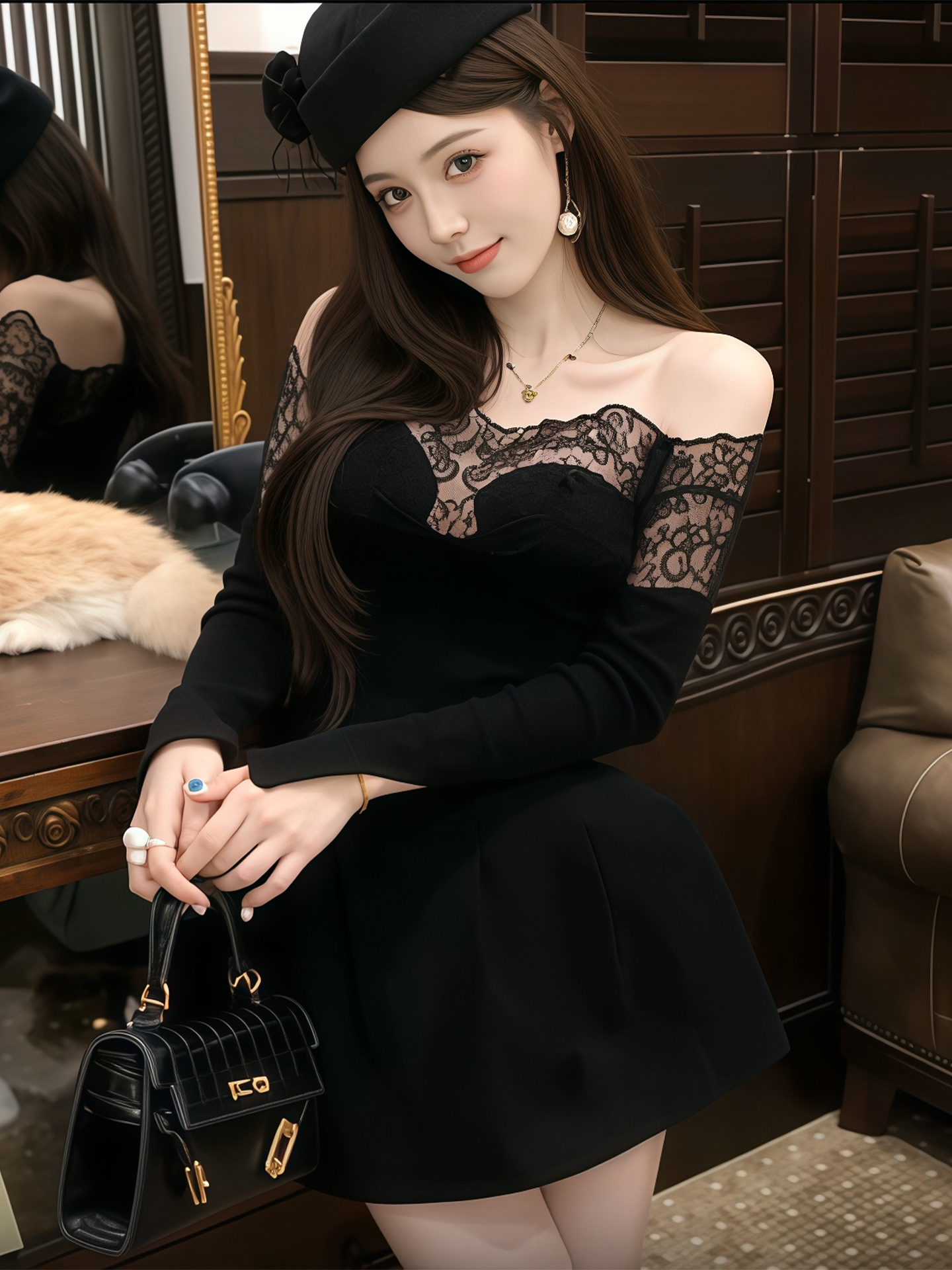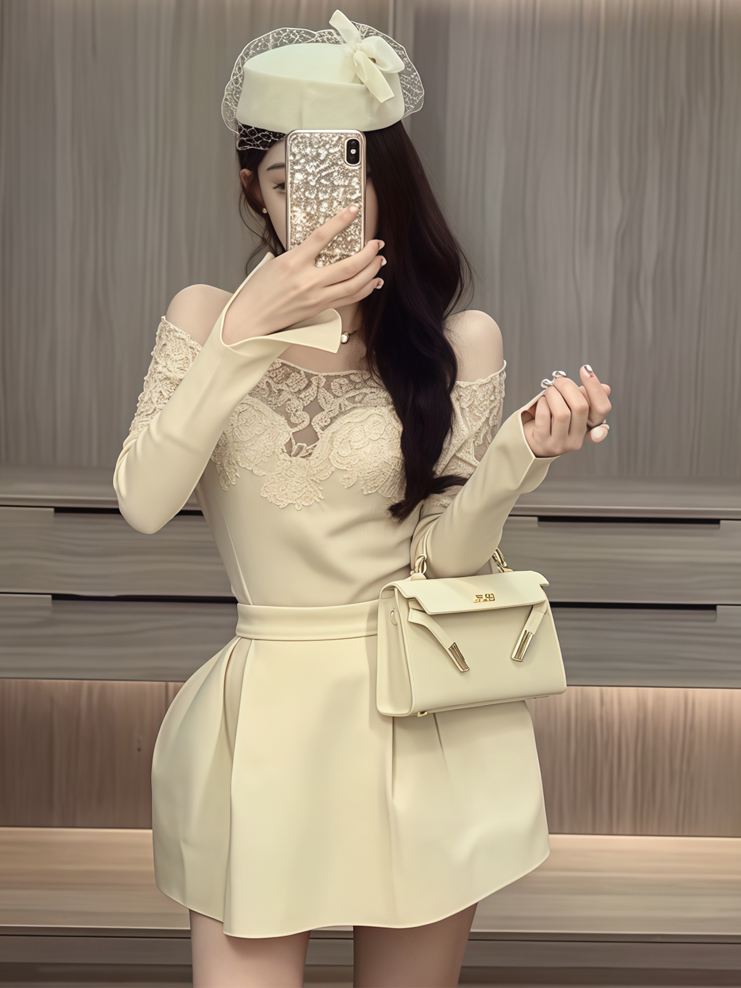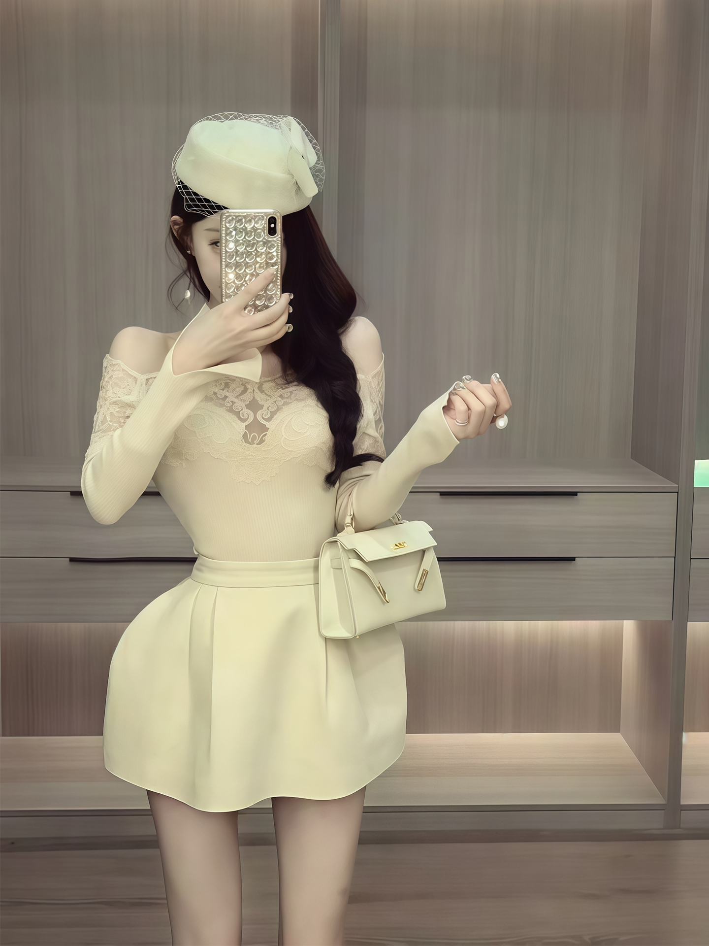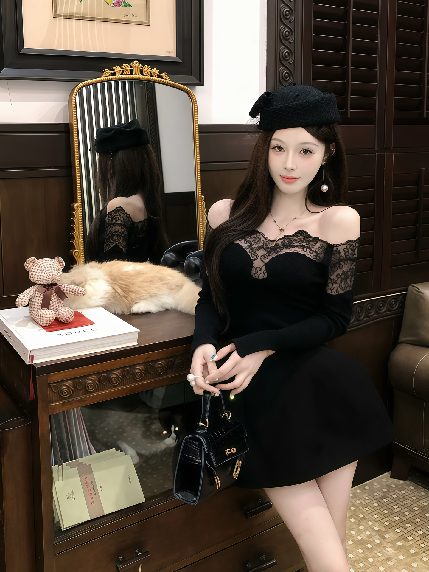 FA48048# 纯欲辣妹风蕾丝拼接一字肩长袖针织衫女秋季新款时尚穿搭打底上衣 服裝批發女裝批發服飾貨源