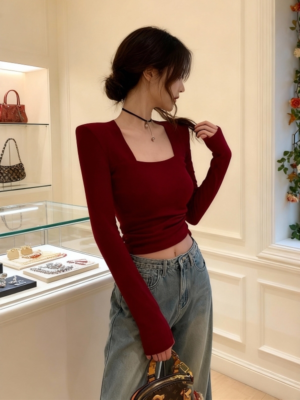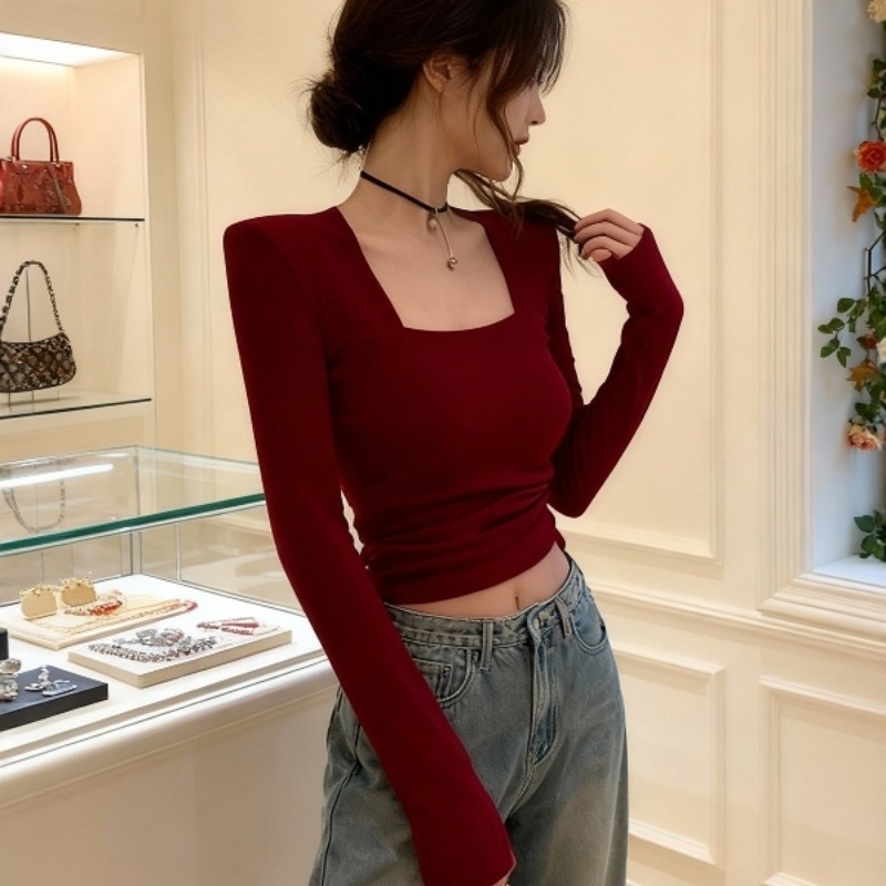 FA48052# 设计感双面绒方领长袖打底衫T恤女冬季修身显瘦辣妹红色内搭上衣 服裝批發女裝批發服飾貨源