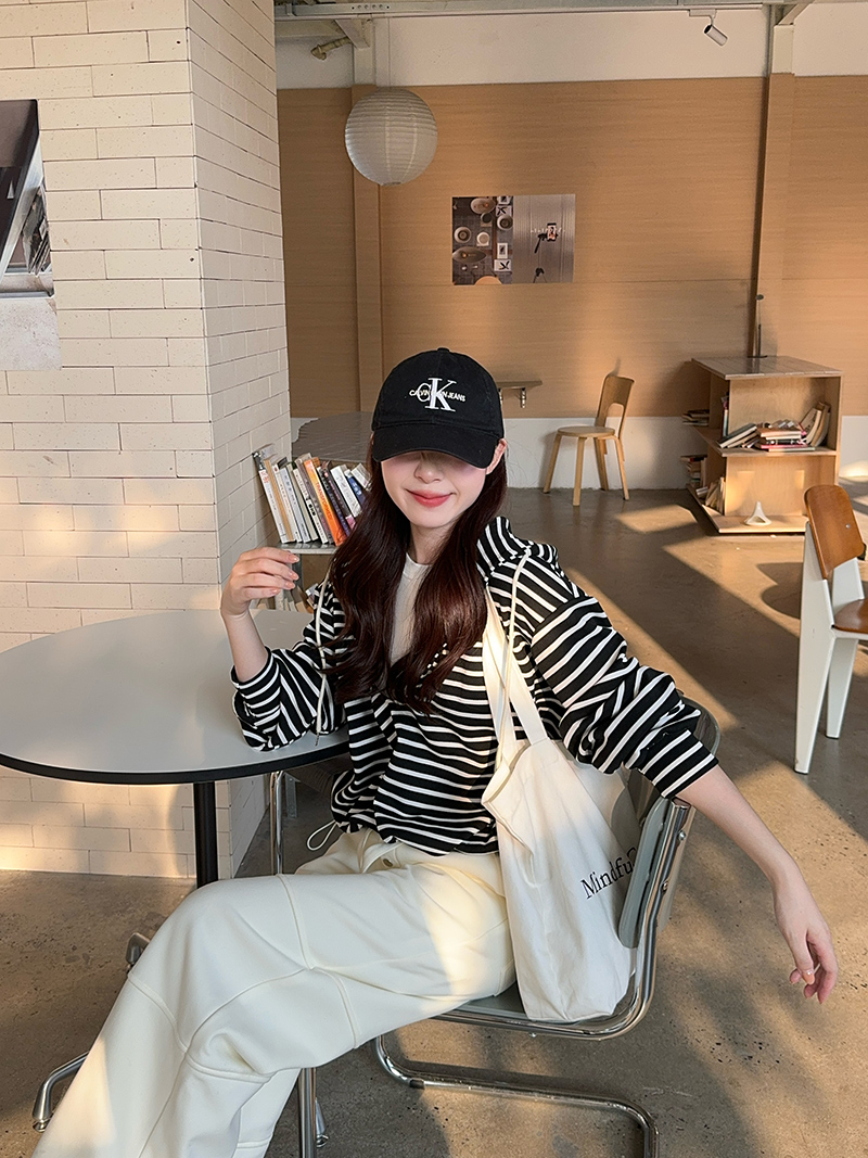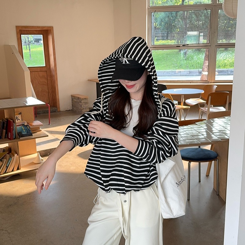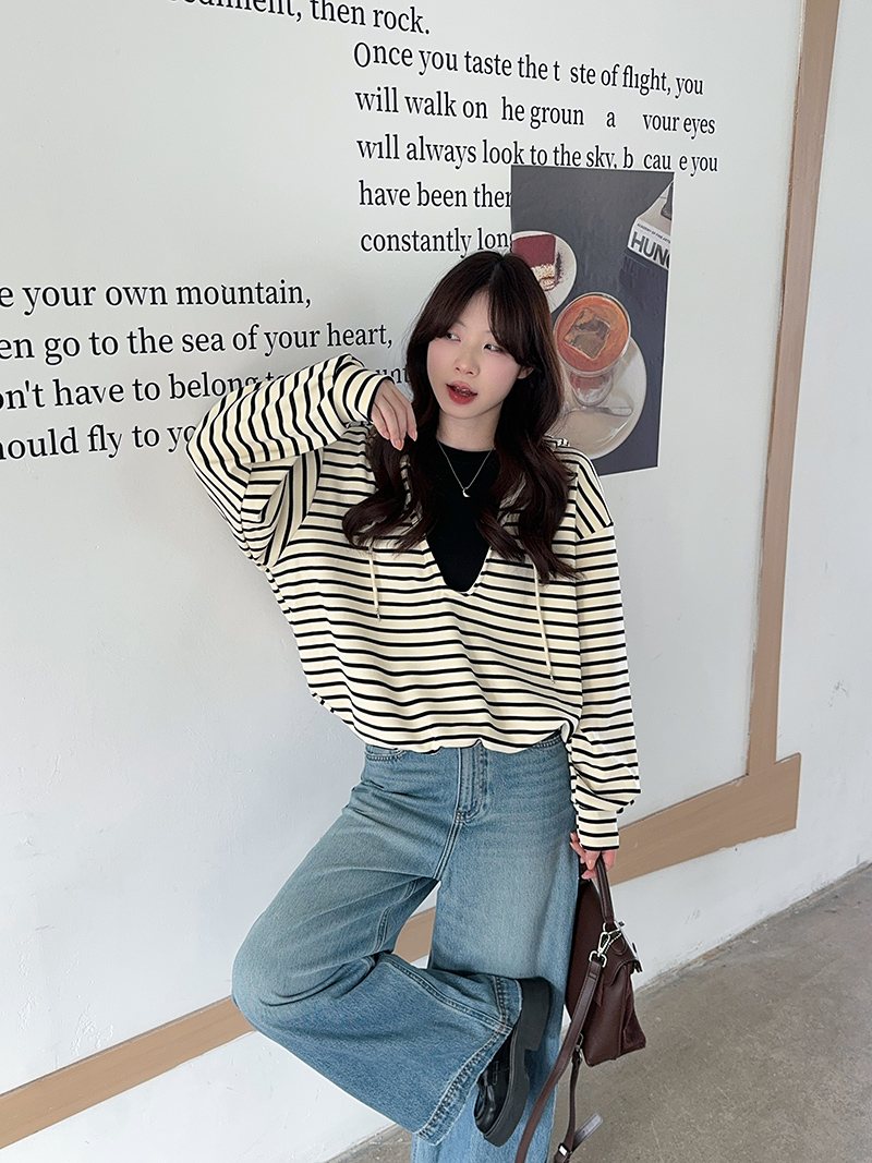FA48235# 大码女装卫衣秋季薄款潮新款假两件条纹连帽宽松韩版上衣 服裝批發女裝批發服飾貨源