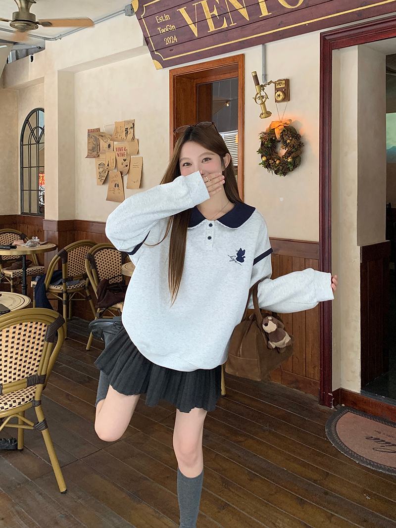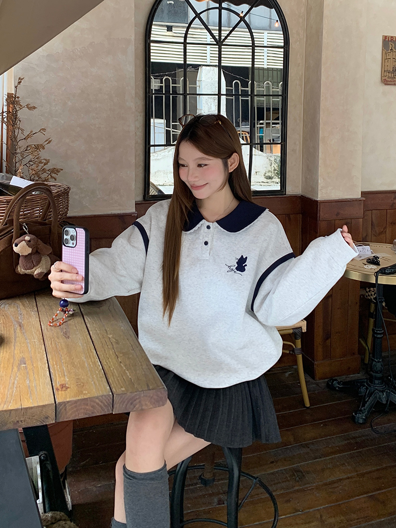 FA48240# 加绒卫衣秋冬新款初中生学生中长宽松刺绣娃娃领保暖上衣 服裝批發女裝批發服飾貨源