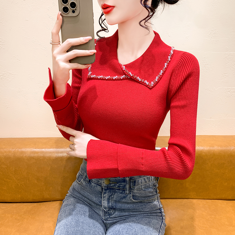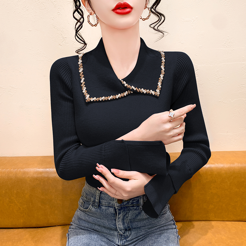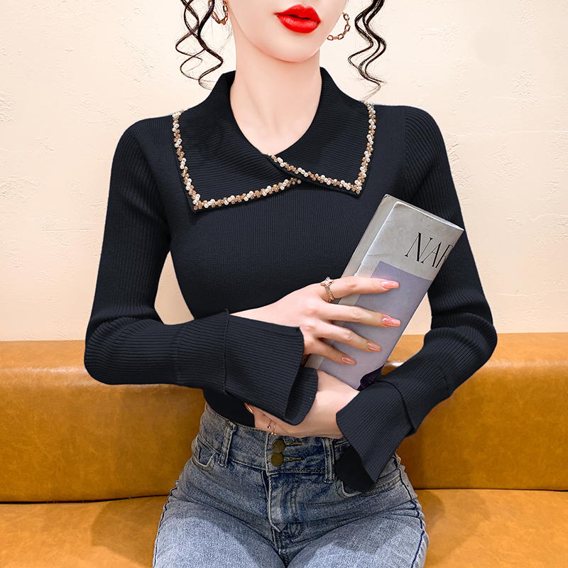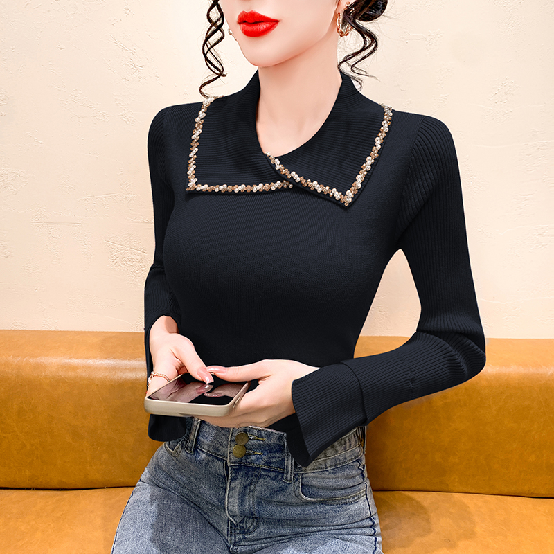 FA48250# 冬季新款洋气时尚设计感翻领订珠修身显瘦针织长袖女装上衣潮 服裝批發女裝批發服飾貨源