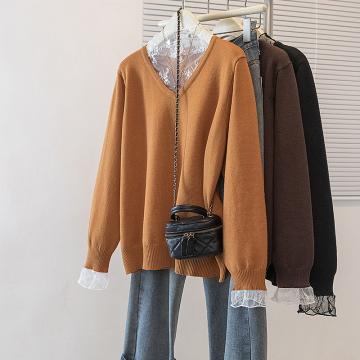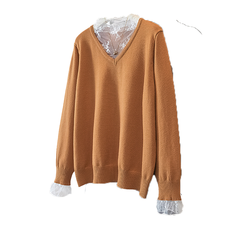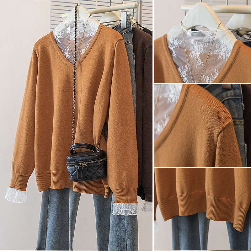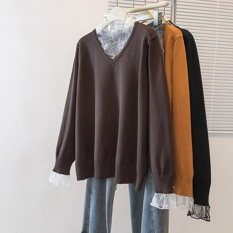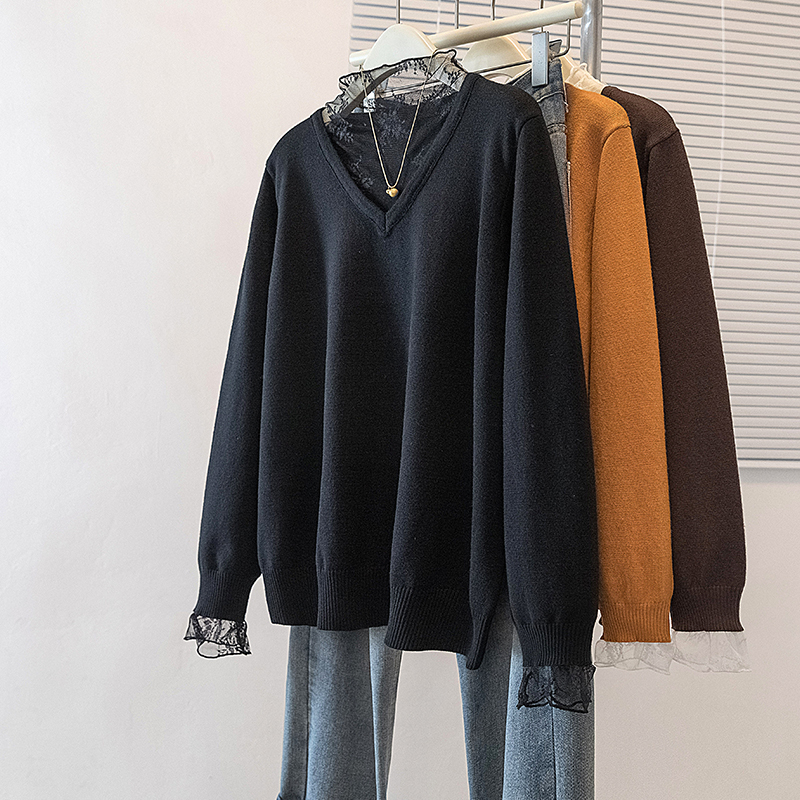FA48255# 大码女装秋冬新款韩版高级潮流蕾丝拼接设计显瘦修身针织上衣 服裝批發女裝批發服飾貨源