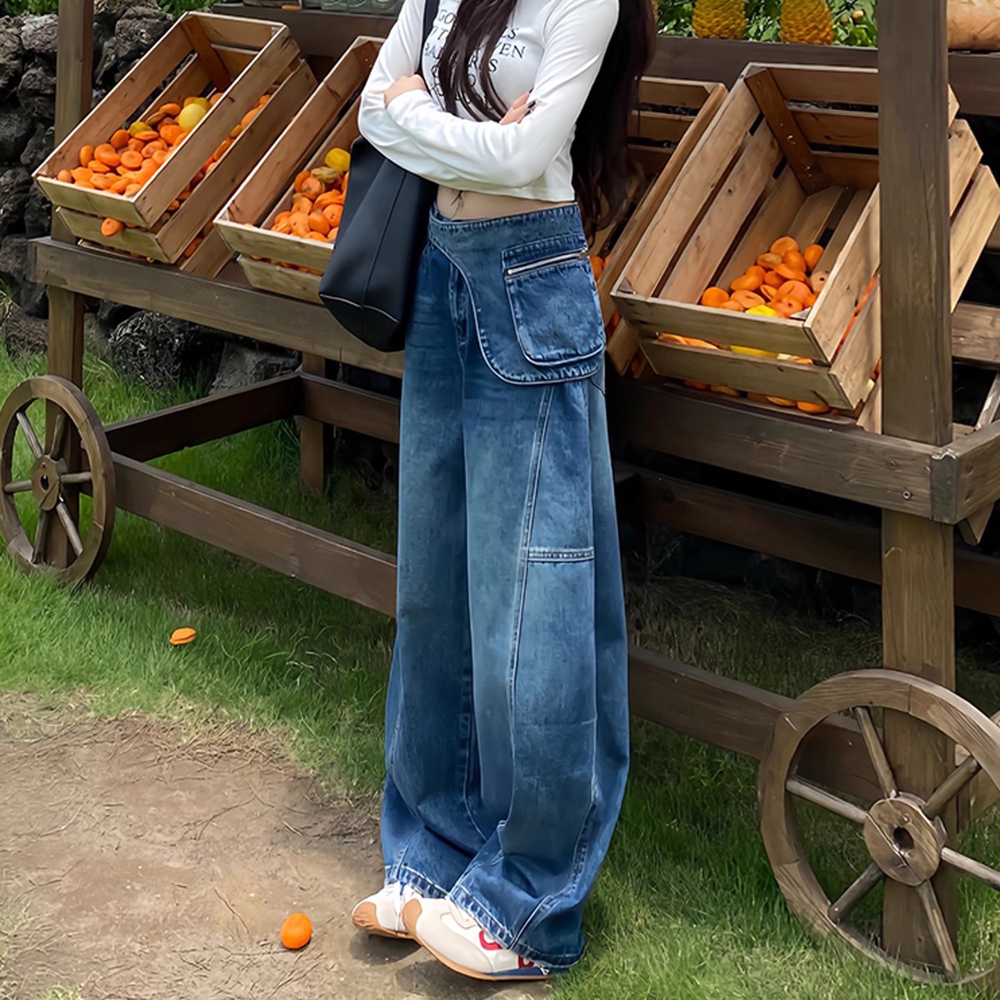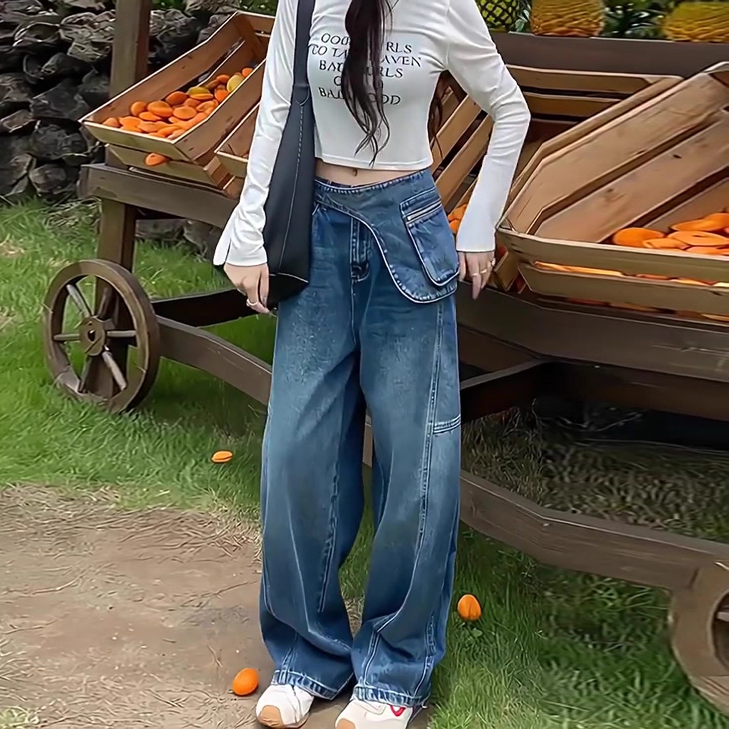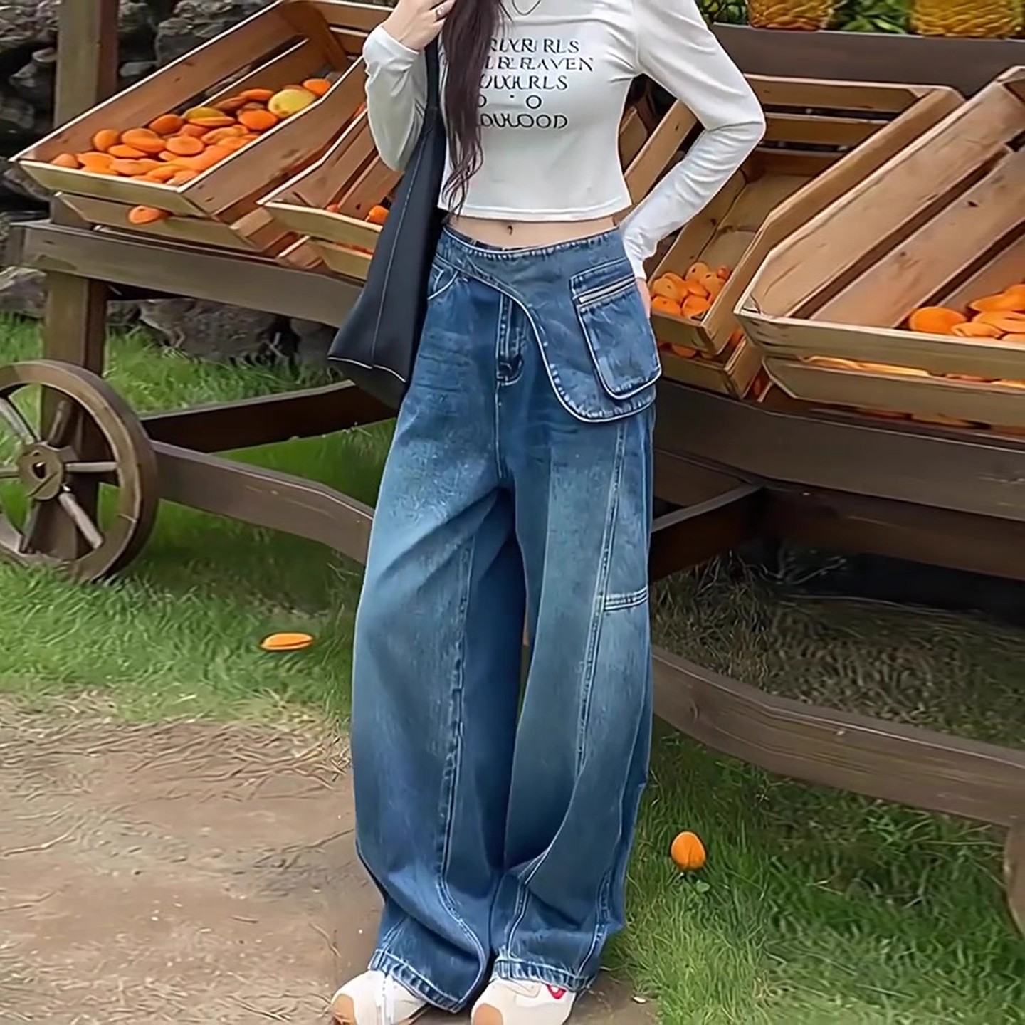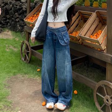 FA48262# 加绒腰封叠穿早秋显瘦时尚宽松设计感街拍水洗牛仔拖地裤 服裝批發女裝批發服飾貨源
