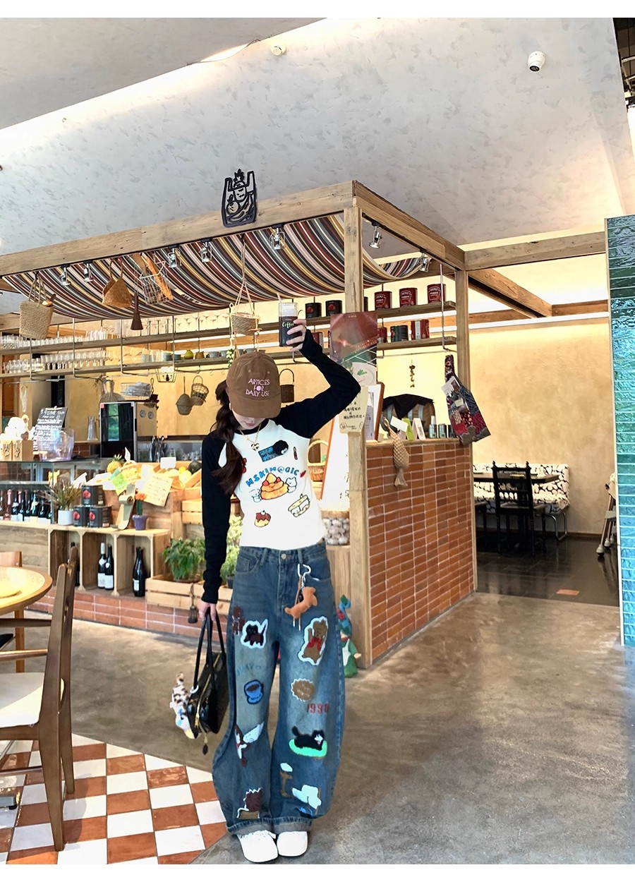 FA48263# 植绒小狗印花显瘦阔腿牛仔裤女秋季复古风做旧直筒休闲裤 服裝批發女裝批發服飾貨源