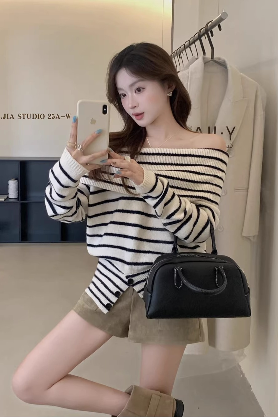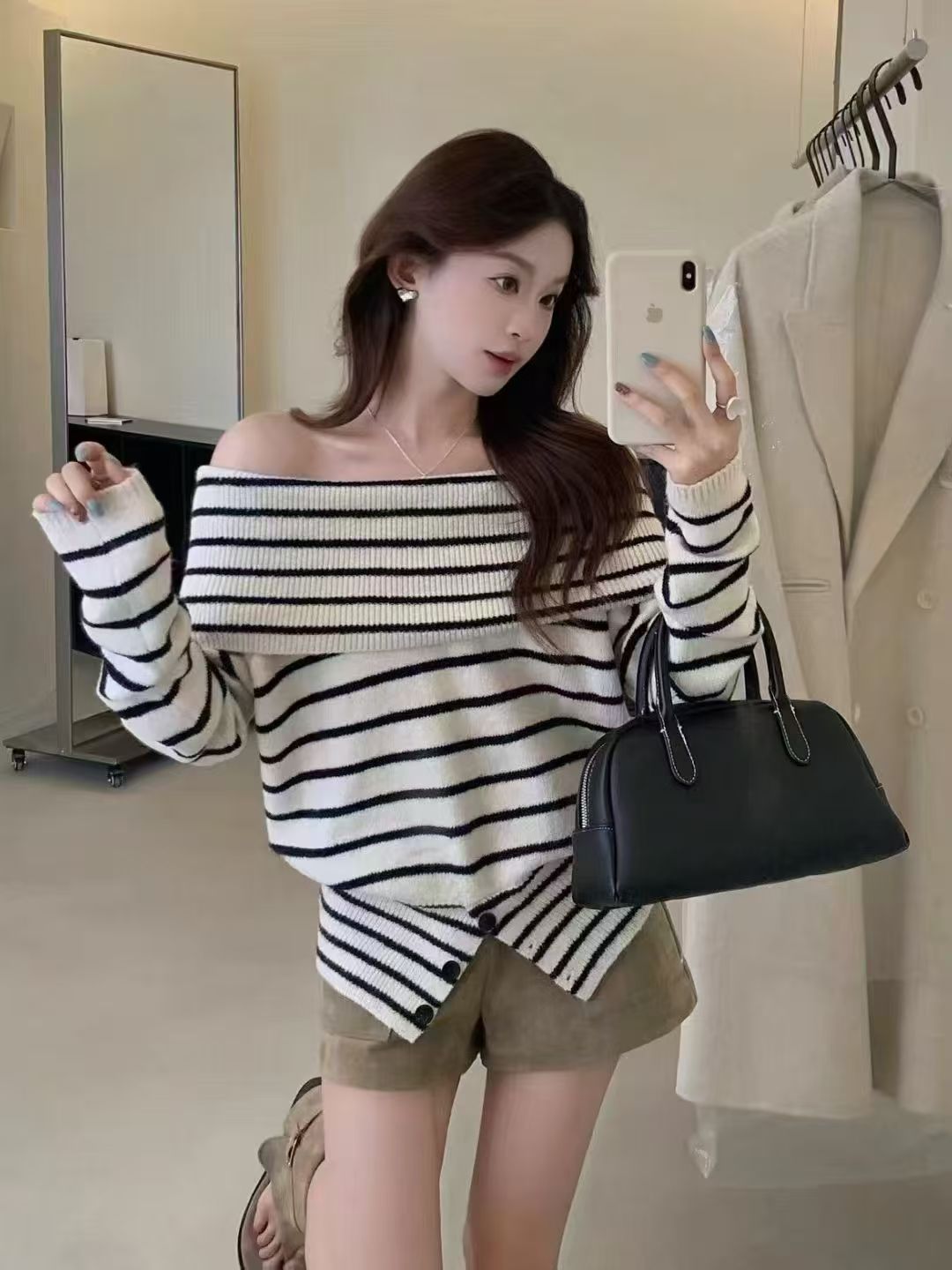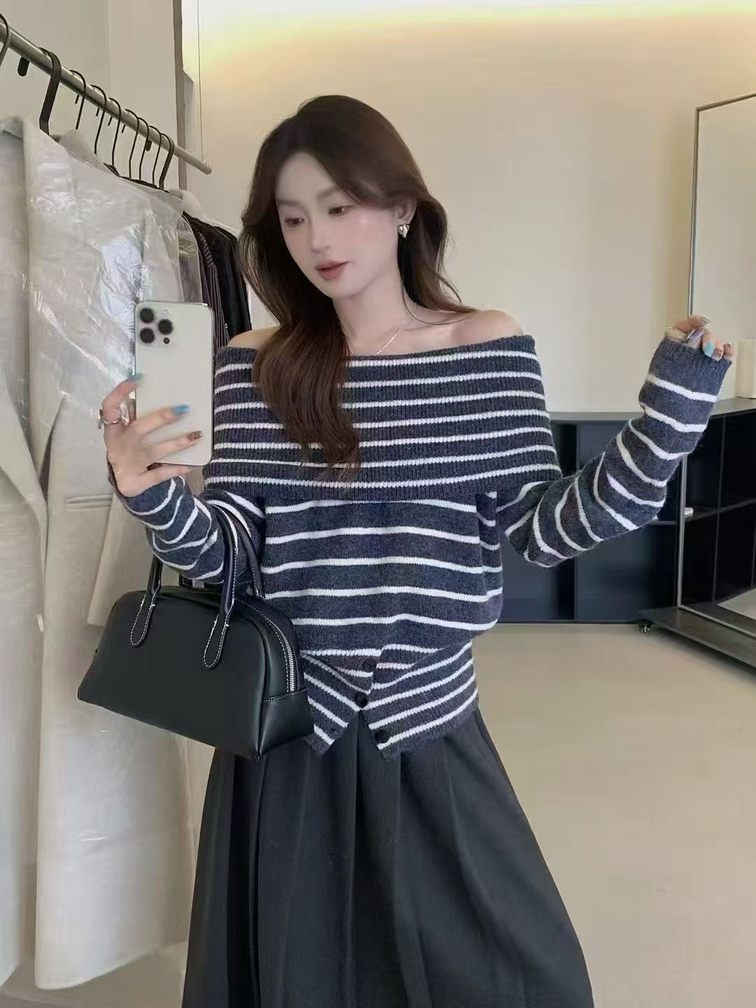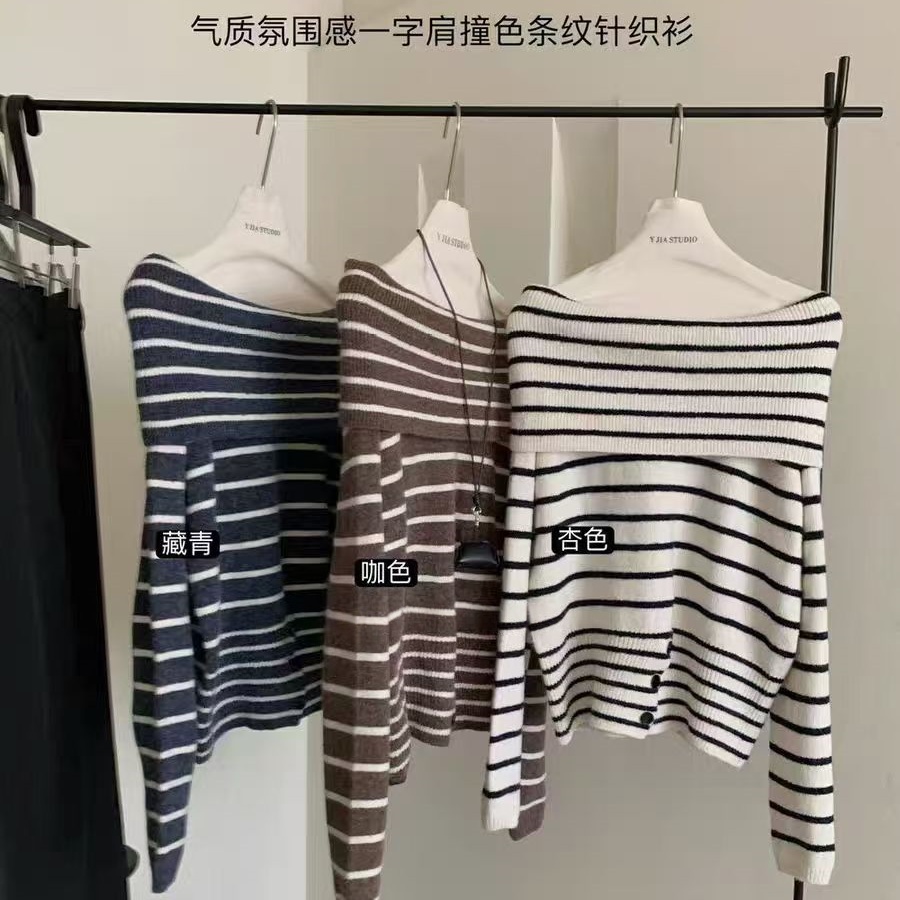 FA48275# 气质氛围感一字肩撞色条纹针织衫女装秋季时尚套头显瘦休闲上衣 服裝批發女裝批發服飾貨源