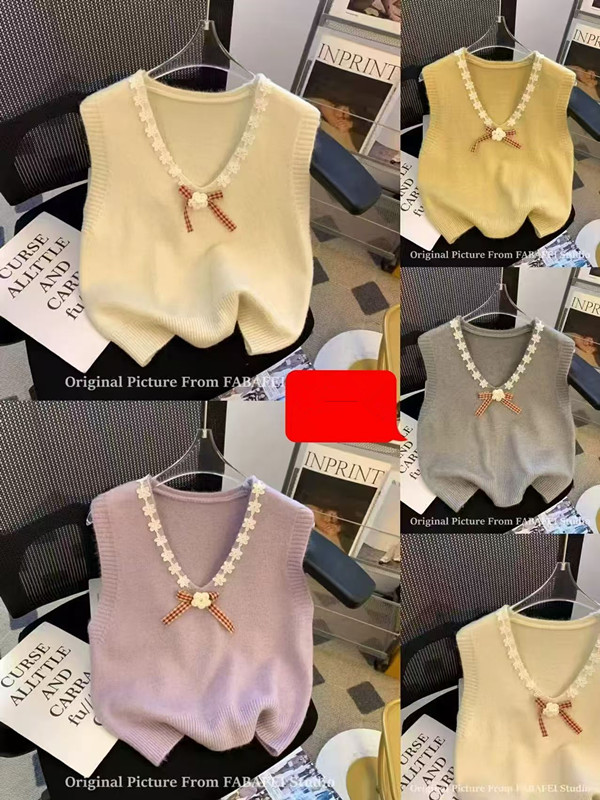 FA48276# 立体花边蝴蝶结v领针织背心早春外搭叠穿软糯毛衣马甲 服裝批發女裝批發服飾貨源