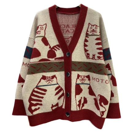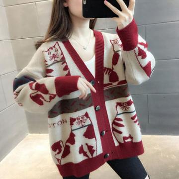 FA48277# 满身卡通猫咪提花毛衣外套女春装韩版V领单排扣宽松慵懒针织开 服裝批發女裝批發服飾貨源