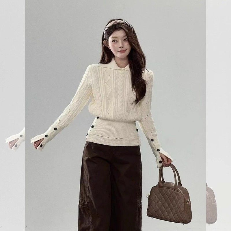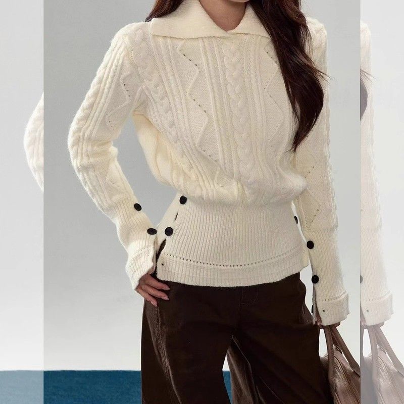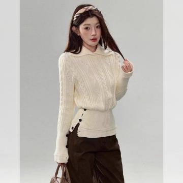 FA48283# 米白色麻花毛衣女新款秋冬季掐腰针织衫内搭可外穿设计感上衣 服裝批發女裝批發服飾貨源