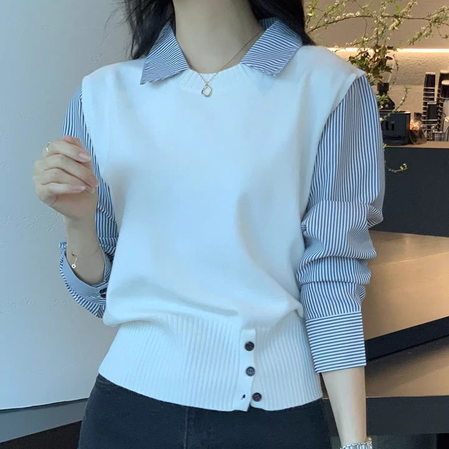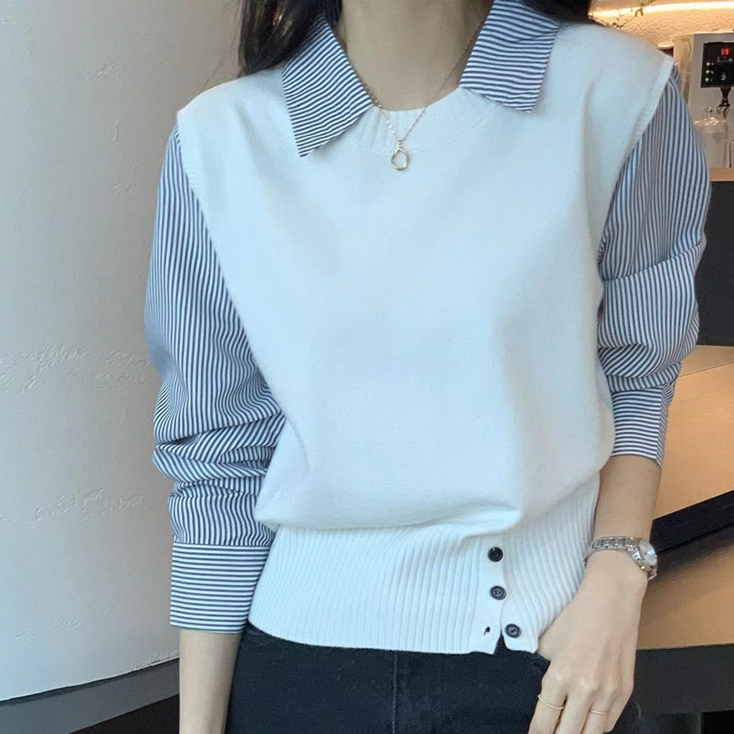 FA48284# 衬衫假两件针织衫上衣女春秋新款长袖拼接条纹撞色设计感小众 服裝批發女裝批發服飾貨源