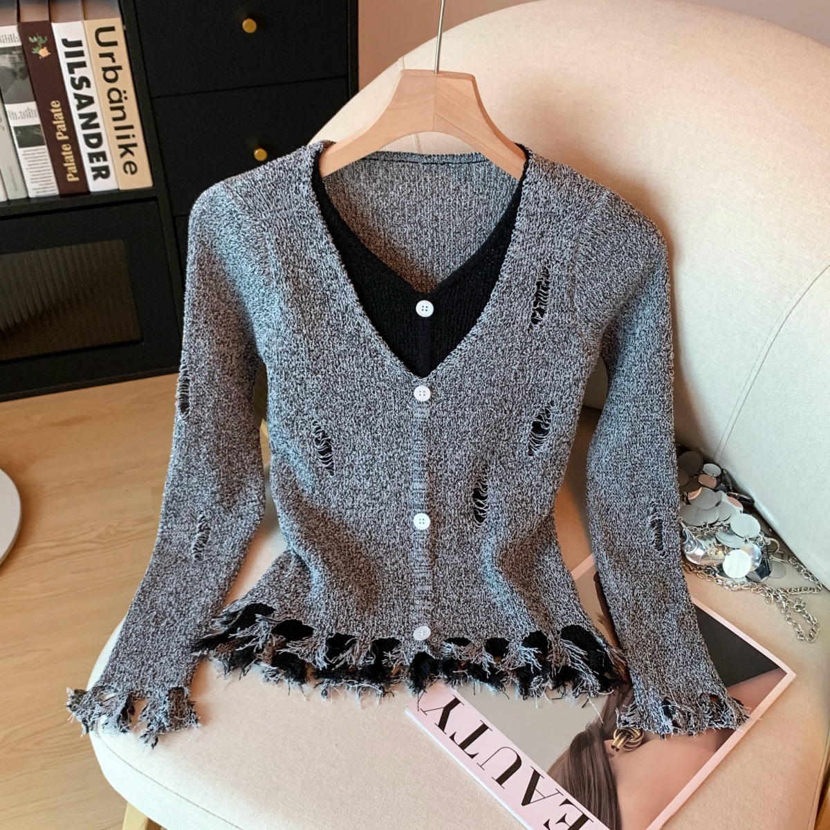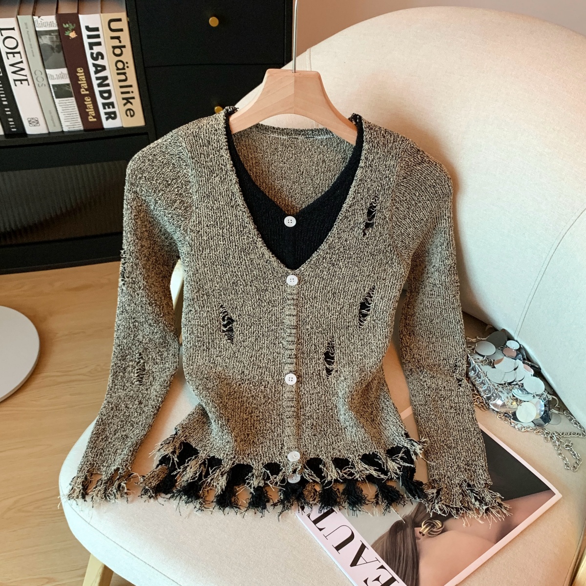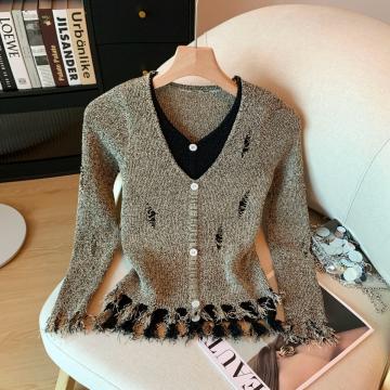 FA48311# 冬季新款打底破洞针织衫修身假两件内搭毛衣下摆流苏上衣 服裝批發女裝批發服飾貨源
