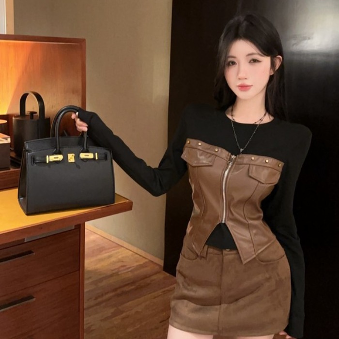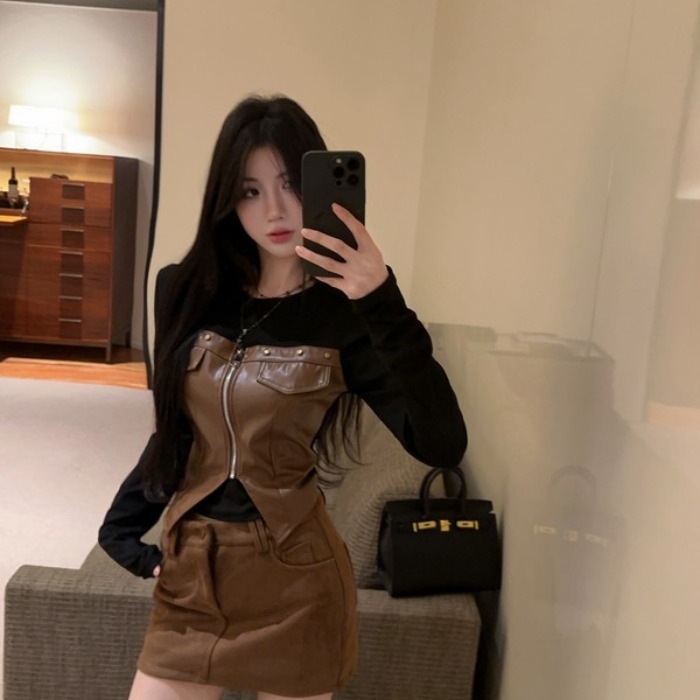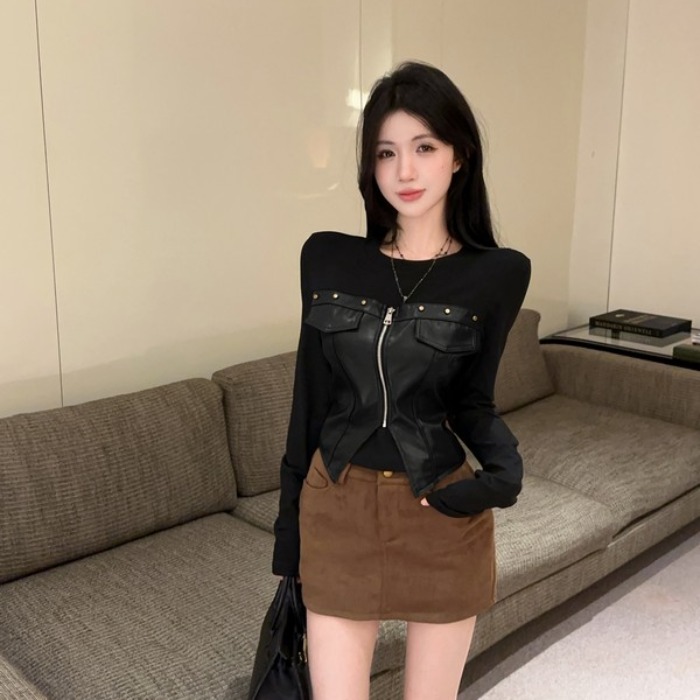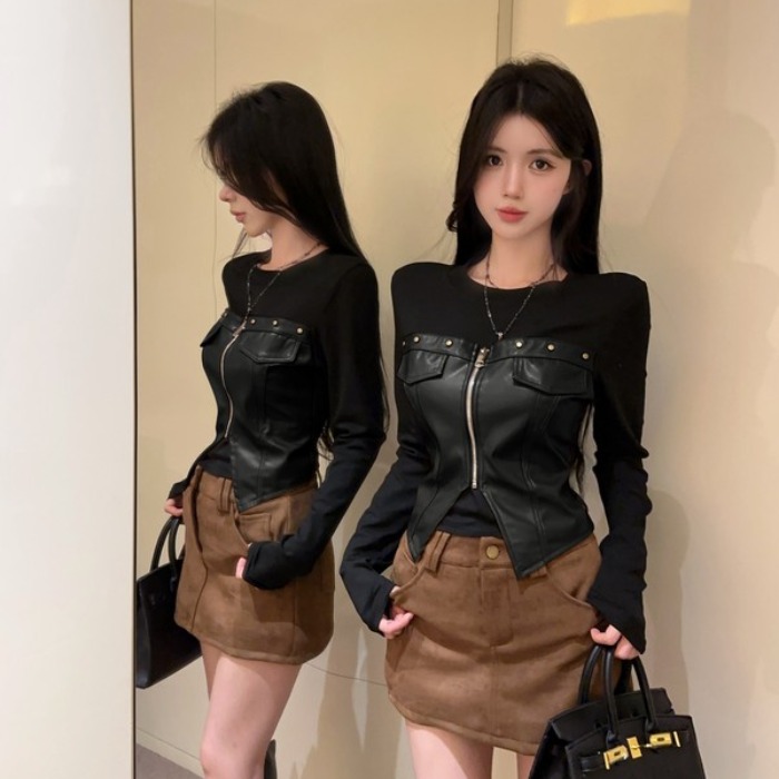 Home > 长袖T恤 > FA48333# 独特拉链柳丁酷飚辣妹PU拼接长袖T恤冬季辣妹风假两件T恤 服裝批發女裝批發服飾貨源