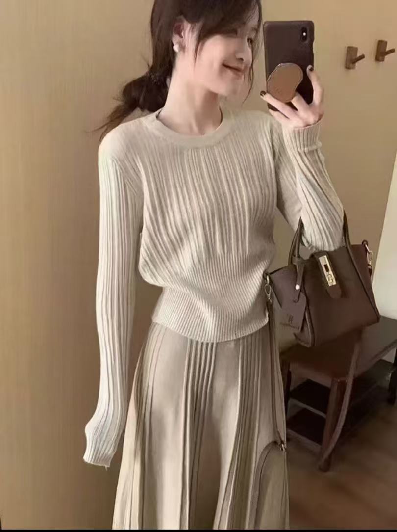 FA48344# 秋季新款时尚简约针织套装女秋冬圆领条纹衫高腰半身裙两件套 服裝批發女裝批發服飾貨源
