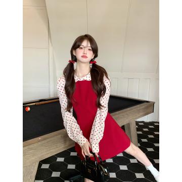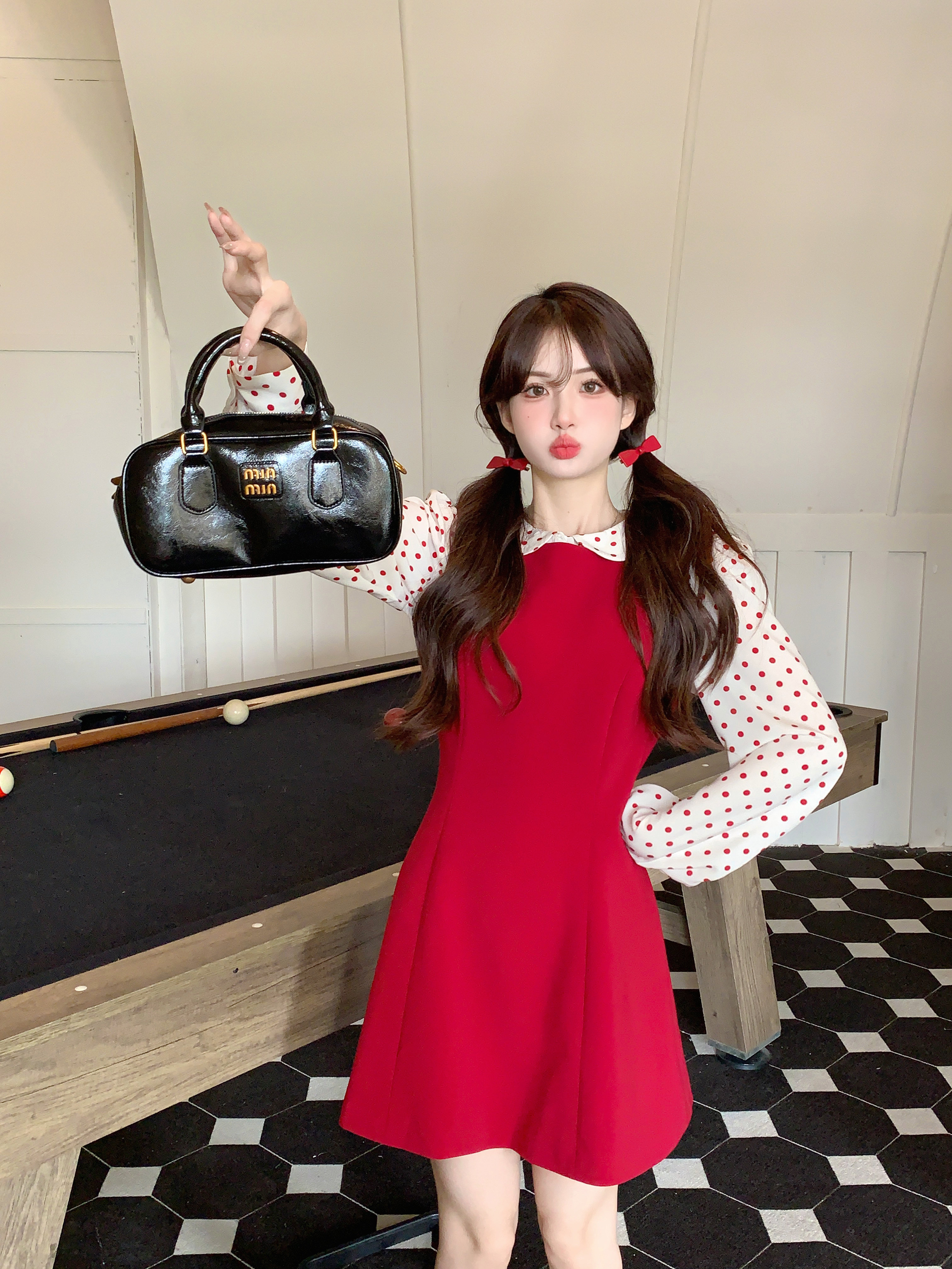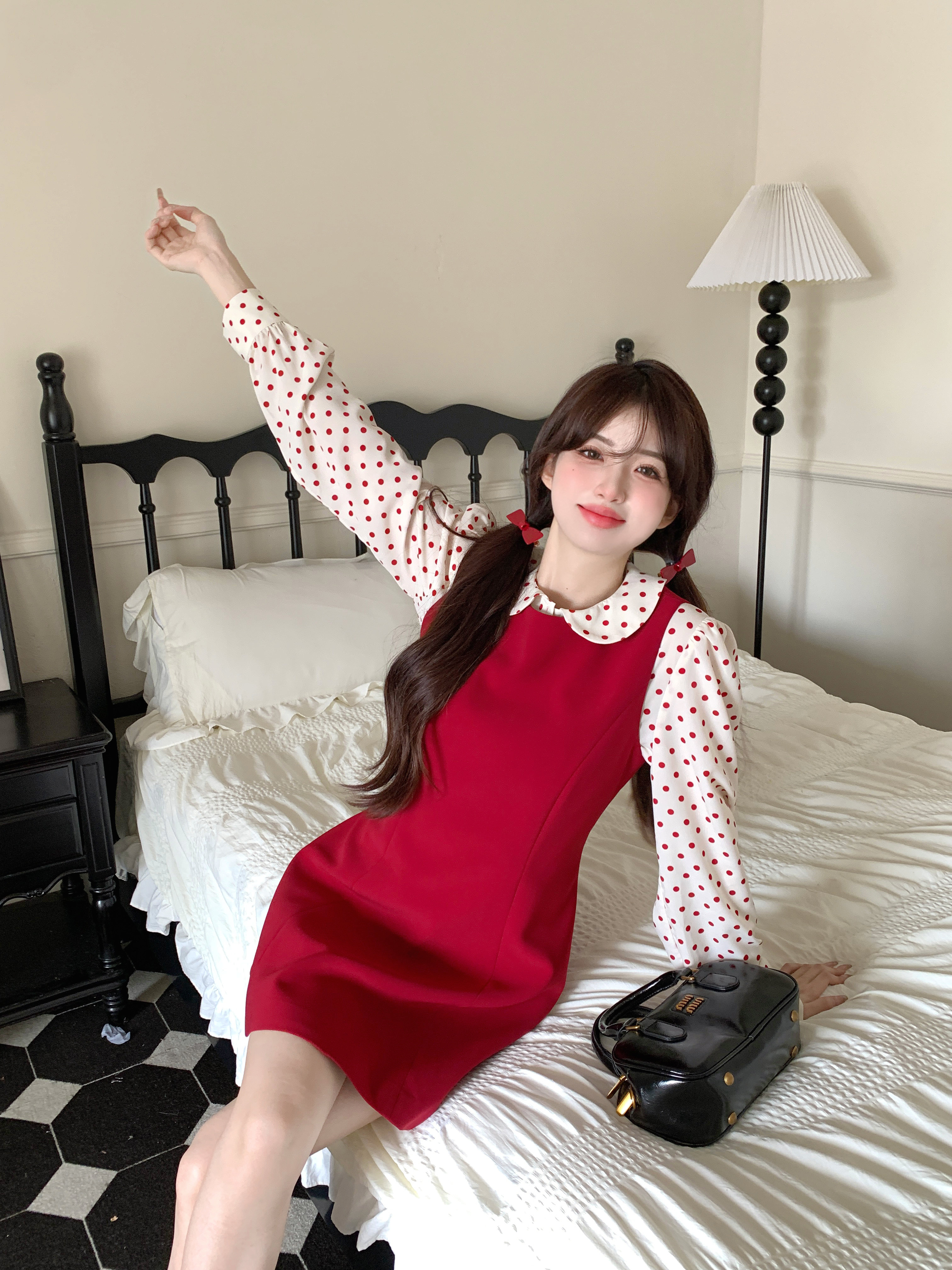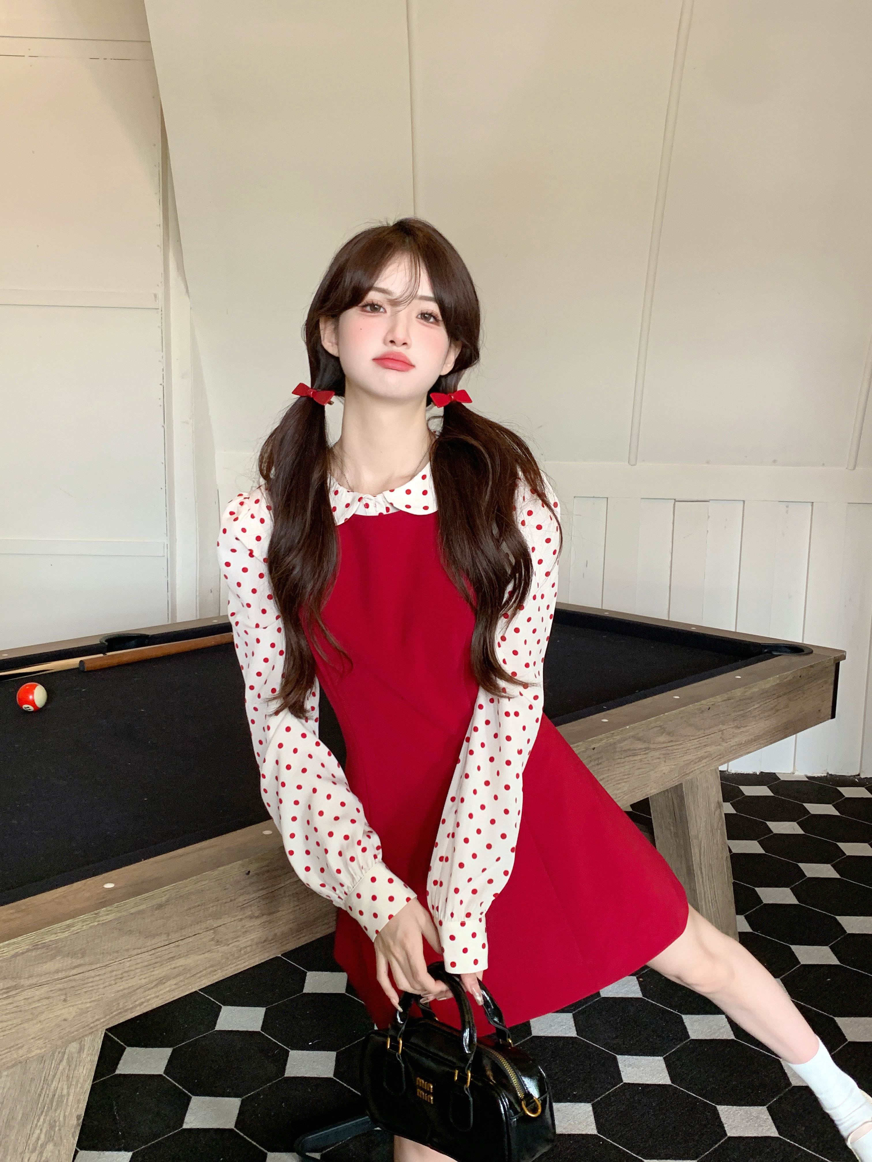 FA48352# 大码秋假两件波点多巴胺淑女套头连衣裙修身显瘦娃娃领甜美 服裝批發女裝批發服飾貨源