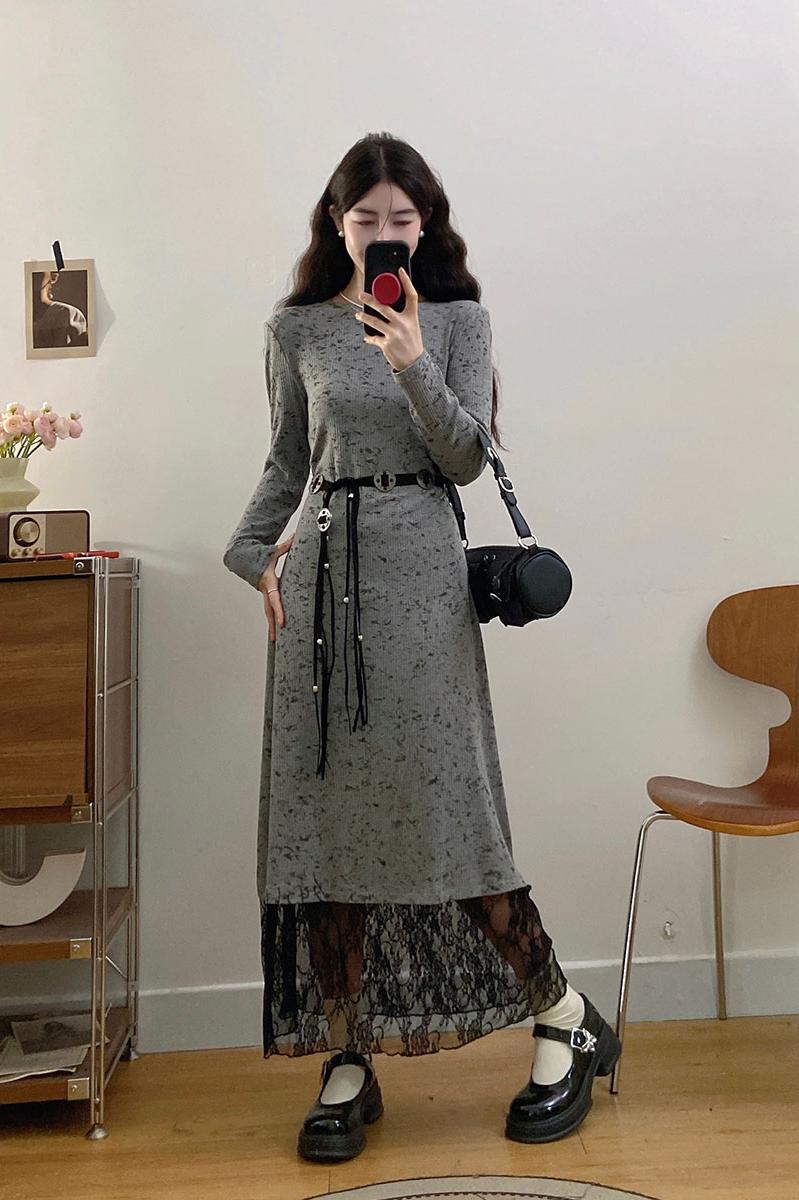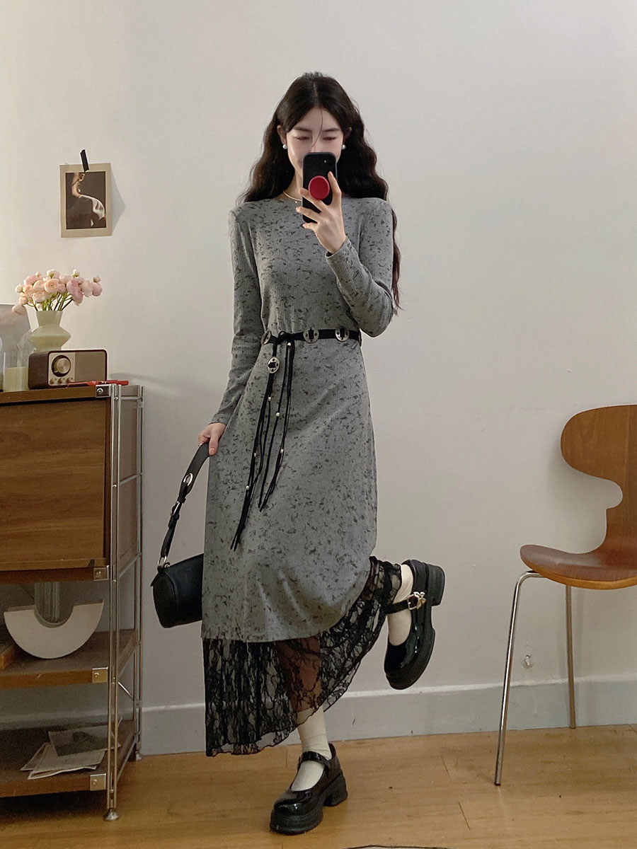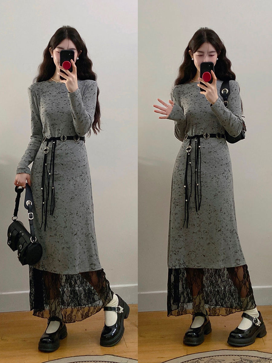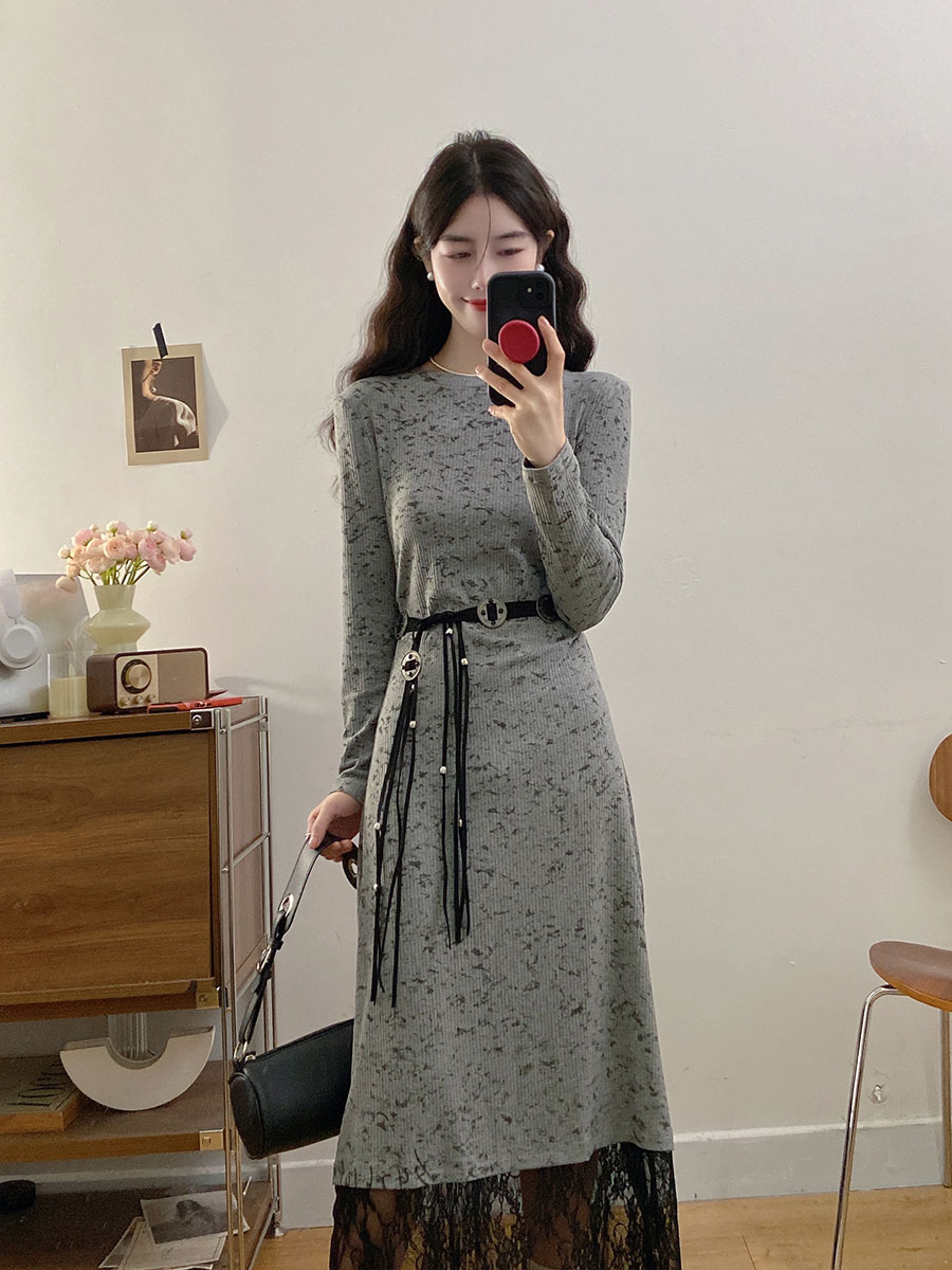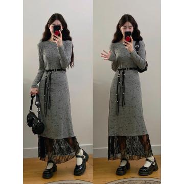 FA48383# 大码女装秋冬蕾丝拼接气质长袖针织连衣裙胖MM藏肉显瘦长裙 服裝批發女裝批發服飾貨源