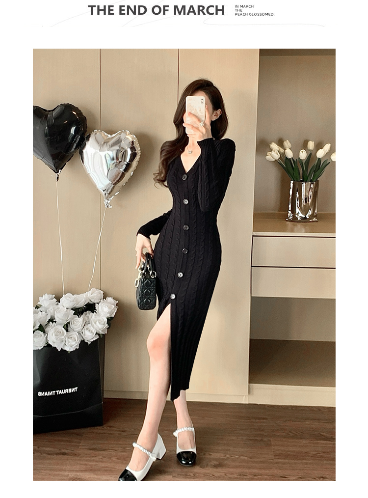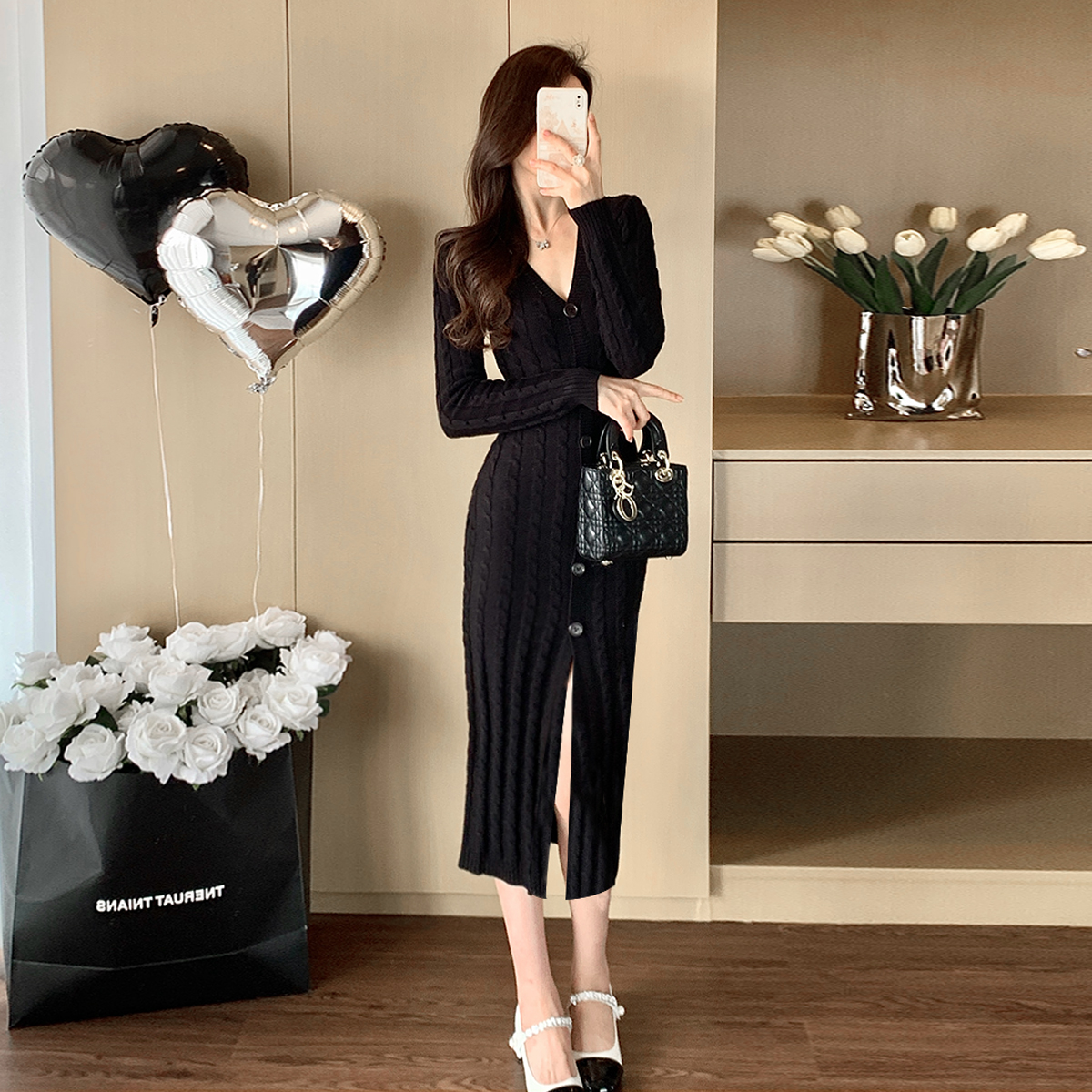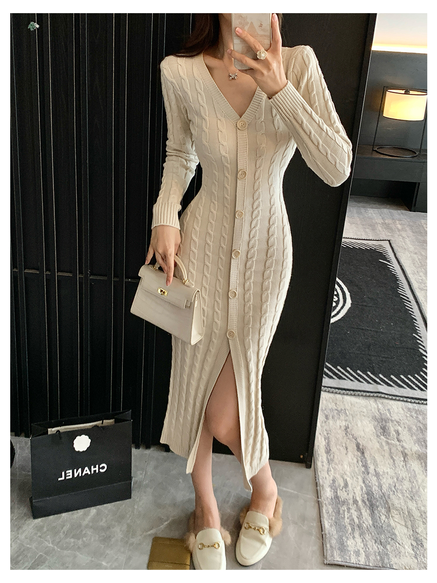 FA48406# 韩国OL包臀麻花针织毛衣连衣裙女秋冬修身开叉打底中长款过膝长裙 服裝批發女裝批發服飾貨源