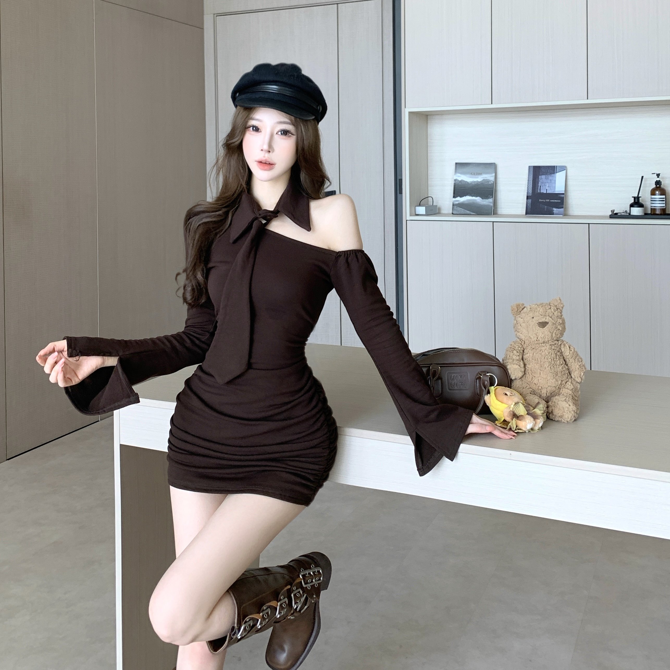 FA48526# 纯欲领带斜肩喇叭袖连衣裙女辣妹风性感气质加绒显瘦包臀短裙 服裝批發女裝批發服飾貨源