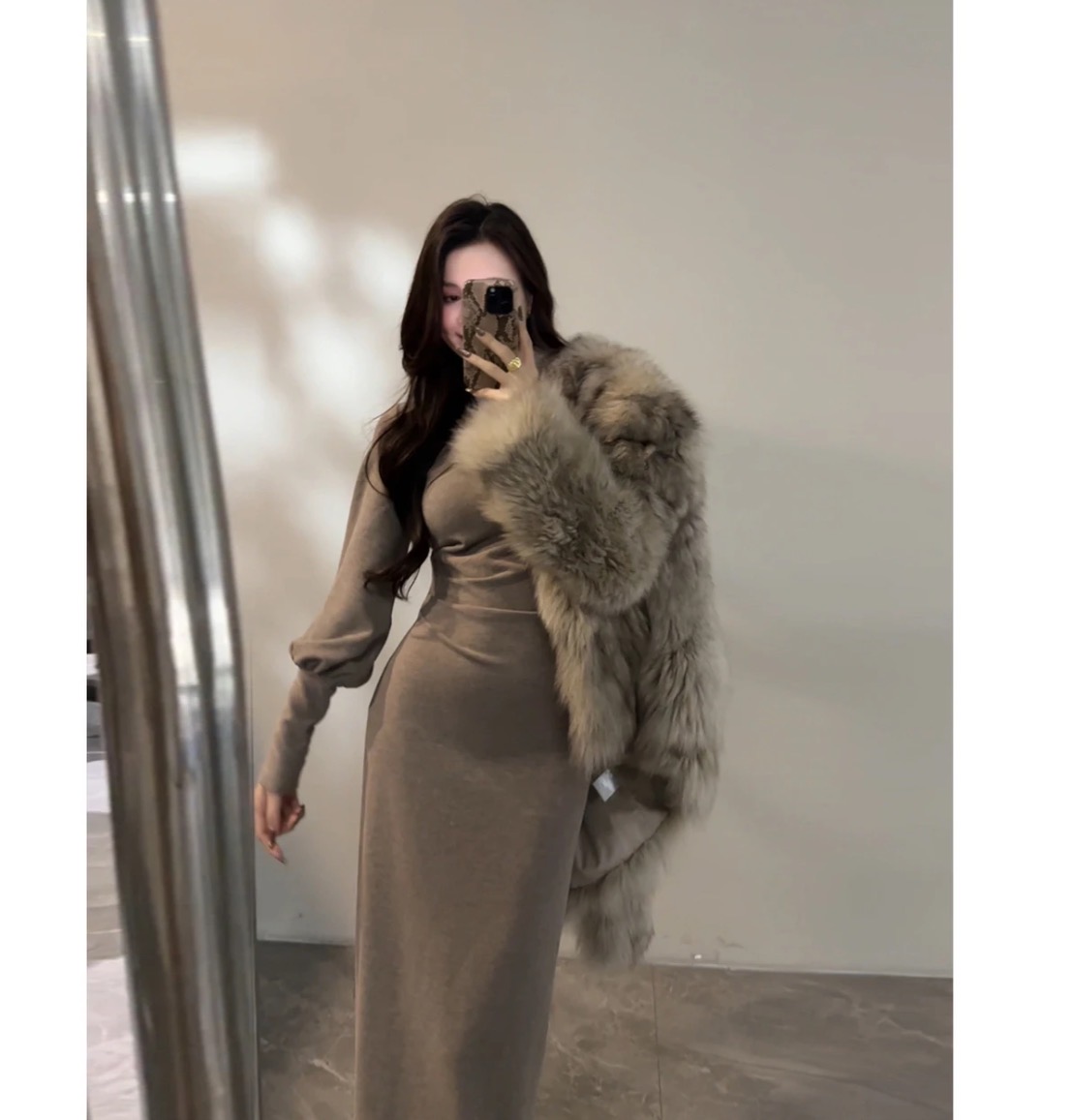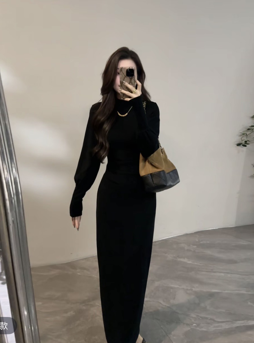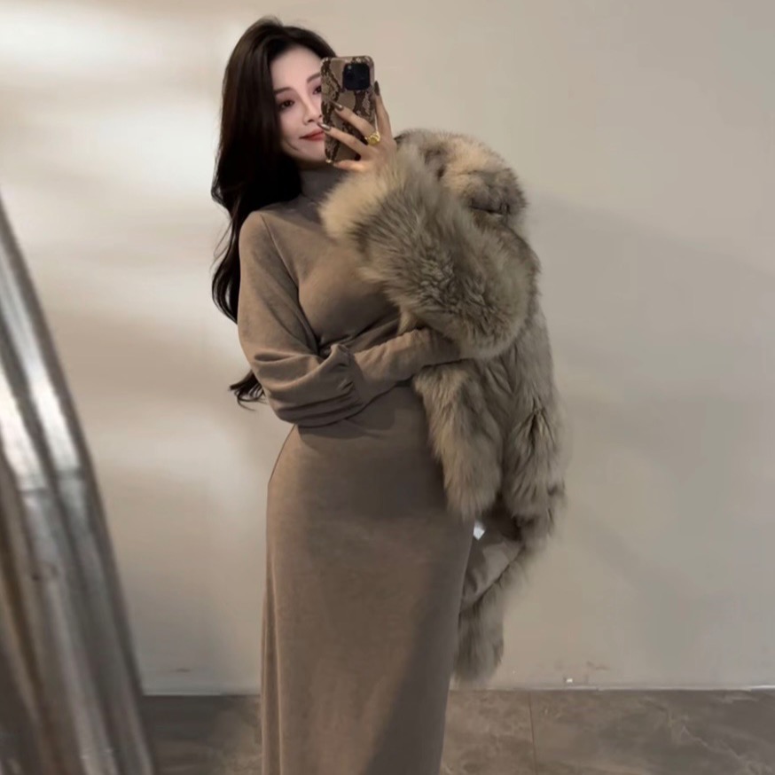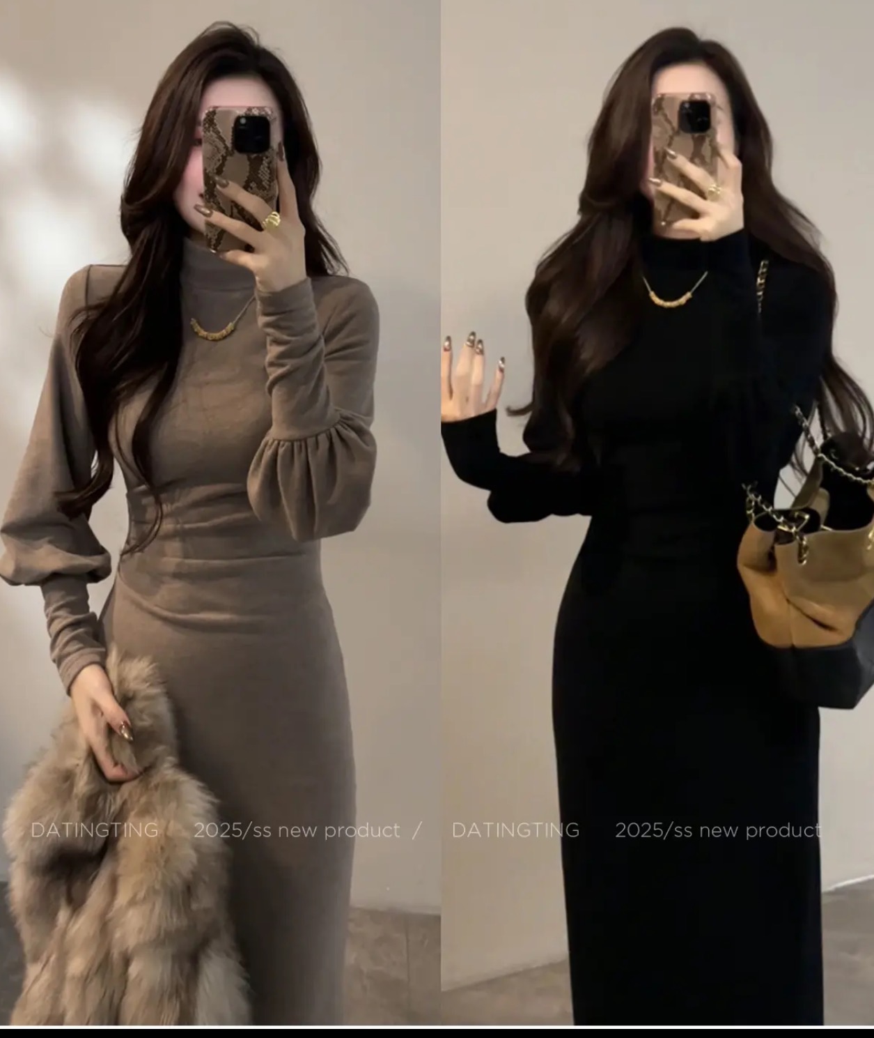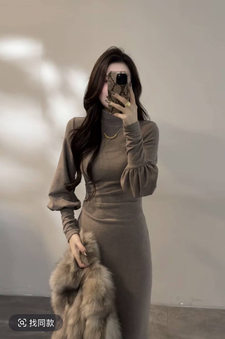 FA48770# 大婷婷冬季新款半高领灯笼袖连衣裙修身复古设计感气质 服裝批發女裝批發服飾貨源
