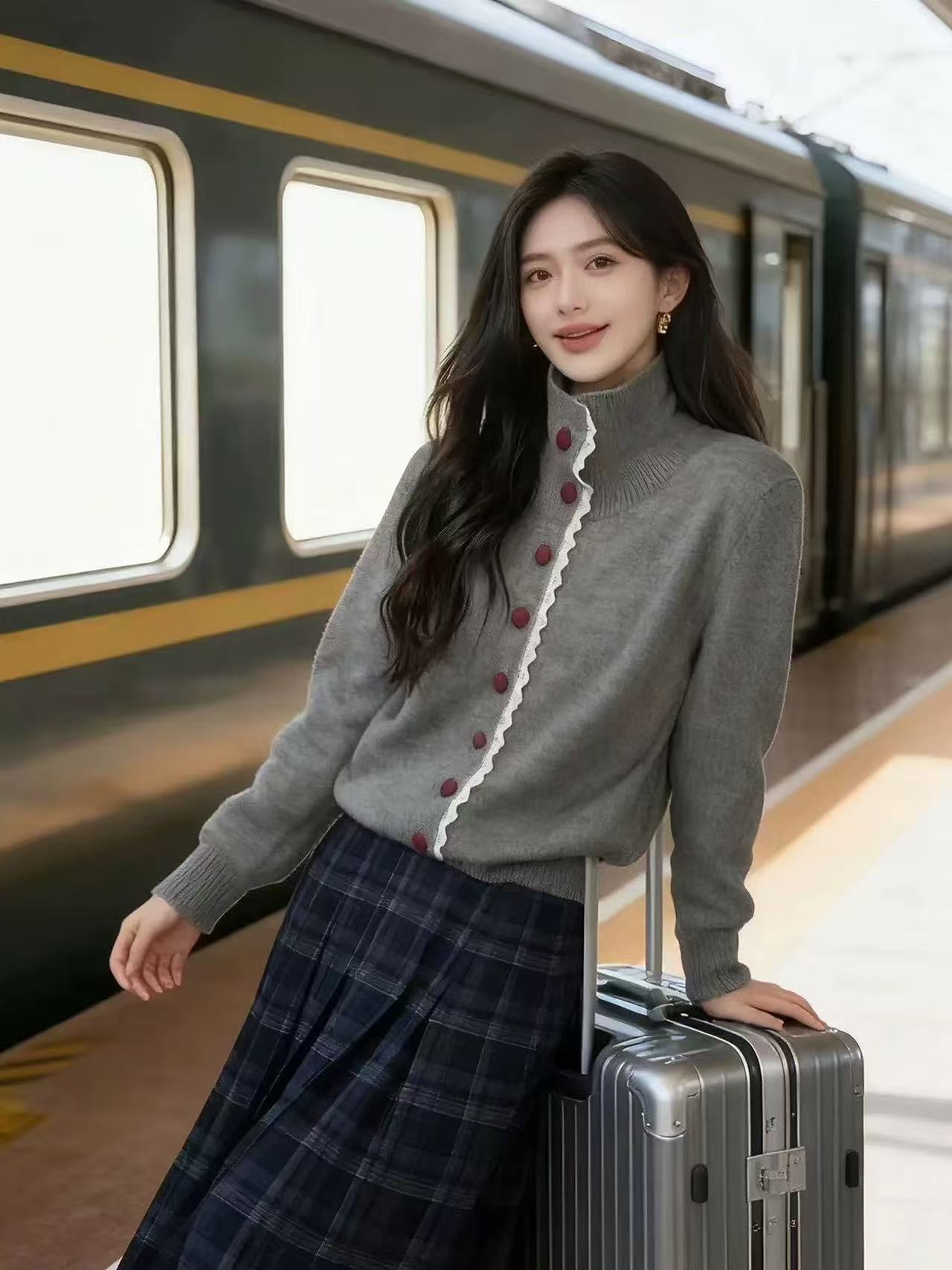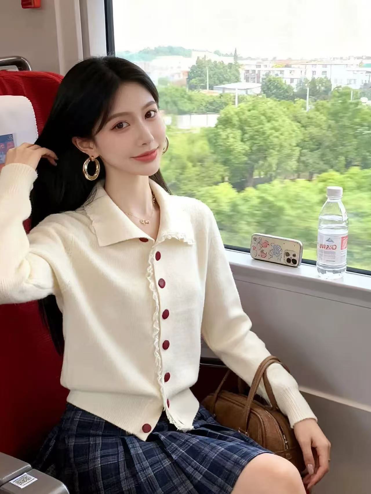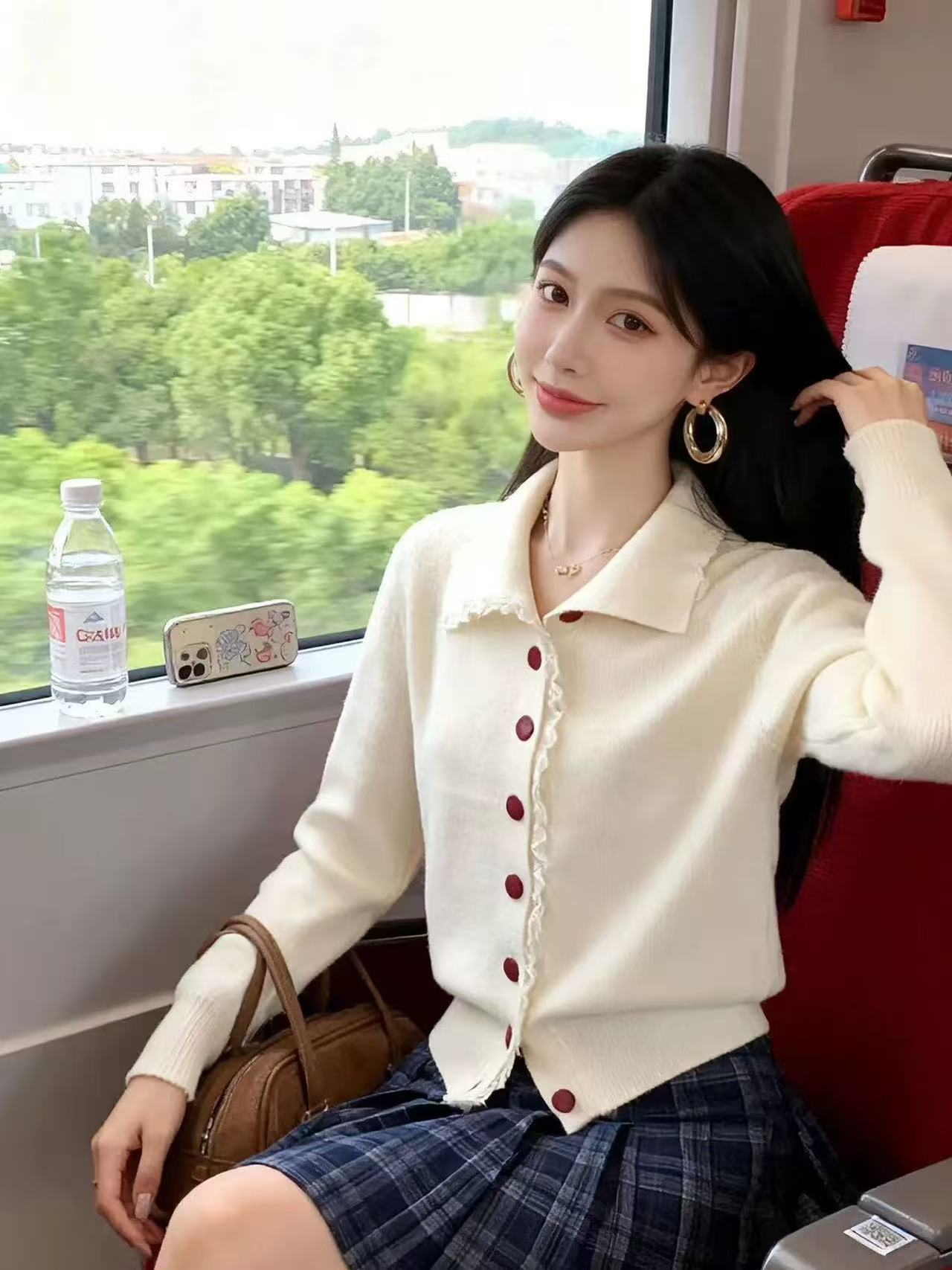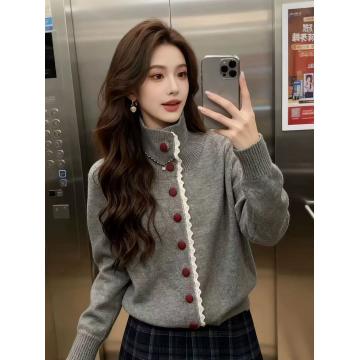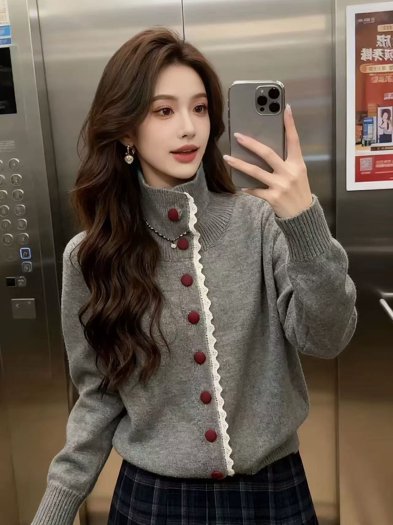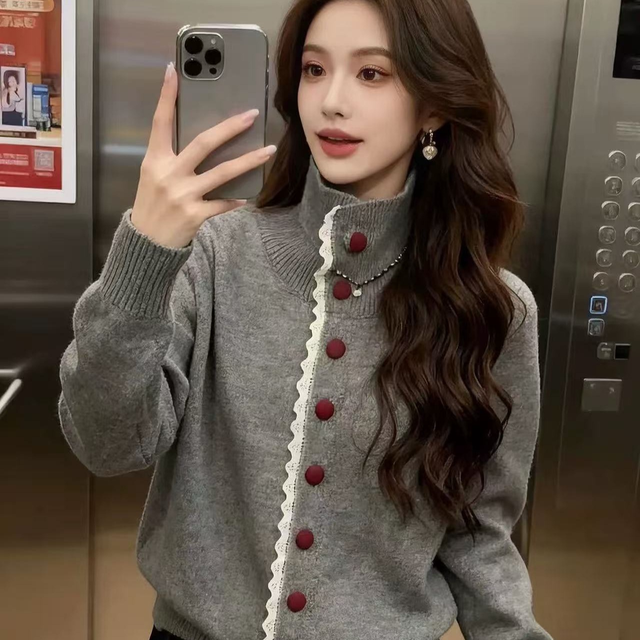 FA49005# 法式翻领蕾丝拼接毛衣女秋冬新款慵懒宽松显瘦百搭外穿针织上衣潮 服裝批發女裝批發服飾貨源