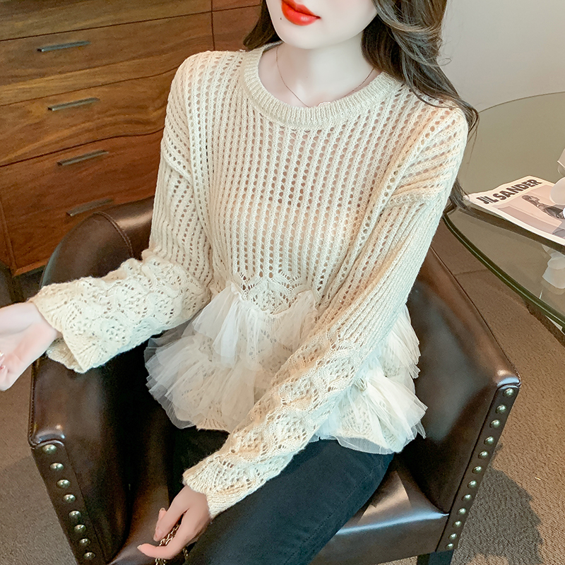 FA49217# 秋冬新款镂空针织衫女法式网纱拼接荷叶边温柔慵懒风长袖 服裝批發女裝批發服飾貨源
