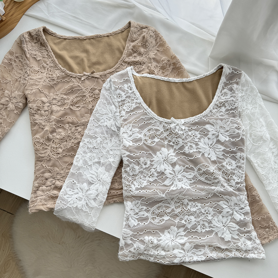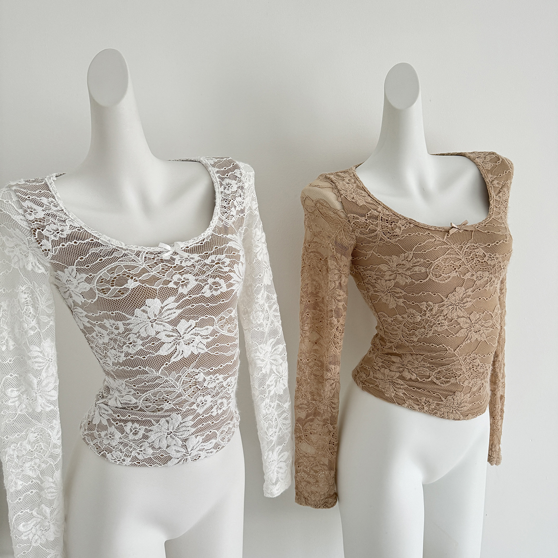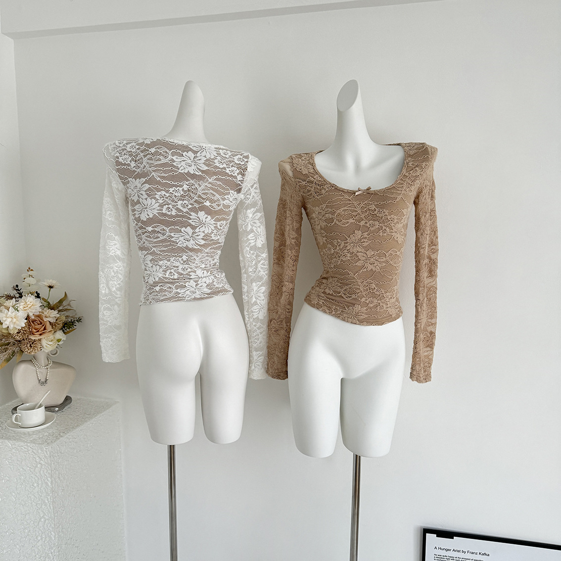 FA50556# Hotdog热狗很辣缪斯如梦精致气质蕾丝蝴蝶结短款长袖U领上衣 服裝批發女裝批發服飾貨源