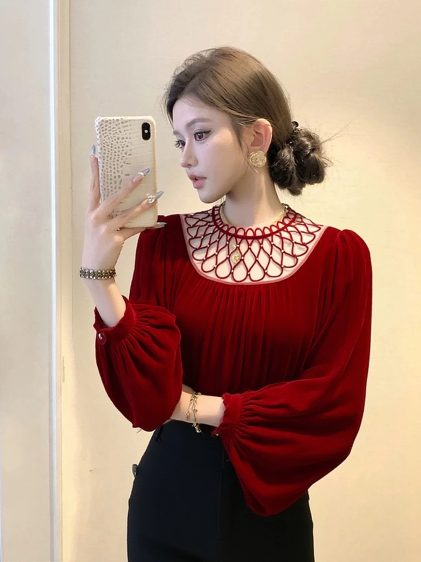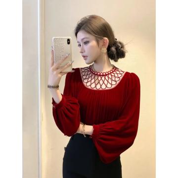 FA50784# 过年红色镂空丝绒衬衫女冬季轻奢高端减龄洋气独特超好看法式上衣 服裝批發女裝批發服飾貨源