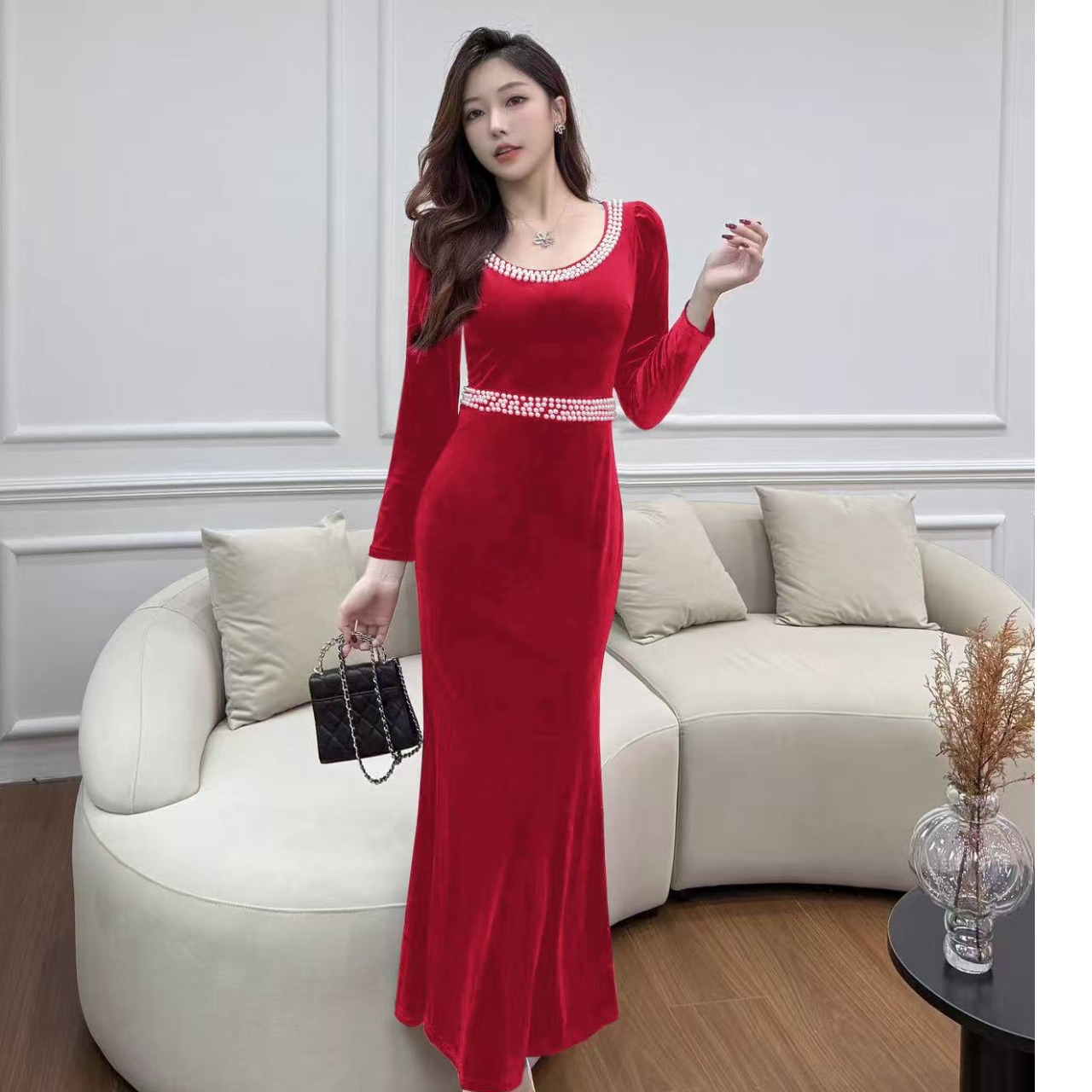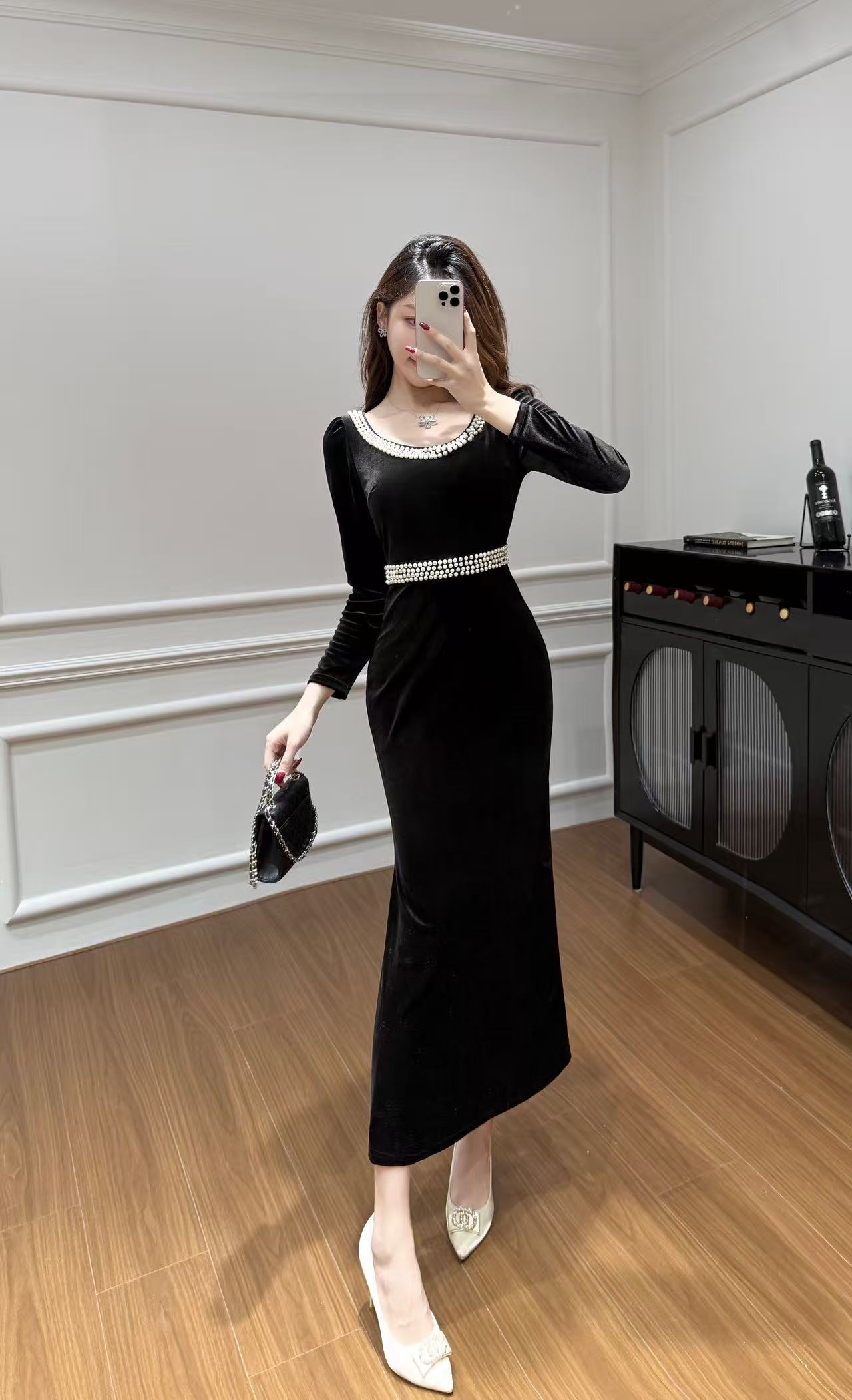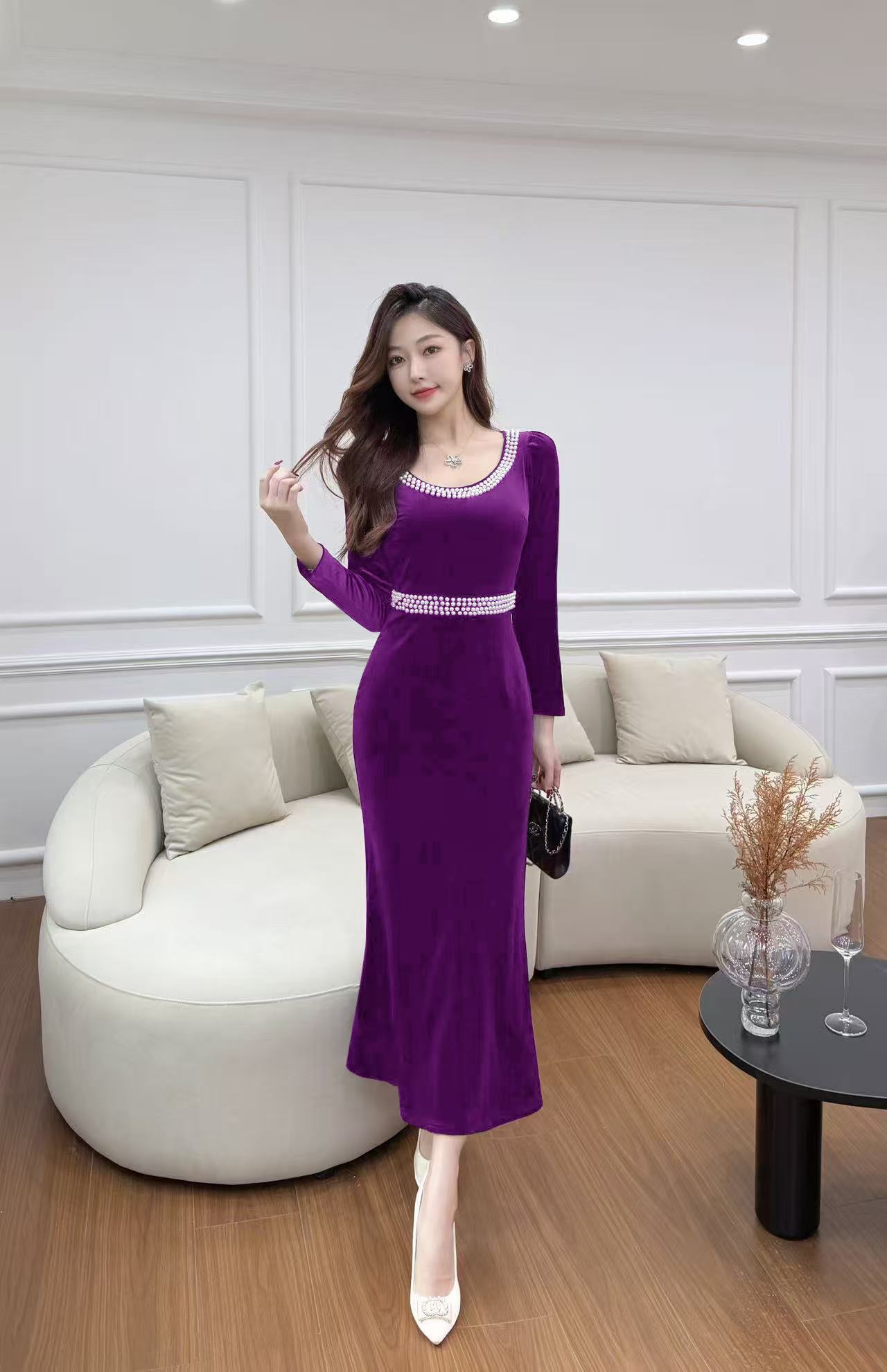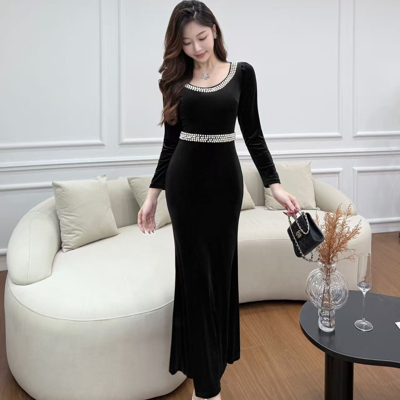 FA50789# 秋冬新款法式方领修身显瘦气质长袖丝绒连衣裙名媛宴会晚礼服 服裝批發女裝批發服飾貨源