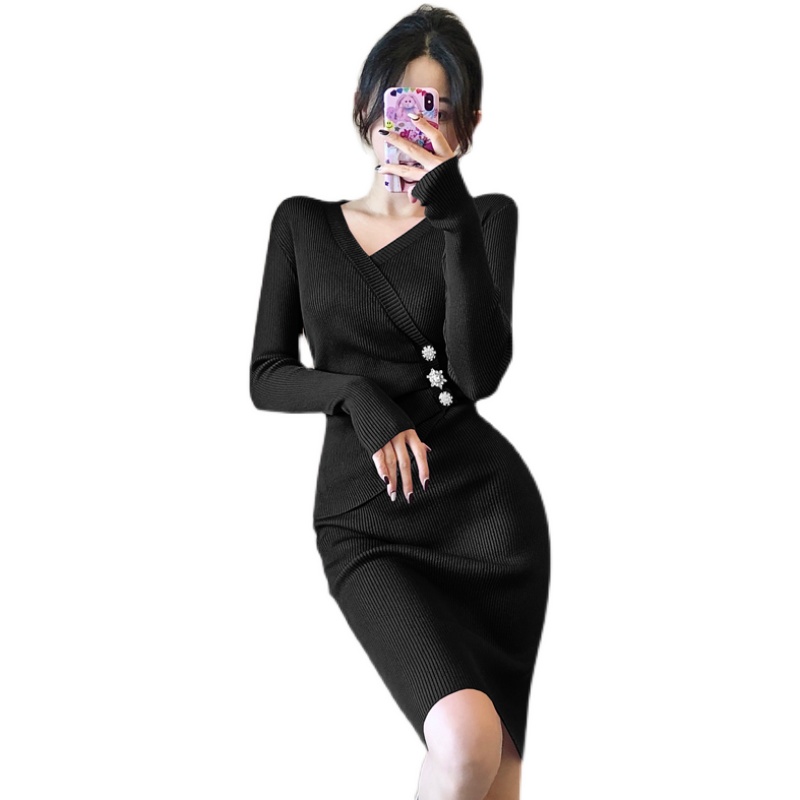 FA50791# 格格家气质法式名媛御姐风性感深V高腰显瘦侧边钻扣针织连衣裙 服裝批發女裝批發服飾貨源