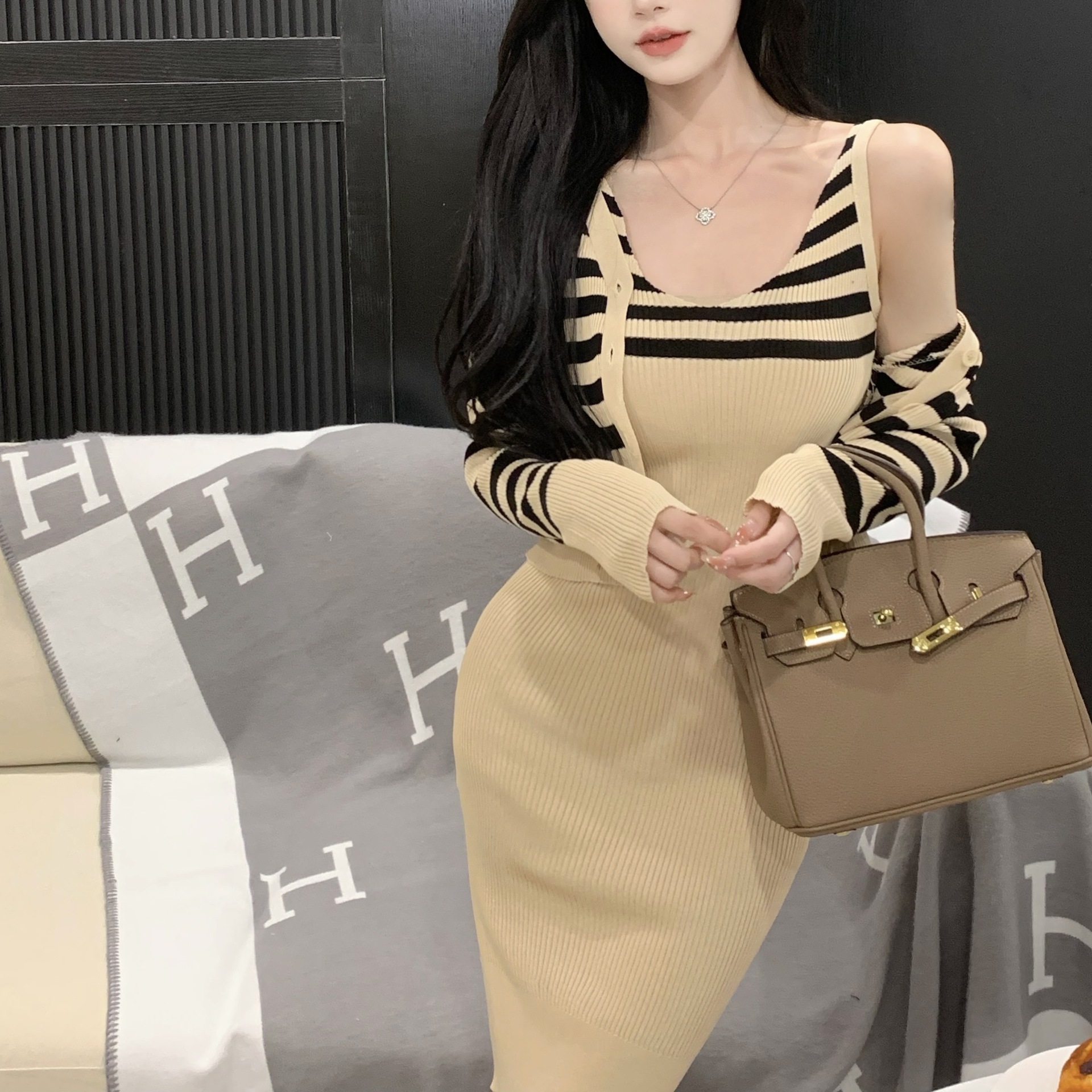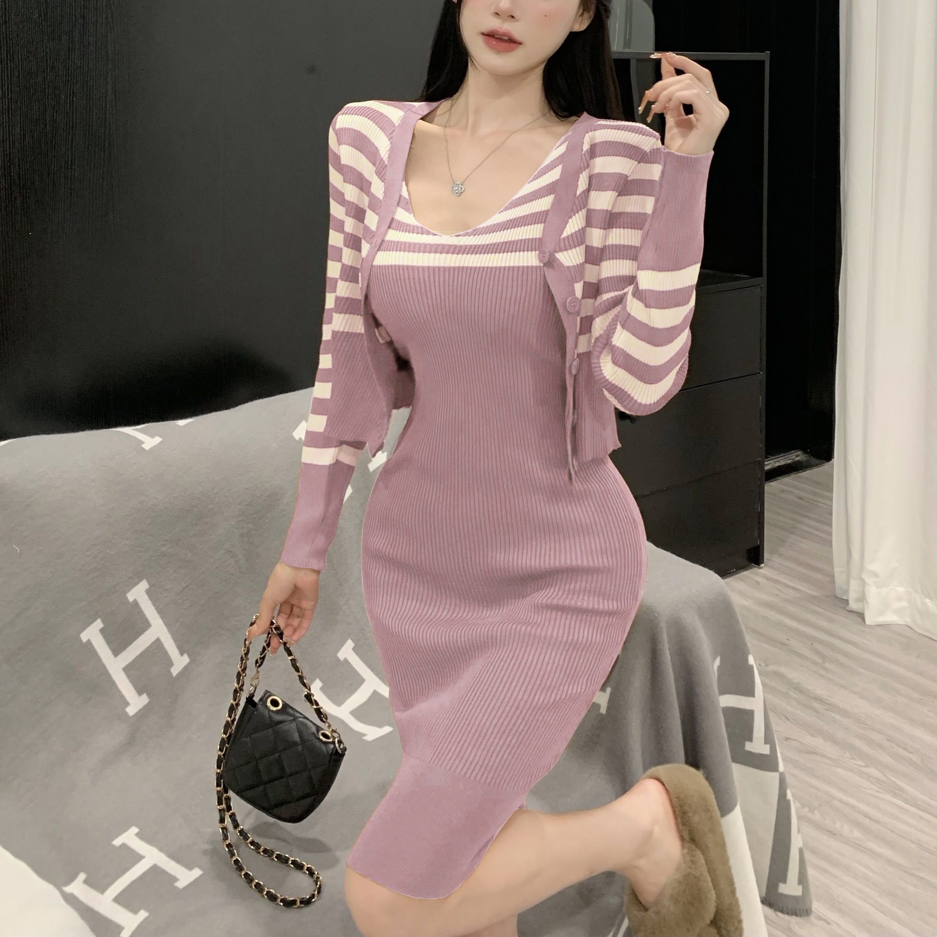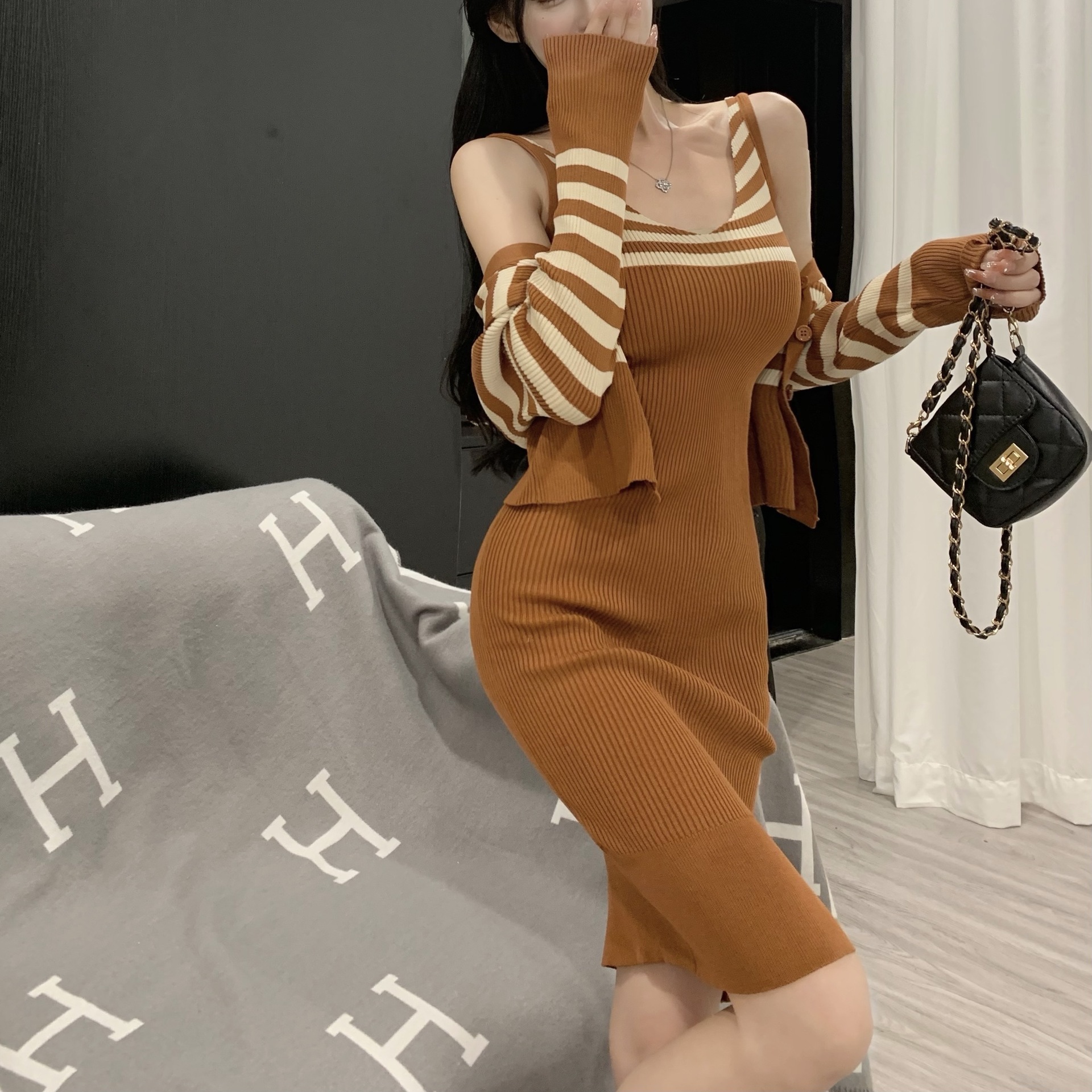 FA50792# 高级感秋冬新款性感辣妹条纹双v领针织连衣裙配长袖气质开衫套装 服裝批發女裝批發服飾貨源