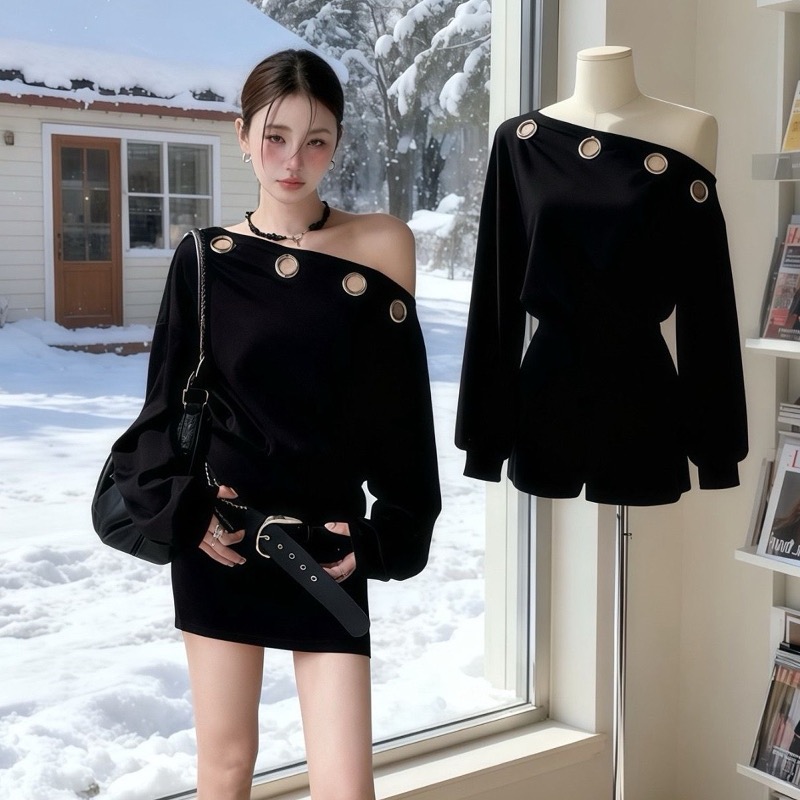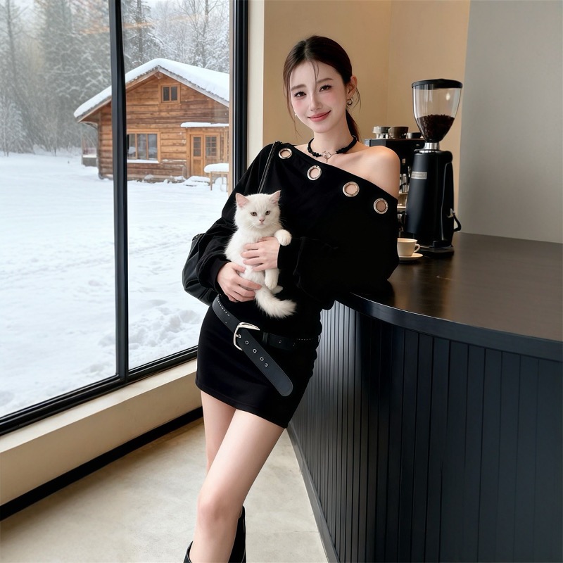 FA50799# 美式辣妹性感斜肩黑色长袖连衣裙女秋冬设计感收腰显瘦包臀短裙子 服裝批發女裝批發服飾貨源