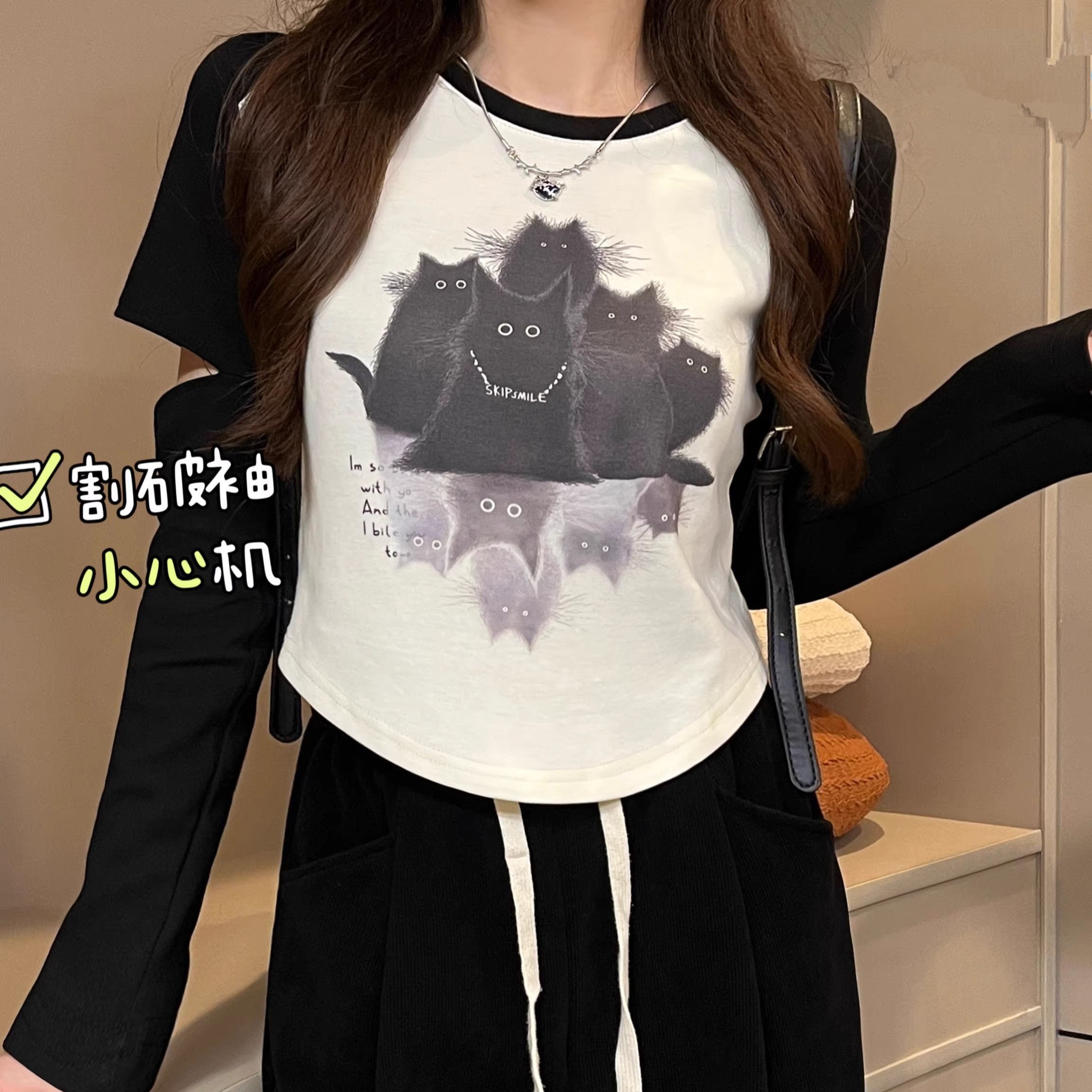 FA50834# 纯棉罗纹设计撞色插肩割破长袖T恤 服裝批發女裝批發服飾貨源