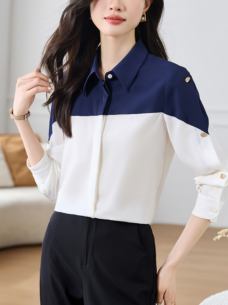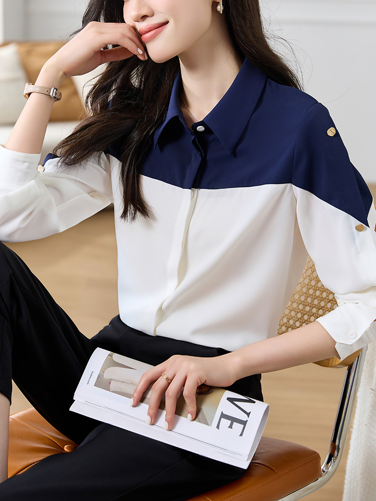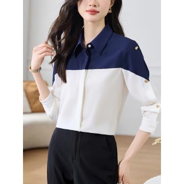 FA50837# 时尚Polo领衬衫女春装新款撞色简约百搭显瘦拼接雪纺 服裝批發女裝批發服飾貨源