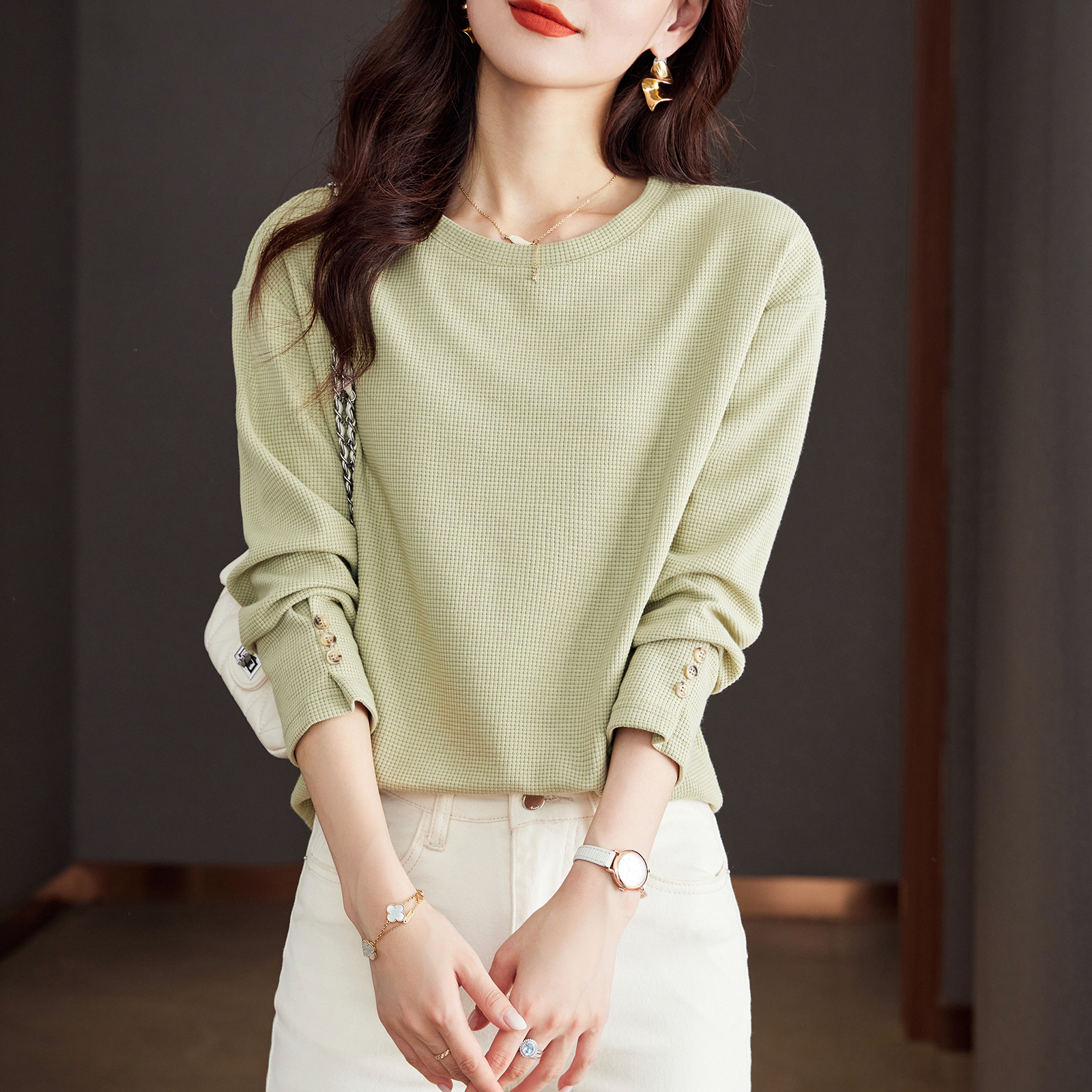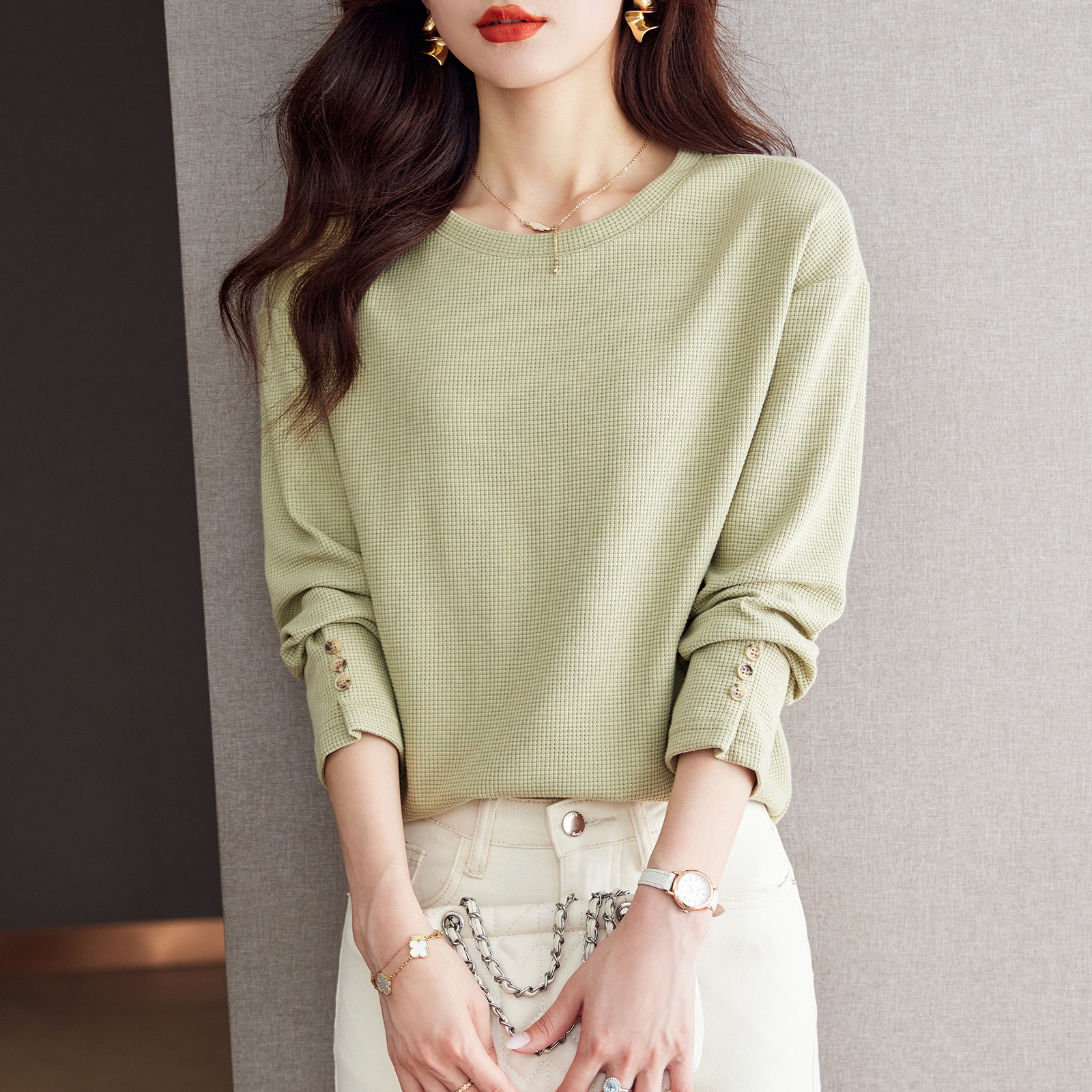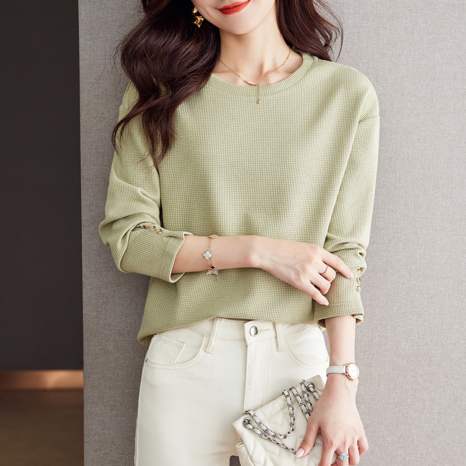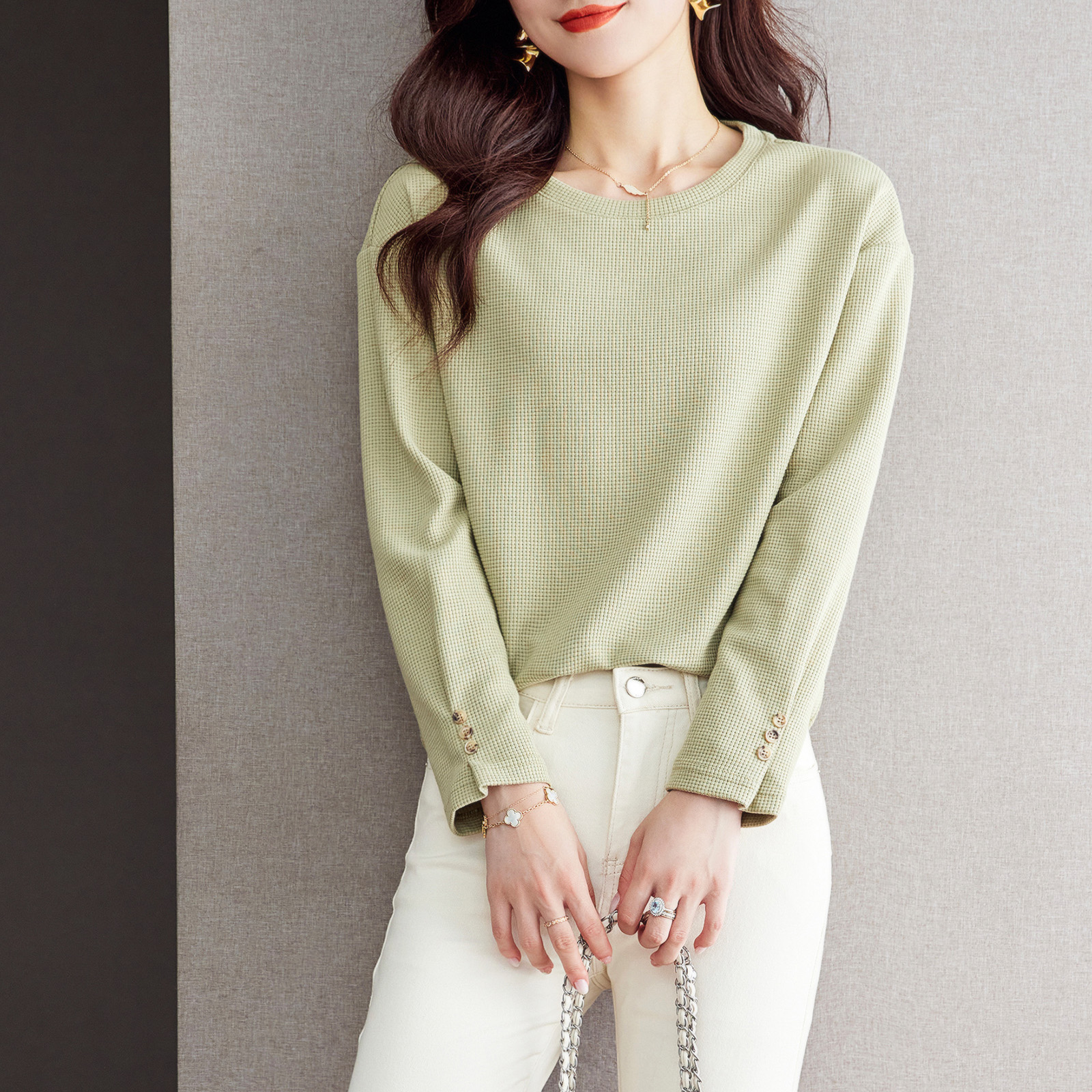 FA50839# 通勤简约休闲螺纹卫衣女春款宽松长袖百搭气质上衣 服裝批發女裝批發服飾貨源