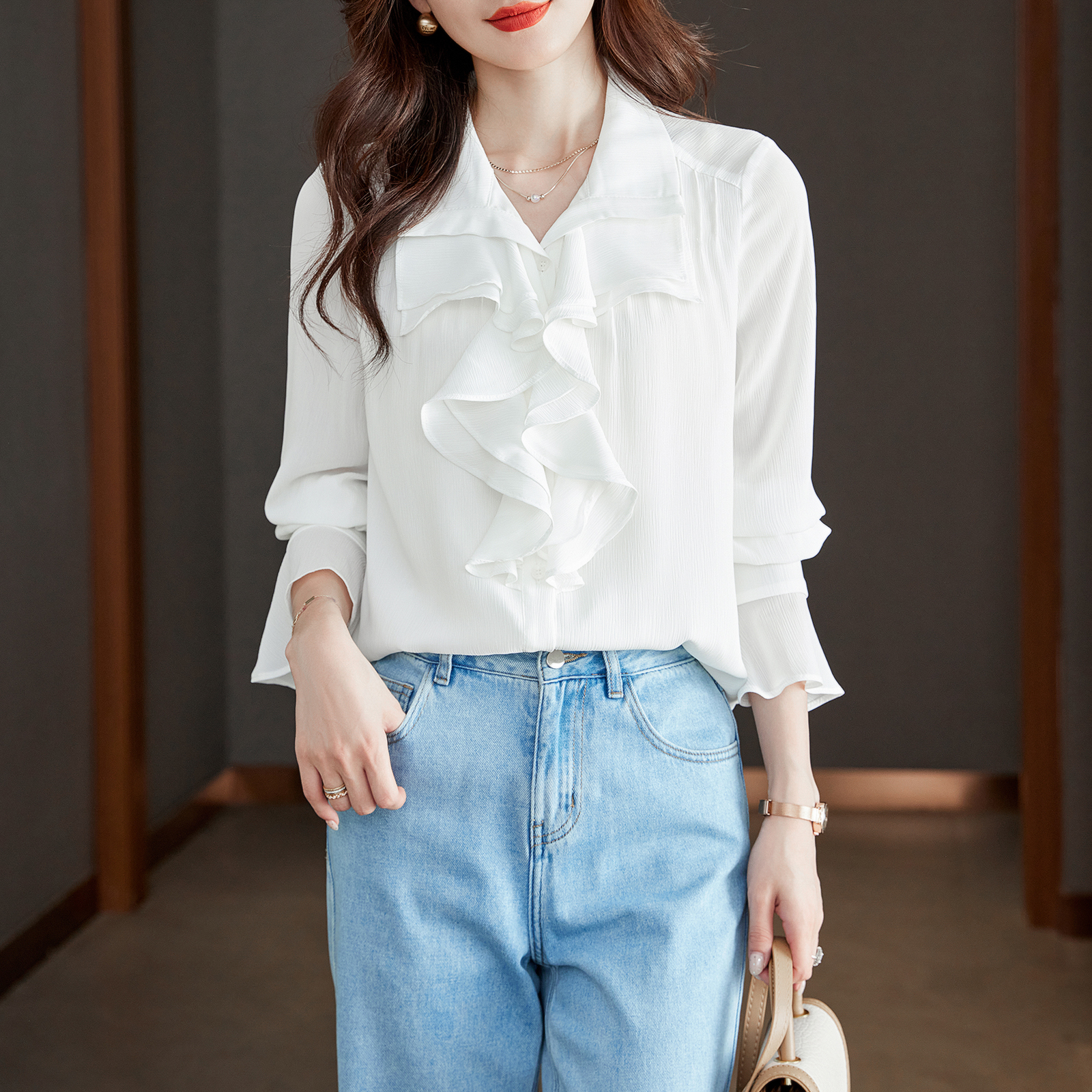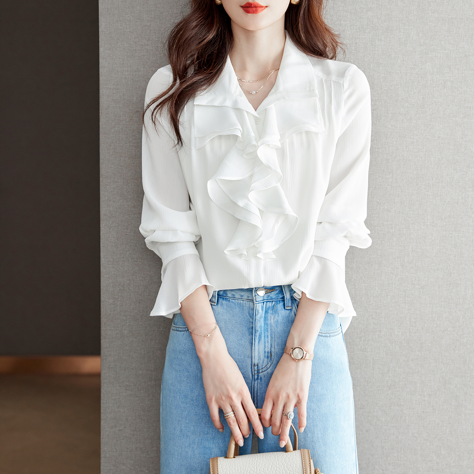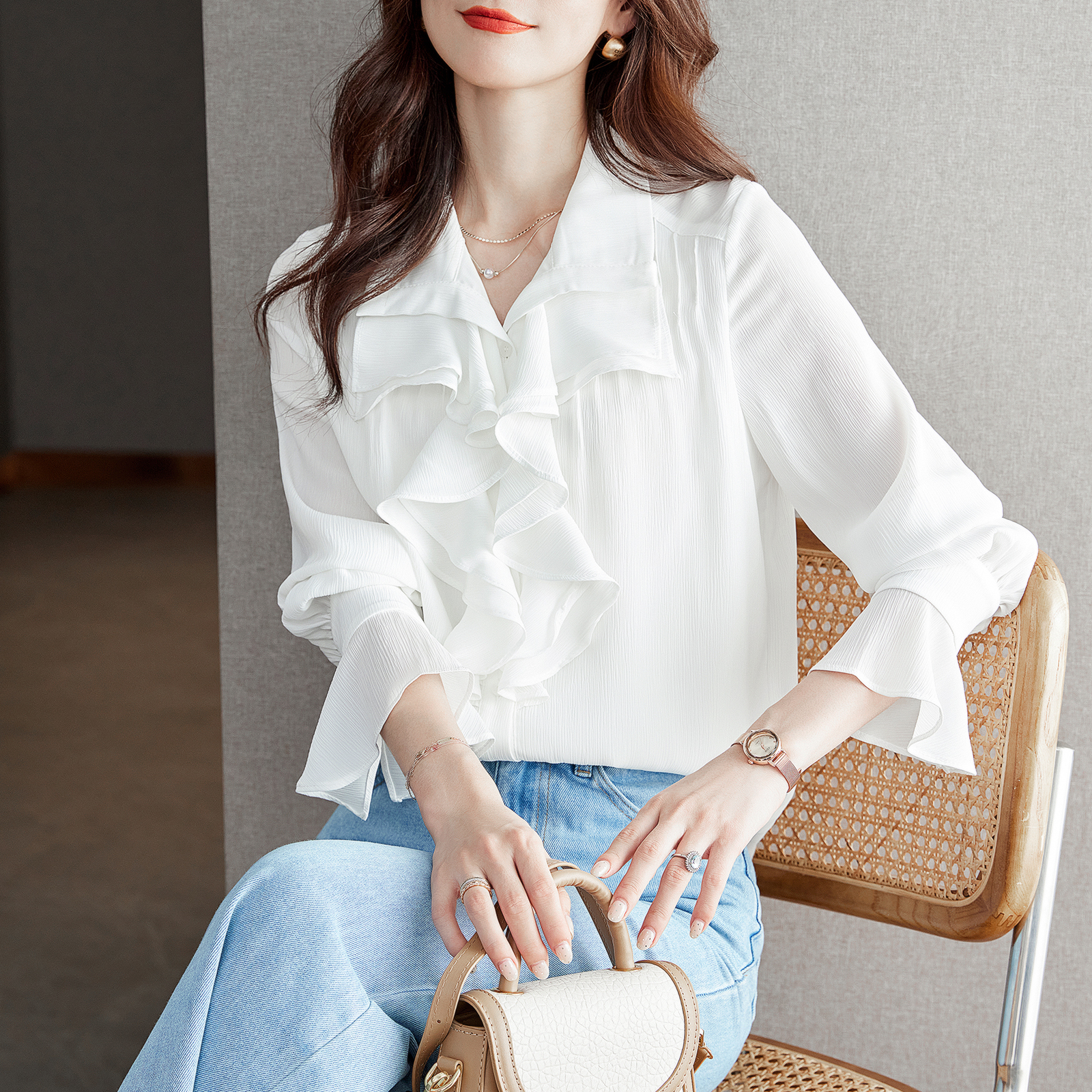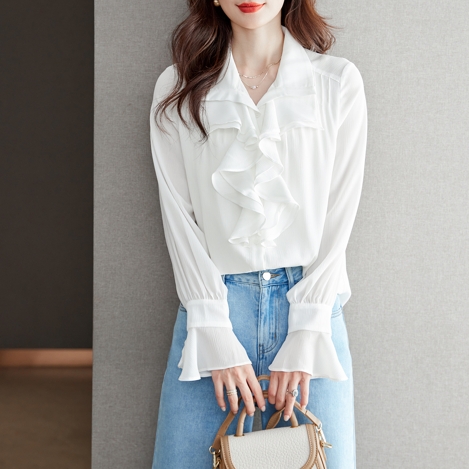 FA50841# V领白色雪纺衫女春款复古宫廷风韩国欧货荷叶边衬衣 服裝批發女裝批發服飾貨源