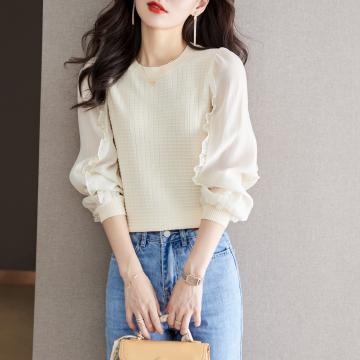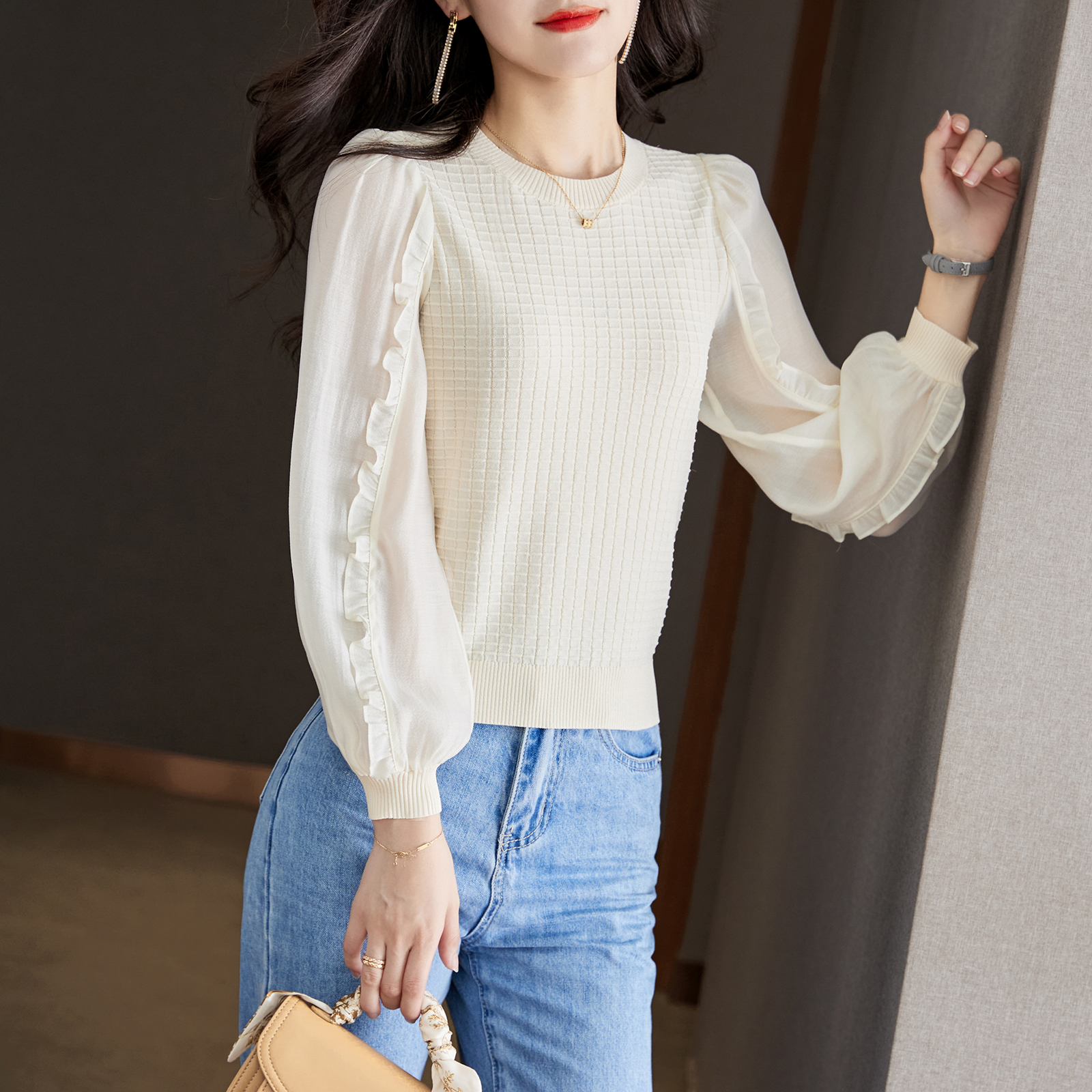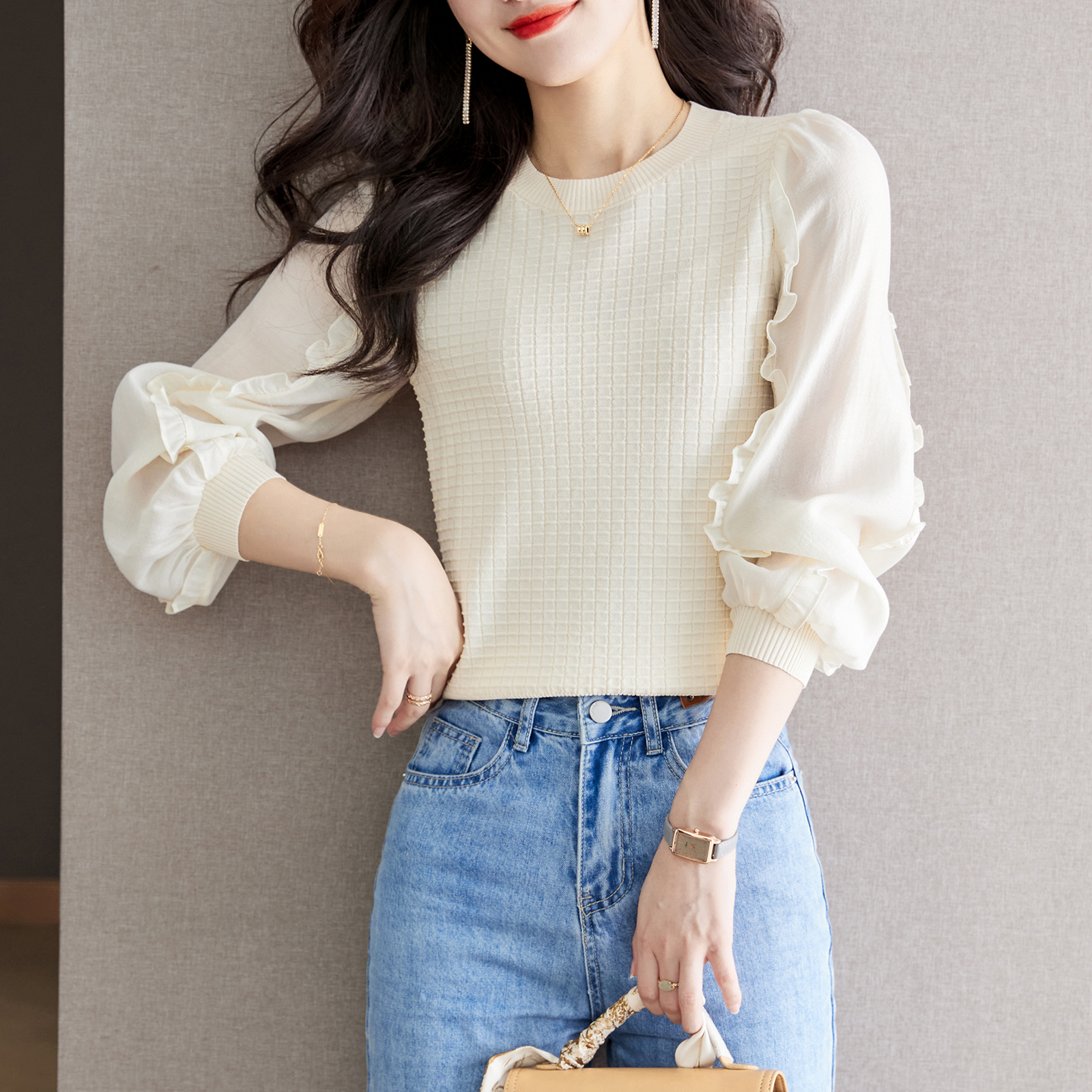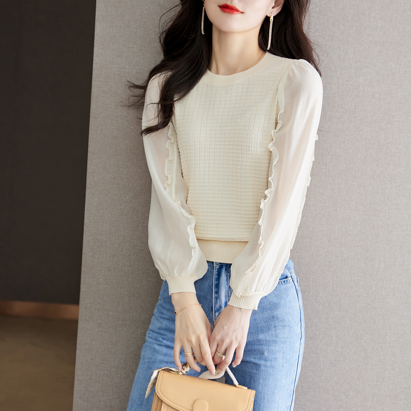 FA50842# 韩系拼接长袖针织衫女春款修身显瘦荷叶边别致上衣 服裝批發女裝批發服飾貨源