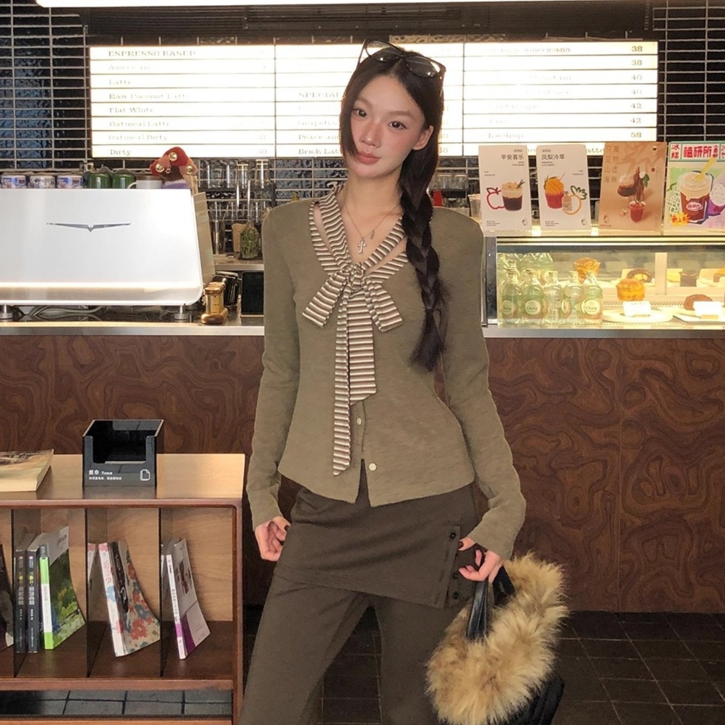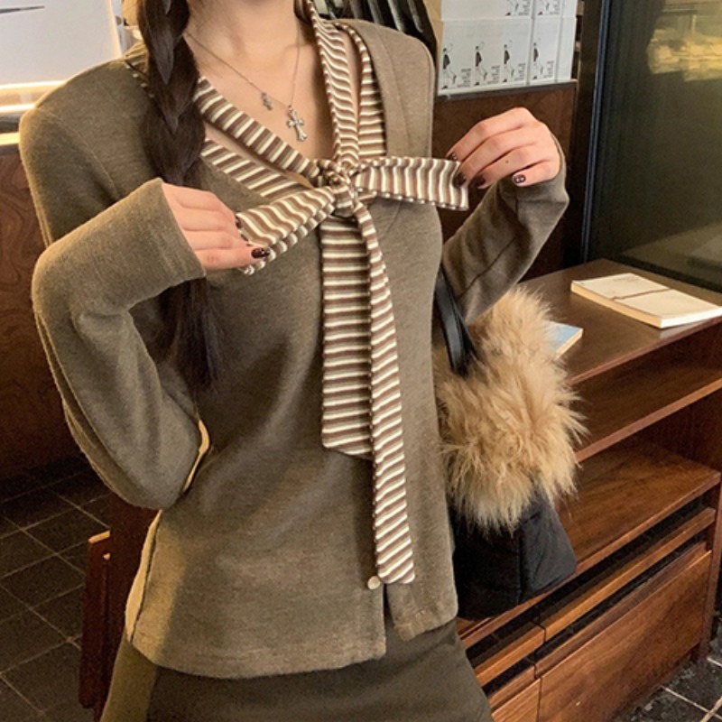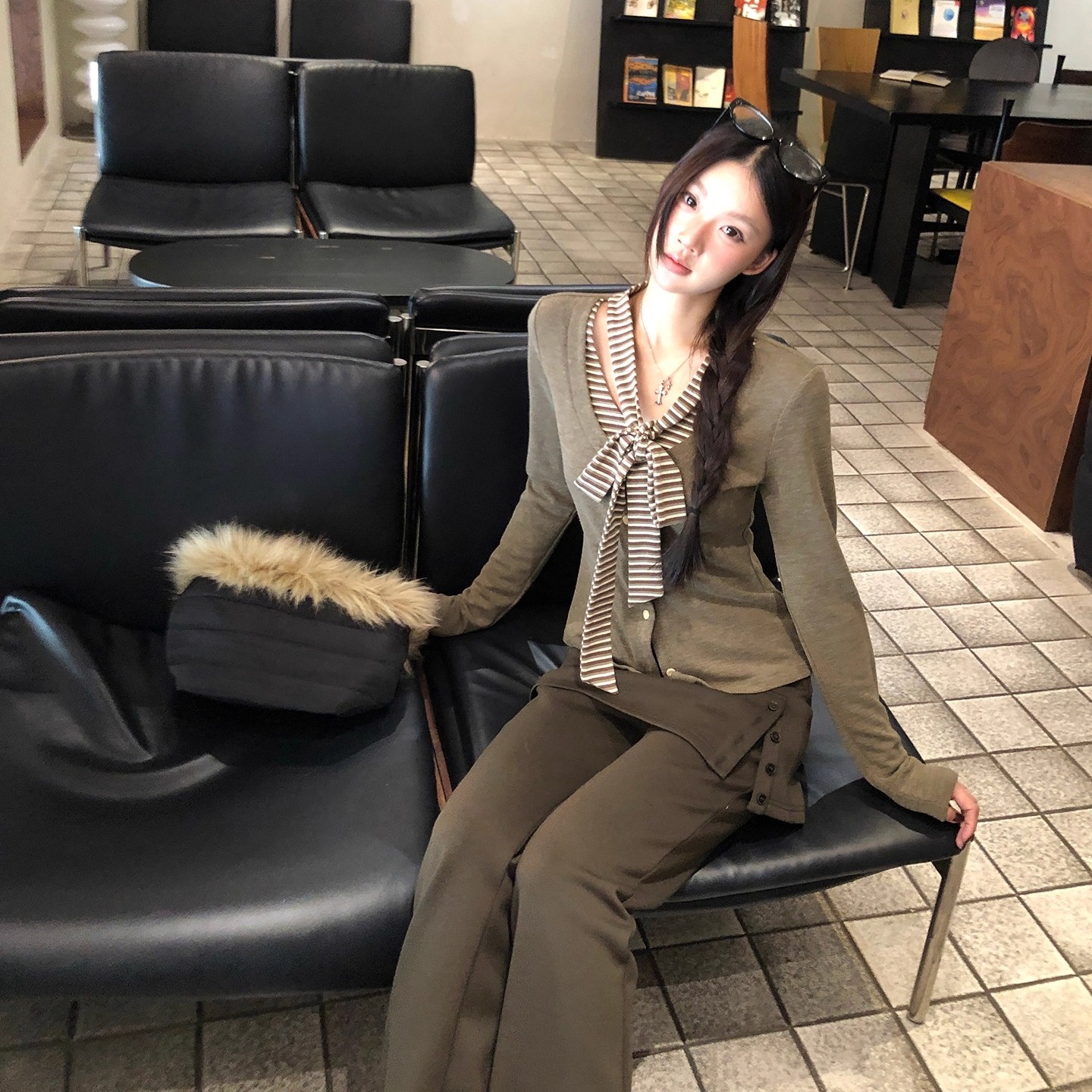 FA50847# 原版布灰色蝴蝶结假两件长袖t恤女秋冬季设计感修身内搭 服裝批發女裝批發服飾貨源