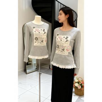 FA50849# 德绒料温柔风灰色蕾丝花边拼接圆领贴布长袖t恤秋季百搭上衣 服裝批發女裝批發服飾貨源