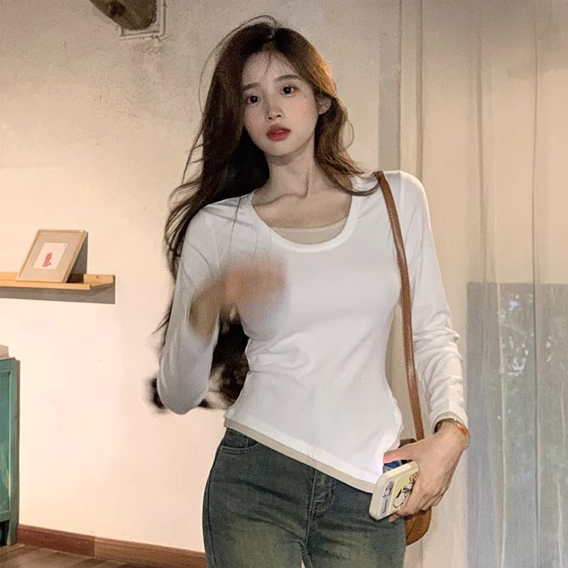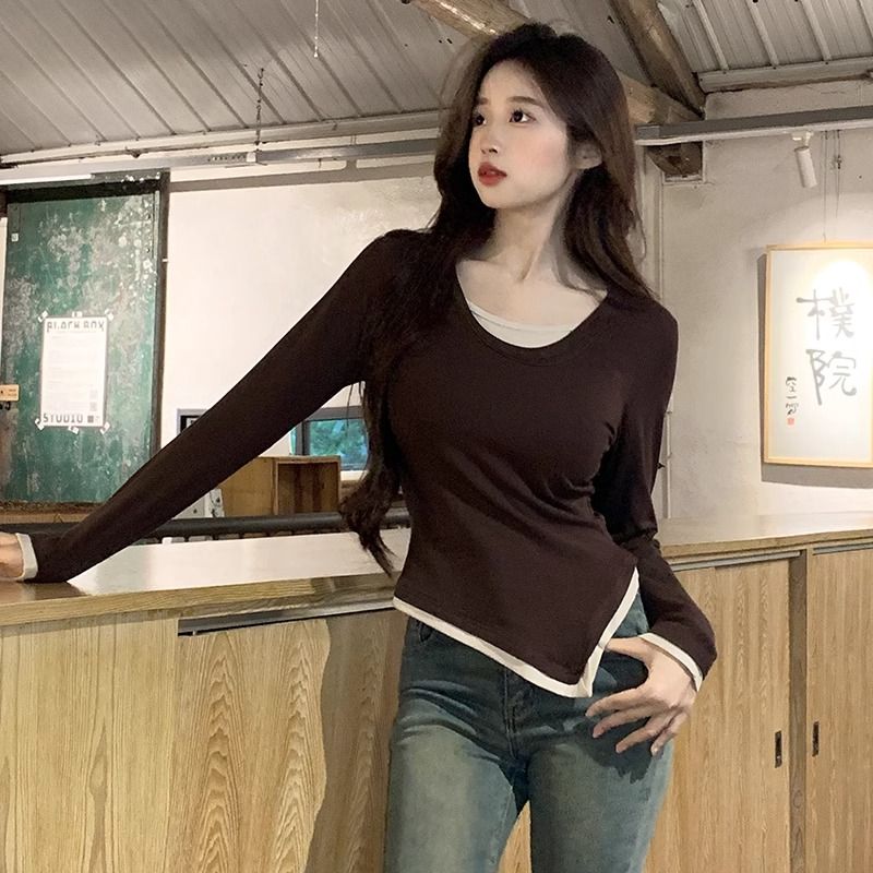 FA50850# 假两件长袖t恤女秋季新款不规则设计感内搭修身打底衫上衣服ins潮 服裝批發女裝批發服飾貨源