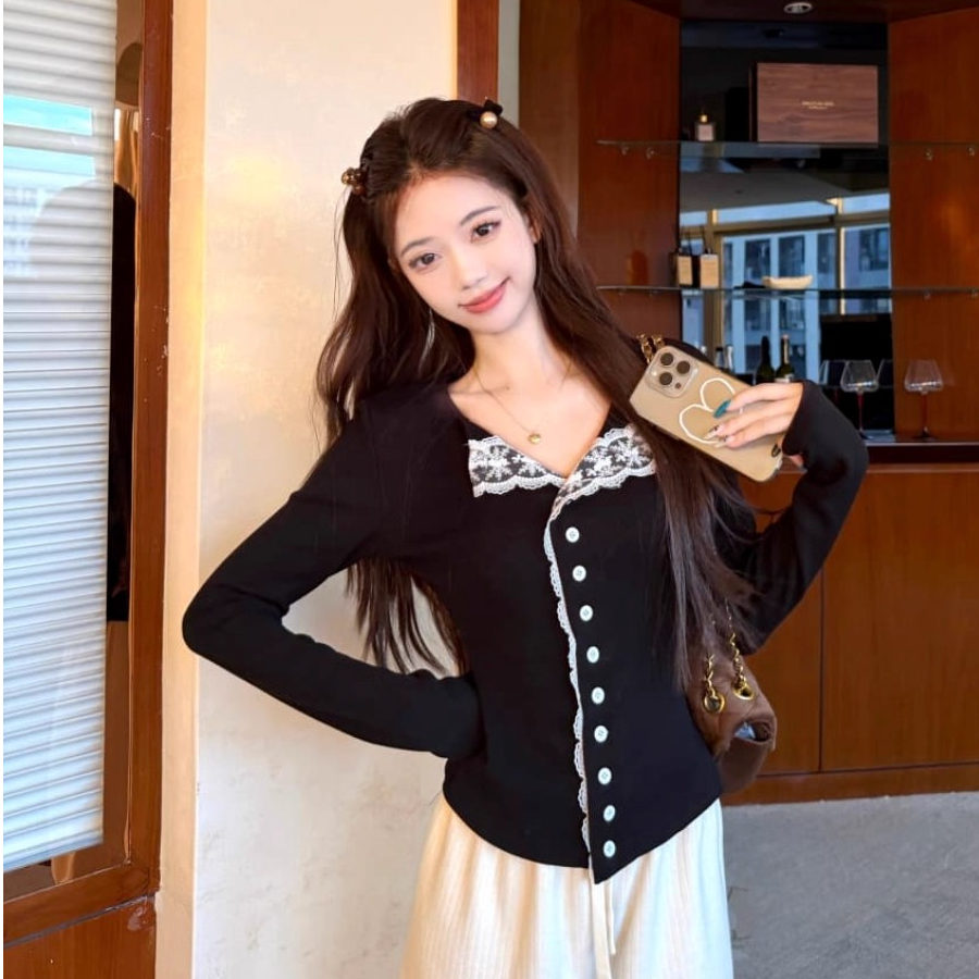 FA50902# 蕾丝拼接长袖T恤女冬季新款设计感黑色V领纽扣打底衫上衣 服裝批發女裝批發服飾貨源
